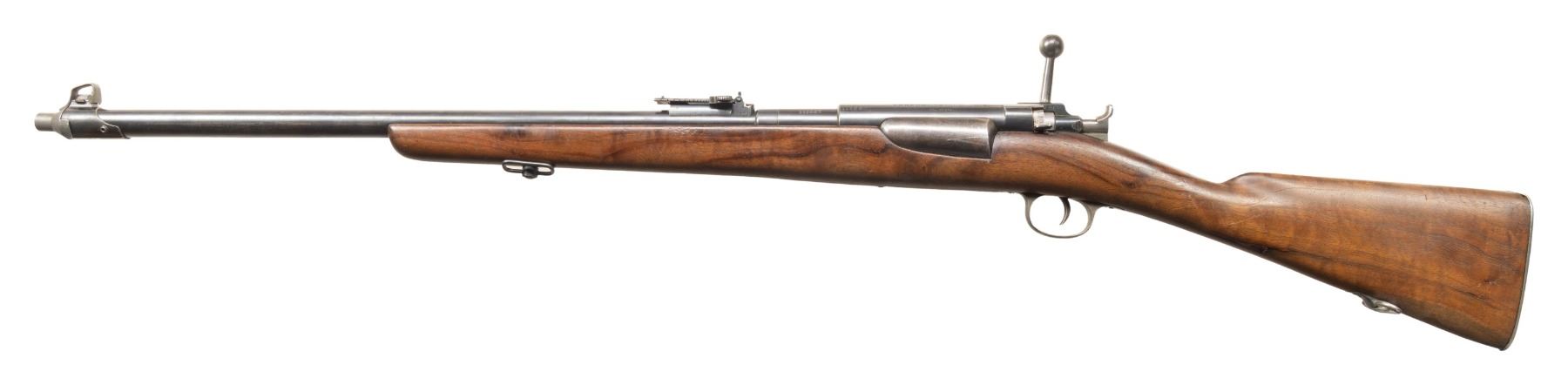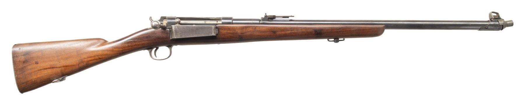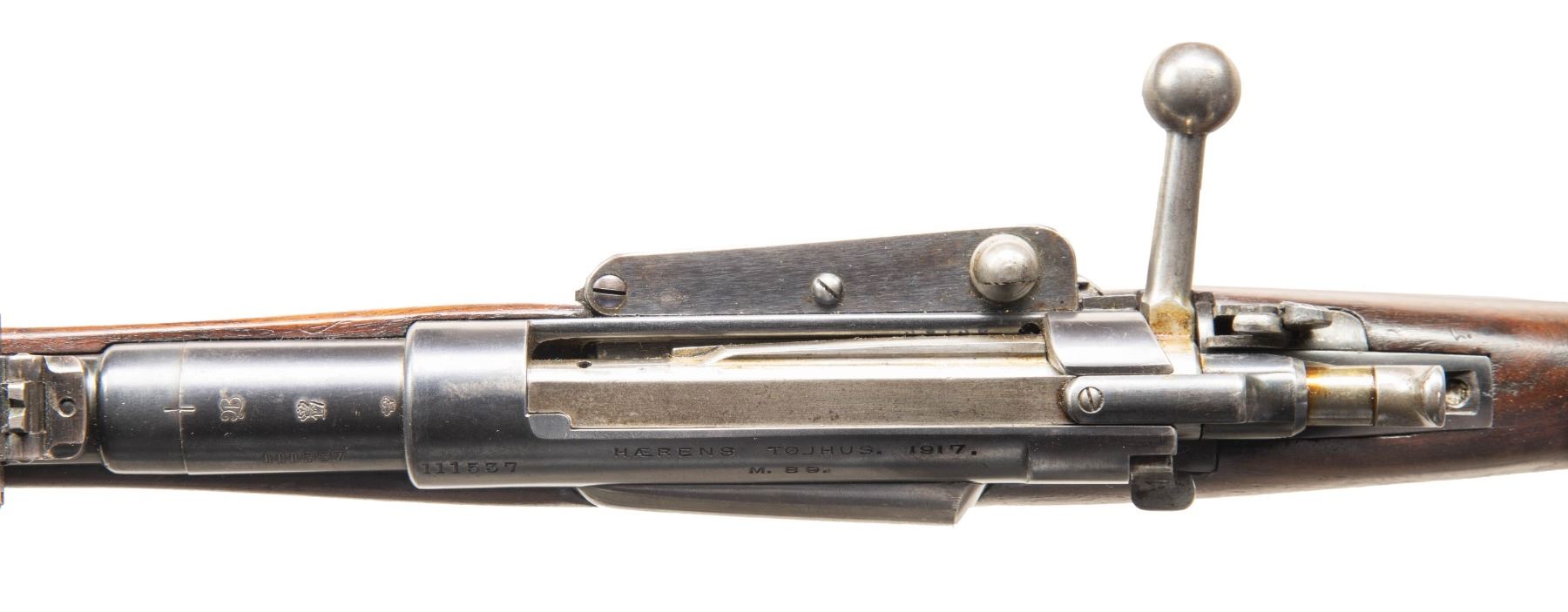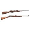 2) Sporterized Danish Krag M89 Rifle. Cal. 8x58R. S# 111537. Bbl. 24" with ground off bayonet lug. Blade front sight. Ladder rear sight graduated to 2400m. Matching numbers on receiver, bbl., & mag box. Mismatched straight handled bolt. 1917 dated Danish Krag rifle. Arsenal rework type blue finish. Cutdown walnut stock set with bottom mounted sling swivels. UNATTACHED ACCESSORIES: gray muzzle cover. CONDITION: refinished stock set shows a couple small plug repairs, a few light chips a tiny crack ahead of buttplate tang, some dings & handling marks. Metal retains 80% arsenal rework type blue with scattered edge wear, light oxidation, some dings, fading & scratches. Action functions properly when hand cycled. Very good plus bright bore. PROVENANCE: From the PMRB Collection.(25-5951/MJC). MODERN. $400-800 for lot.