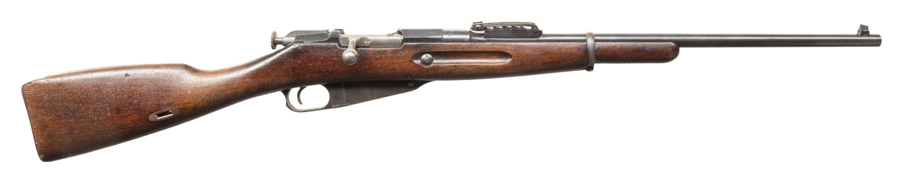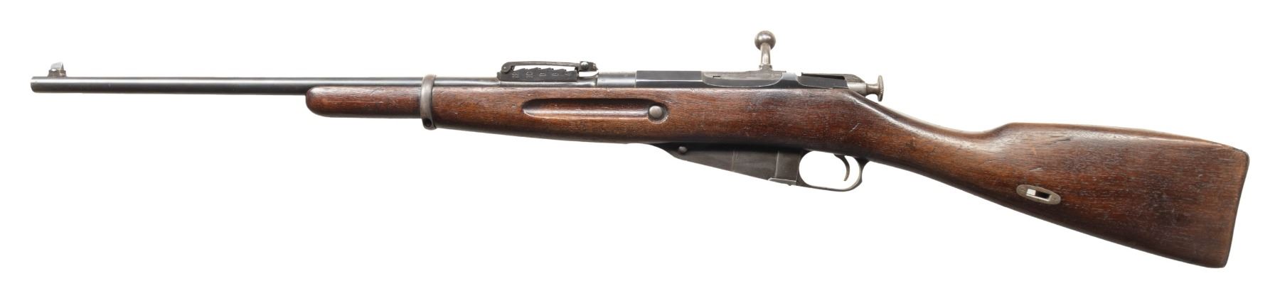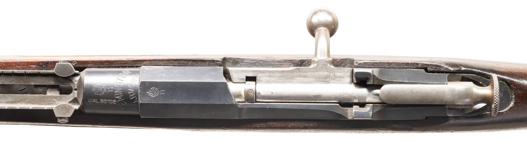 1) Remington-Bannerman Mosin Nagant Rifle. Cal. 30-06. NSN. Bbl. 22". Blade front sight. M91 Mosin rear sight. Remington M91 Mosin Nagant cutdown & converted to 30-06 by Bannerman. Parts have mixed numbers. Turned down bolt handle. Shortened walnut stock with US flaming bomb stamps on belly of forend & Russian roundel on right of butt. CONDITION: stock has older oil finish with some chipping at toe, a couple other chips, scattered finish loss, dings, handling marks & scratches. Metal retains 92% blue with scattered edge wear, handling marks, fading & light oxidation. Action functions properly when hand cycled. Bore shows some frosting but strong rifling. (25-5888/MJC). CURIO.