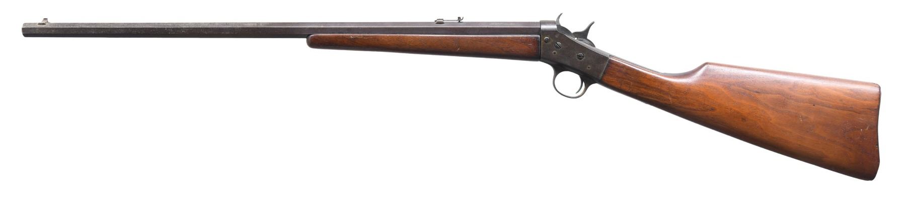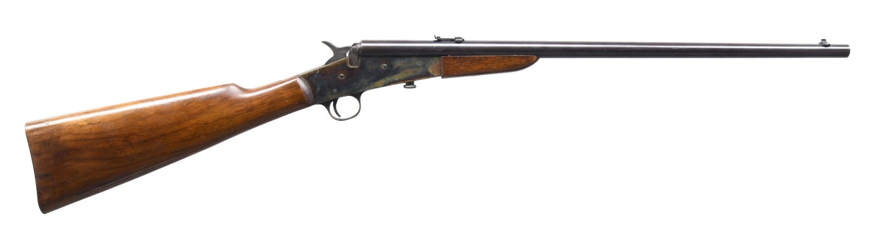 This lot consists of the following Remington rimfire rifles: 1) REMINGTON NO4. FALLING BLOCK RIFLE. Cal. 22 S & L. S# J280127. Bbl. 22 1/2" oct. Blade front sight. Sporting style rear sight. Smooth hardwood stock set. CONDITION: stock set is loose with added finish with tiny crack behind upper tang & scattered handling wear. Metal is a dull gray patina with scattered oxidation. Action is a bit sluggish but functional when hand cycled. Pitted poor bore. (24-7113/MJC). 2) REMINGTON MODEL 6 FALLING BLOCK RIFLE. Cal. 22 S, L, LR. S# 451639. Bbl. 20" rnd. Silver bead front sight. Sporting style rear sight. Case colored action. Blued bbl. Hardwood stock set. CONDITION: stock set has added varnish with scattered flaking & handling marks. Action retains most of its case colors with scattered varnish overrun, fading & light oxidation. Bbl. retains 50% blue with scattered edge wear, varnish overrun & light oxidation. Action functions properly when hand cycled. Very good bright bore. (24-7126/MJC). BOTH CURIO. $300-500 for pair.