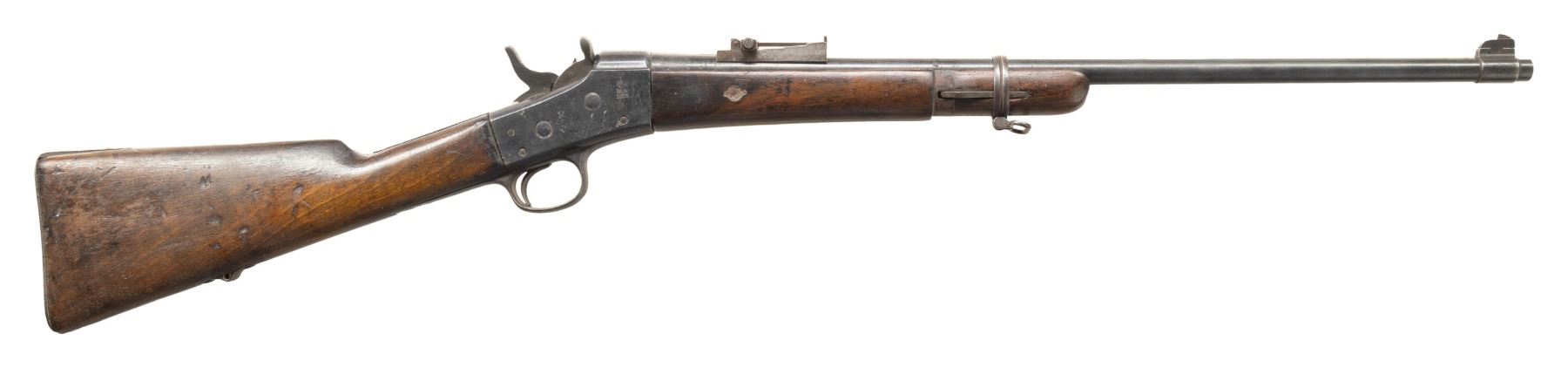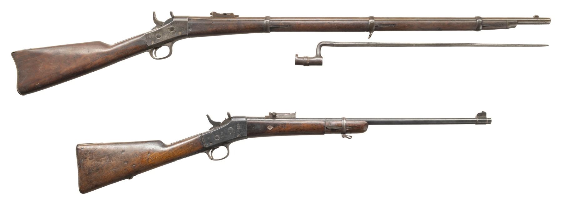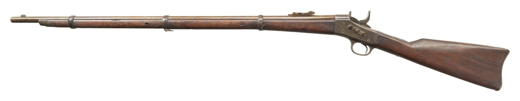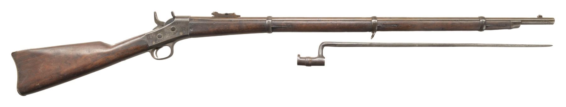 1) Remington Spanish Contract Rolling Block Rifle Cal. 43 Spanish. NSN. Bbl. 35". Blade front sight. Remington made Spanish Rolling Block that appears to be a third contract with March 1874 being last tang patent date. Bbl. has fleur d'lis & crown markings. Ladder rear sight. "US" marked buttplate. Walnut stock set with only front sling provisions. Butt & buttplate appear to be replaced. No ramrod present. UNATTACHED ACCESSORIES: Spanish socket bayonet without scabbard. CONDITION: stock set has old refinish appearance with some chipping, sanding marks, staining, handling marks & dings. Metal is an overall dull gray color possibly from old refinish with scattered pitting, oxidation, dings & handling wear. Action functions properly when hand cycled. Bore shows pitting along its length but evident rifling. (01-26708/MJC).