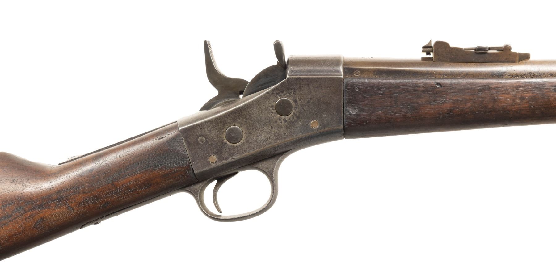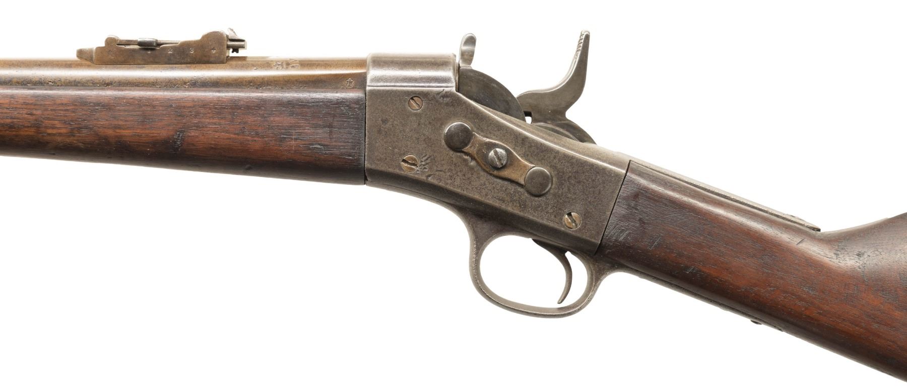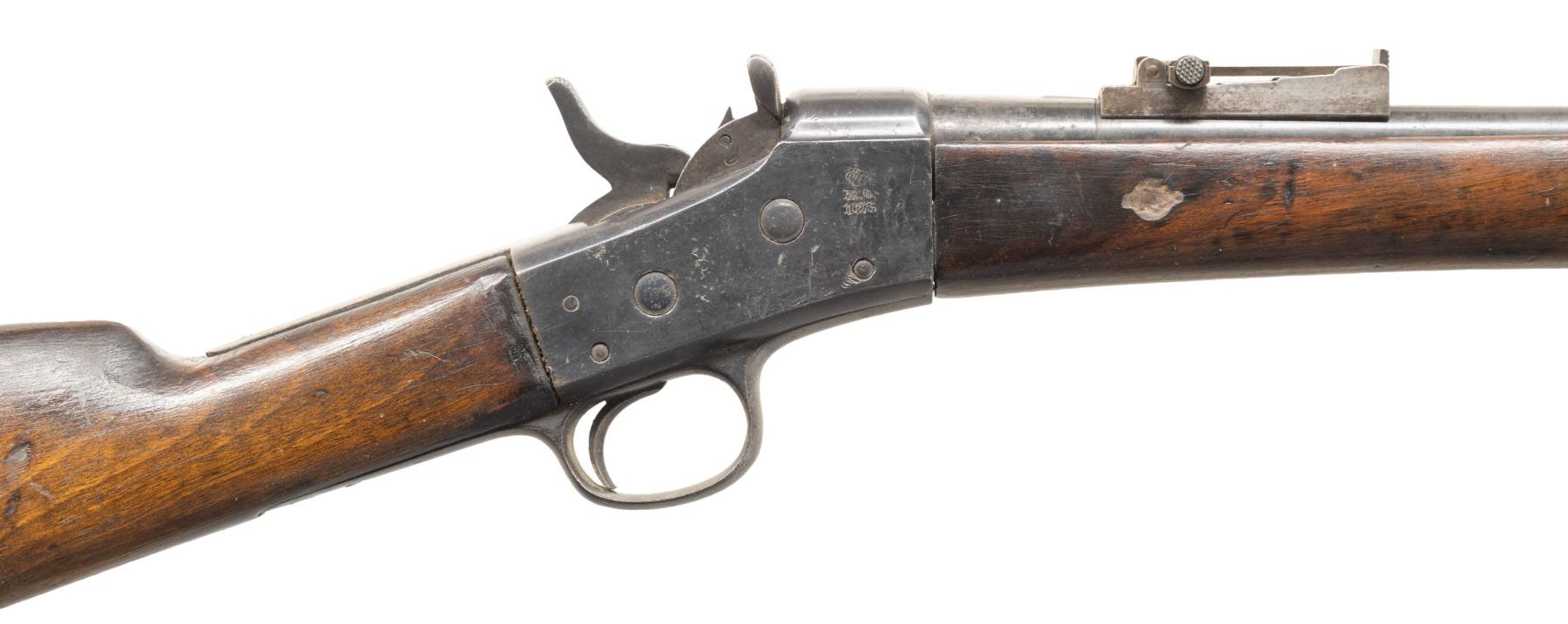 1) Remington Spanish Contract Rolling Block Rifle Cal. 43 Spanish. NSN. Bbl. 35". Blade front sight. Remington made Spanish Rolling Block that appears to be a third contract with March 1874 being last tang patent date. Bbl. has fleur d'lis & crown markings. Ladder rear sight. "US" marked buttplate. Walnut stock set with only front sling provisions. Butt & buttplate appear to be replaced. No ramrod present. UNATTACHED ACCESSORIES: Spanish socket bayonet without scabbard. CONDITION: stock set has old refinish appearance with some chipping, sanding marks, staining, handling marks & dings. Metal is an overall dull gray color possibly from old refinish with scattered pitting, oxidation, dings & handling wear. Action functions properly when hand cycled. Bore shows pitting along its length but evident rifling. (01-26708/MJC).