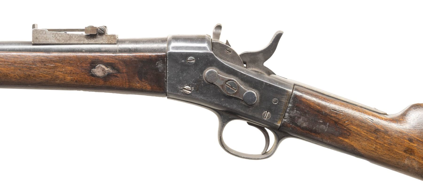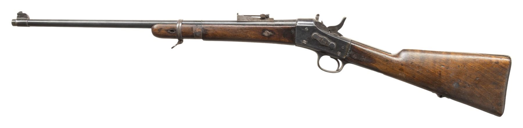 2) Spanish Bannerman Rolling Block Carbine. NSN. Bbl. 24". Blade front sight. US 1896 Krag rear sight. Bannerman assembled Rolling block with 8-06 dated 1903 Springfield bbl. & 1875 dated Spanish action. Blue finish. Hardwood stock set with only front sling swivel present. Front band is stuck forward on forend. CONDITION: stock set has an added finish with some chipping, a putty filler repair on right side of forend where an eschuteon once was, a vacant hole on opposite side of forend, scattered dings, handling marks, staining & scratches. Metal shows a mix of older reblue finishes likely done by Bannerman with what appears to be several "X" markings on upper tang, scattered dings, oxidation, handling marks, edge wear, blued over pitting & wood finish overrun. Action functions properly when hand cycled. Bore shows notable throughout its length but visible rifling. PROVENANCE: From the PMRB Collection. (01-26711/MJC). BOTH ANTIQUE. $500-900.