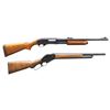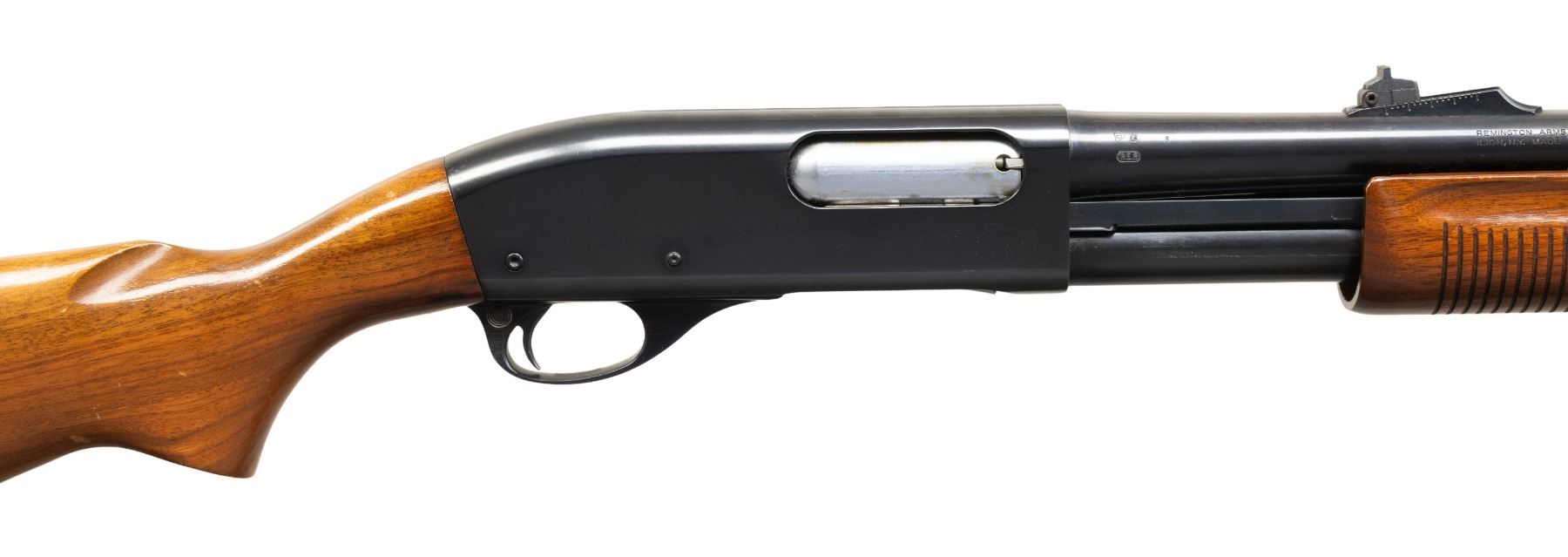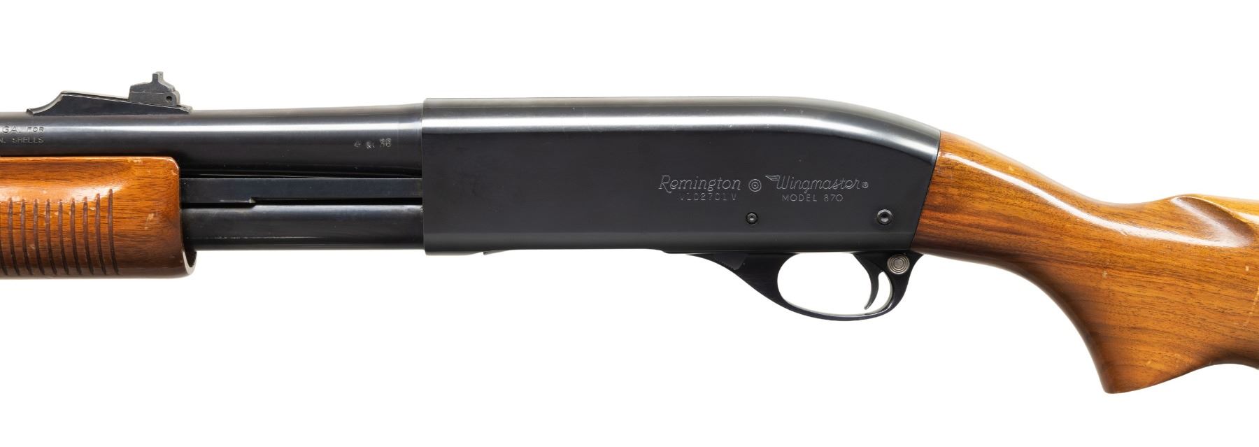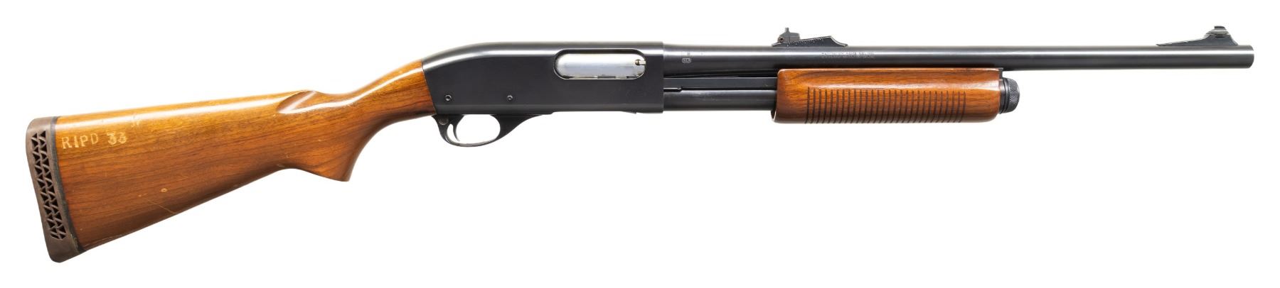 1) Remington 870 Wingmaster Pump Action Shotgun. S# V102701V. Bbl. 20" smoothbore. Bead front sight. Adjustable rifle style rear sight. Blued finish. Trigger guard has metal inventory tag. Walnut pistol grip stock with factory recoil pad & grooved forend. LOP: 13 3/4". Right side of butt has "RIPD 33" marking likely for Riverview, Michigan police department. CONDITION: stock set shows scattered handling marks, light finish wear & dings. Metal retains 95% original blue with a spot of light oxidation on right side of receiver, some handling marks & operational wear. Action functions properly when hand cycled. Bright near excellent bore. (25-5842/MJC).