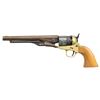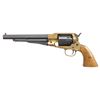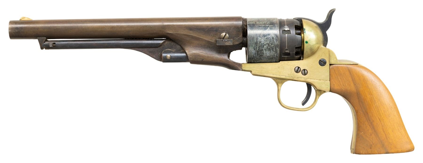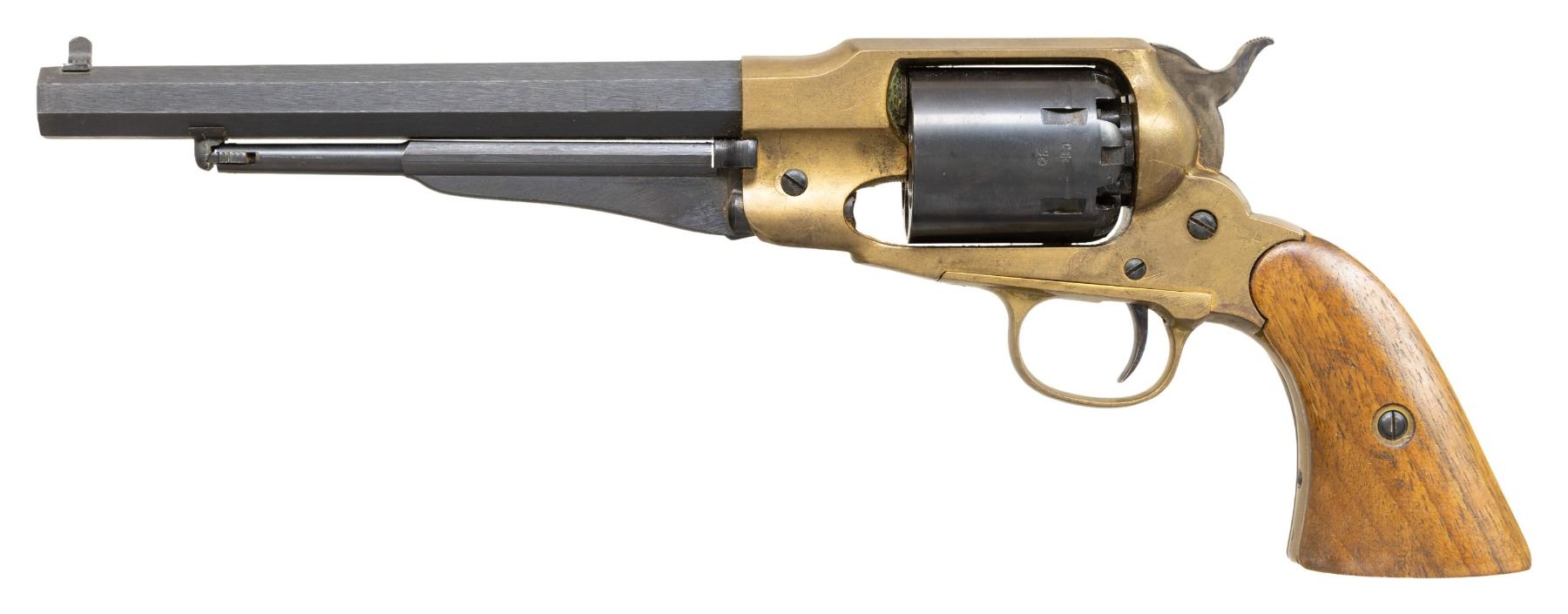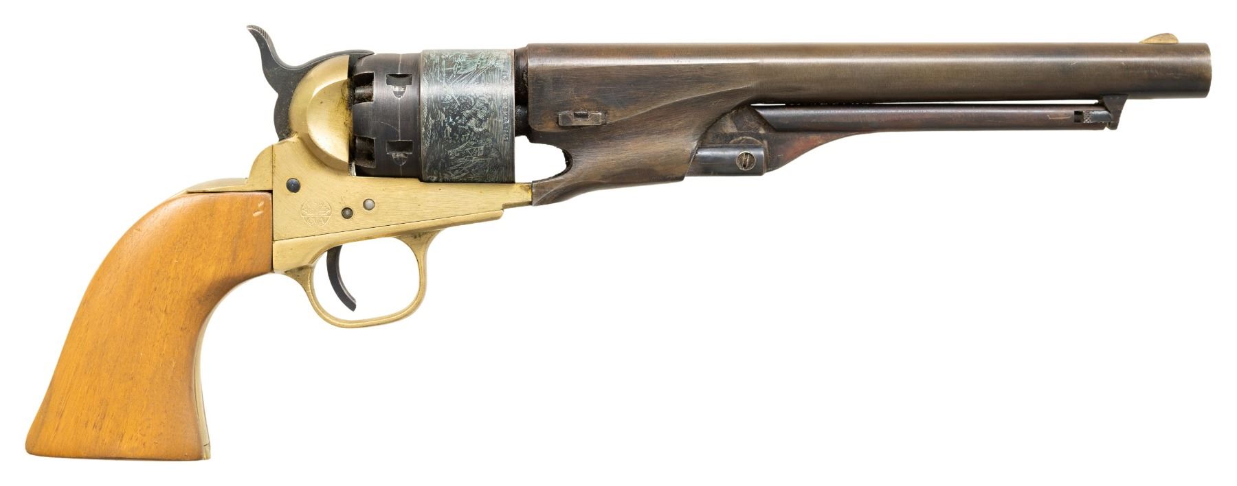 1) CVA 1860 Army Revolver. S# 3885. Bbl 8". Brass blade front sight. Blued cyl. with Naval scenes. Brass frame. Smooth walnut grips. CONDITION: grips show some finish loss, dings, scratches & handling marks. Bbl. is primarily a dull gray patina with traces of bluing, some edge wear & oxidation. Ejector rod & cyl. show scattered white staining, fading to brown, operational wear, oxidation & edge wear. Brass parts show scattered oxidation, light dings & handling marks. Action appears functional when hand cycled. Bore shows notable dried grease & residue but strong rifling. (01-28155/MJC).