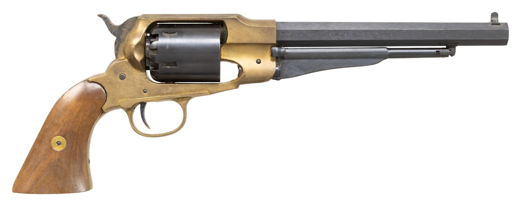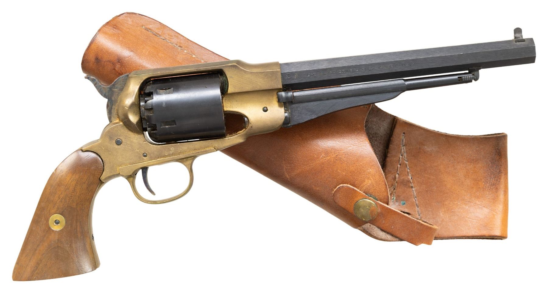 2) Italian 1858 Remington Repro Revolver. S# 111516. Bbl. 8". Round blade front sight. Fixed rear sight. Case colored hammer & trigger. Brass frame & grip assembly. Balance of other parts are blued. Smooth walnut grips. UNATTACHED ACCESSORIES: right handed Canadian made leather holster. CONDITION: grips show some dings, small chips & handling marks. Brass parts are a dull yellow patina appearing cleaned long ago with oxidation, dings & scratches. Hammer & trigger retain most of their case colors. Blued parts retain nearly all their finish with some light oxidation, edge & operational wear. Action functions properly when hand cycled. Very good bore with strong rifling. (01-28156/MJC). BOTH ANTIQUE. $400-600 for pair.