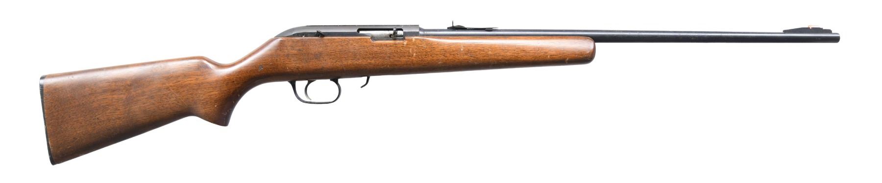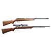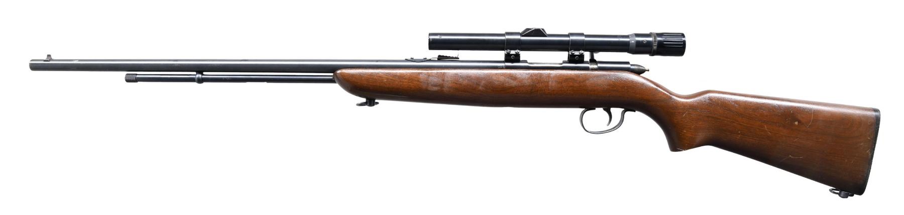 1) 24-7142 ITHACA X-15. Cal. 22 LR. S# 27163B. Bbl. 22". Replacement orange blade front sight. Sporting style rear sight. Receiver grooved for further sight mounting. Mfg. 1964-1967. Blued & anodized finishes. Hardwood pistol grip stock. MAGS: none present. CONDITION: stock is loose & shows scattered dings, scratches & handling wear. Metal retains most of its finishes with scattered oxidation & some edge wear. Action appears to function when hand cycled. Very good bore. (24-7142/MJC). 2) REMINGTON 512 SPORT MASTER BOLT ACTION RIFLE. Cal. 22 S, L, LR. NSN. Bbl.25". Bead front sight. Sporting style rear sight. Receiver mounted Weaver V22 scope. Scope has fine crosshair reticle with green tinted optics. Tube fed bolt action rifle. Blued finish with case colored cocking piece. Pistol grip walnut stock with bottom mounted sling swivels. CONDITION: stock has added varnish with scattered dings & handling marks. Metal retains 92% original blue with scattered light oxidation & edge wear. Action functions properly when hand cycled. Very good bright bore. (24-7145/MJC). BOTH CURIO. $200-300 for pair.