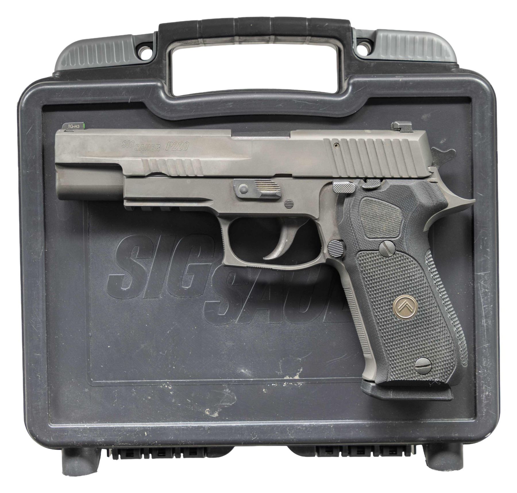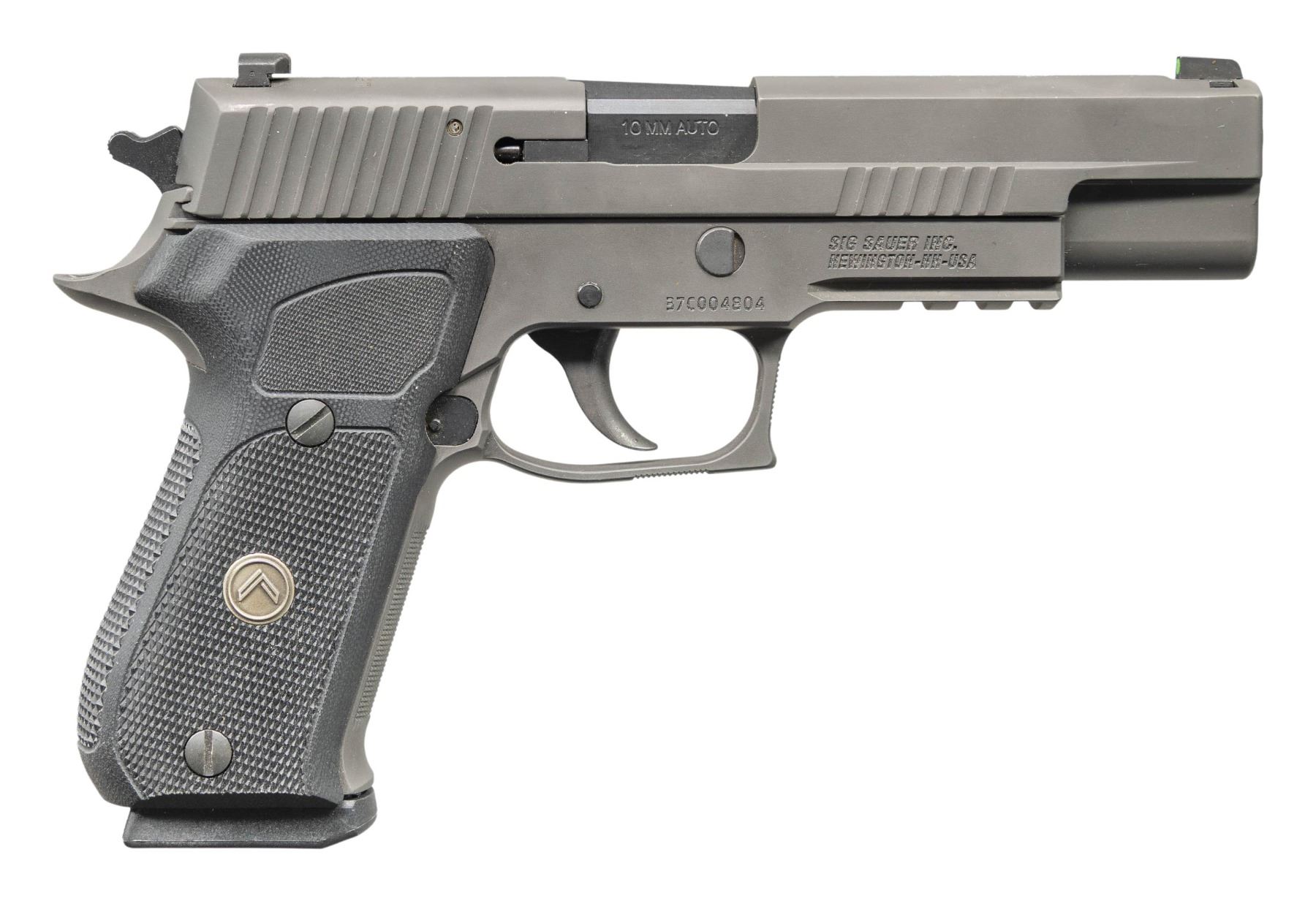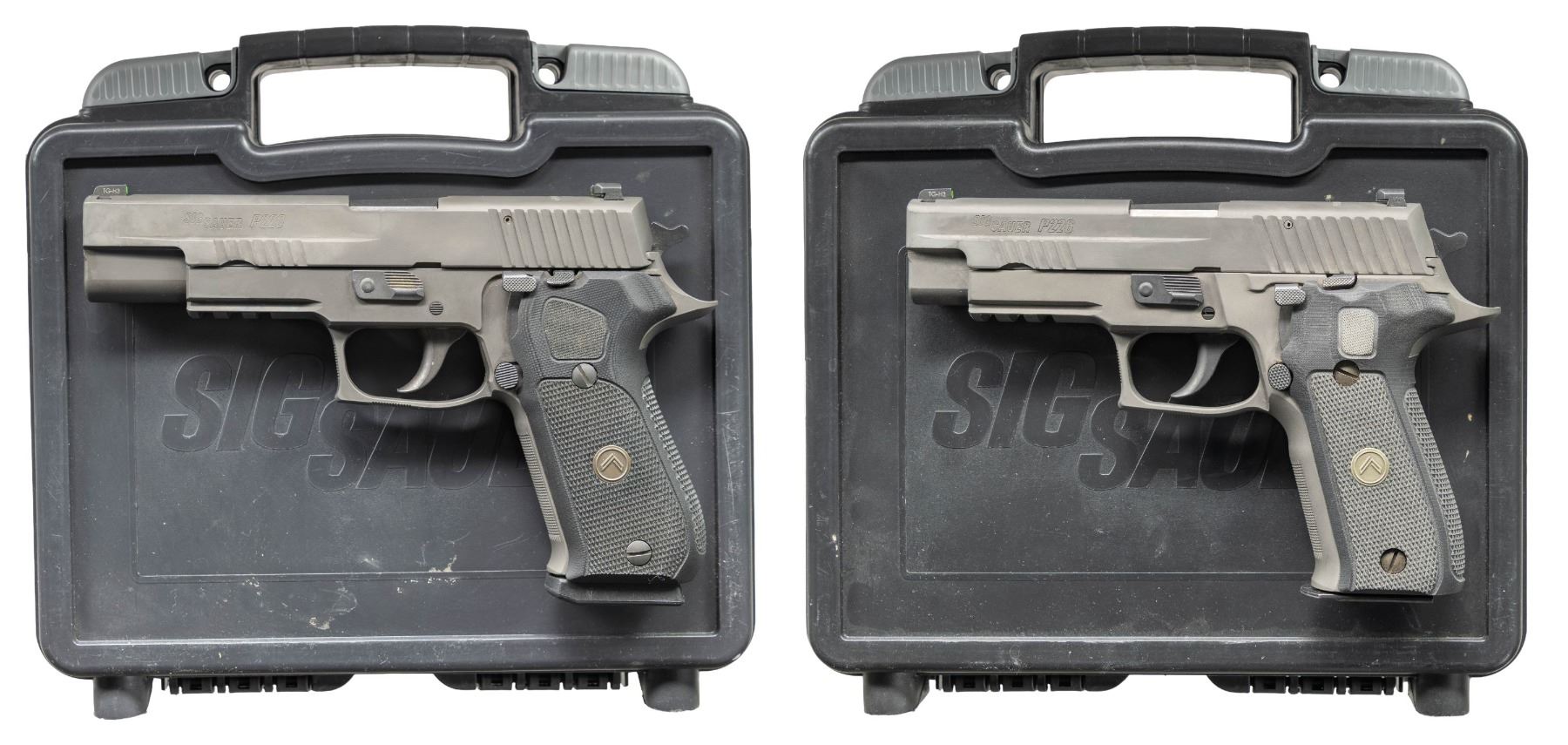 2) Sig Sauer P220 Legion Pistol. Cal. 10mm. S# 37C004804. Bbl. 5". Three dot night sights. High end version of the P220 pistol. Front & rear slide serrations. Matte green finish. Frame has picatinny accessory rail. Checkered black rubber grips with Legion medallions. MAGS: 1-8 rd. UNATTACHED ACCESSORIES: matching numbered factory hardcase with manual, paperwork & trigger lock. CONDITION: grips show light handling wear. Metal shows some light oxidation in takedown lever, operational wear & grease staining. Action functions properly when hand cycled. Bright near excellent bore. (25-4696/MJC). BOTH MODERN. $900-1,400 for lot.