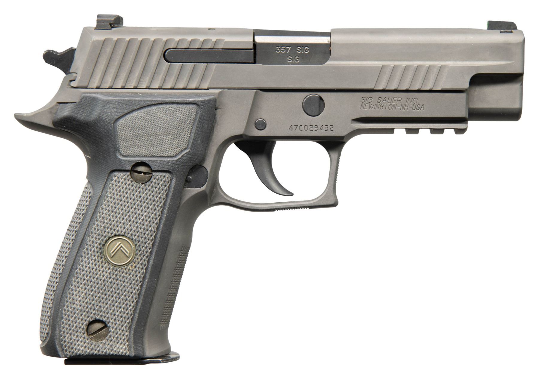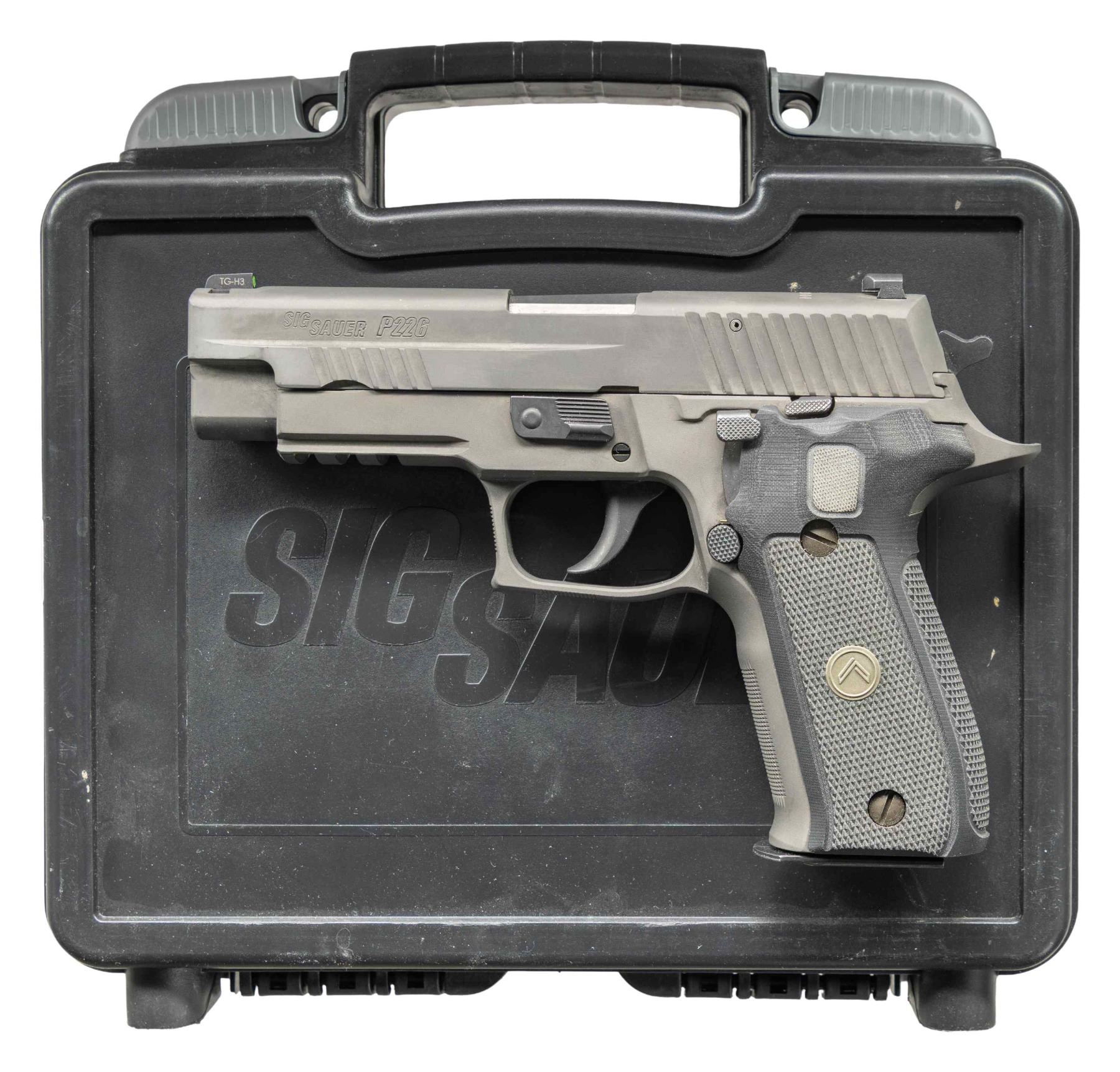 1) Sig Sauer P226 Legion Pistol. Cal. 357 Sig. S# 47C029432. Bbl. 4 3/8". Three dot night sights. High end P226 pistol. Front & rear slide serrations. Matte green finish. Frame has picatinny accessory rail. Checkered black rubber grips with Legion medallions. MAGS: 1-12 rd. UNATTACHED ACCESSORIES: matching numbered factory hardcase with cable lock, manual & paperwork. CONDITION: grips show scattered white staining. Metal shows some oil staining, light edge wear & handling marks. Action functions properly when hand cycled. Bright near excellent bore. (25-4682/MJC).