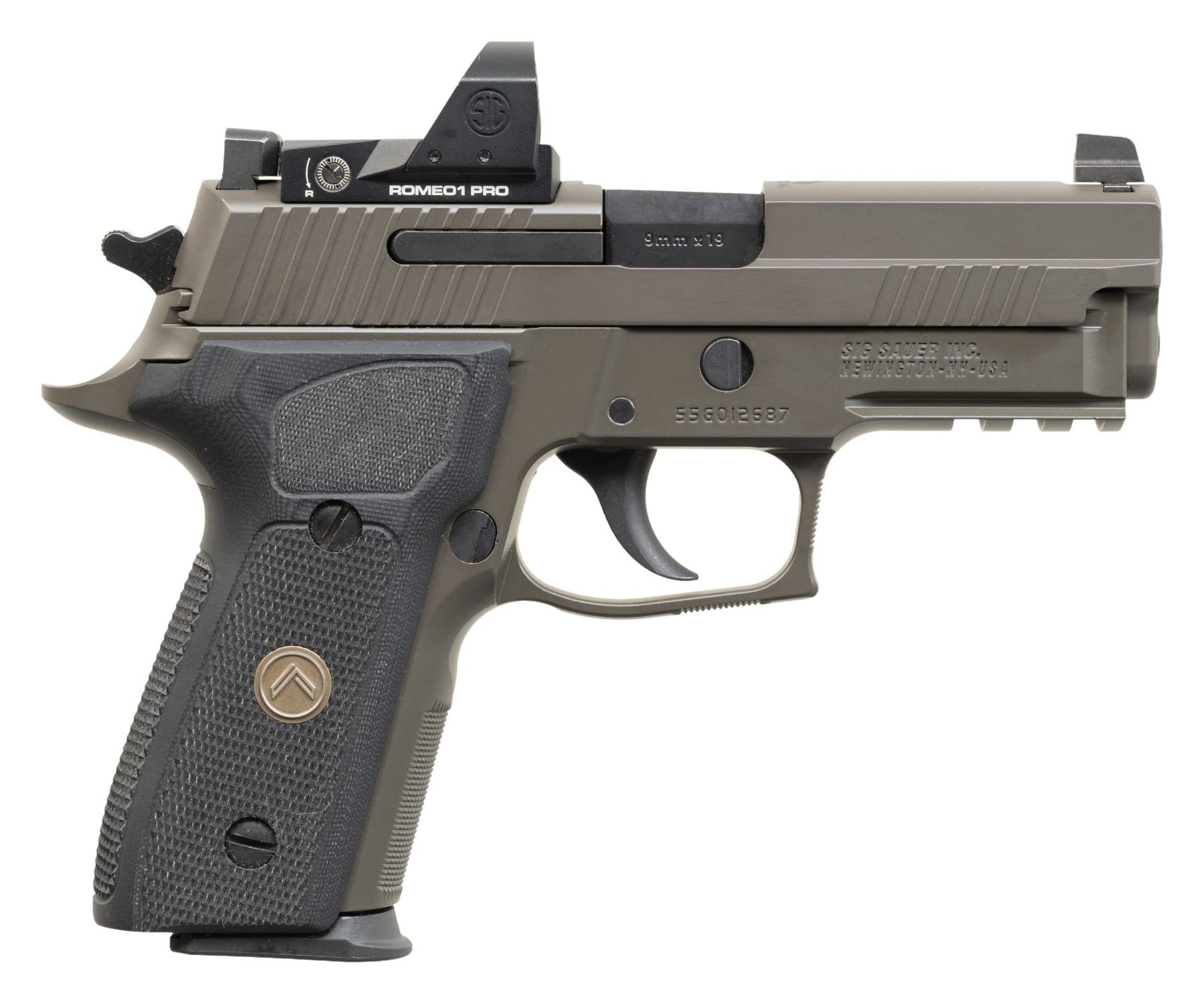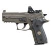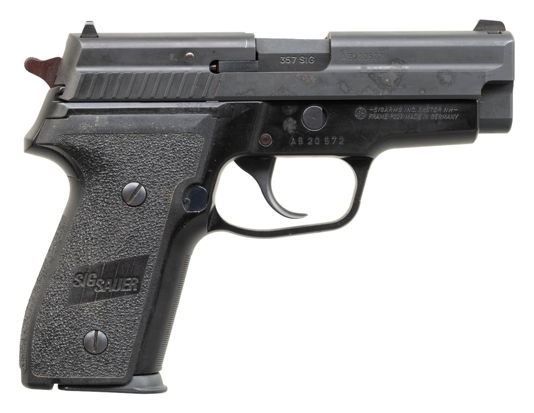 1) Cal. 357 Sig. S# AB20572. Bbl. 4". White dot front sight. Square notch rear sight with white stripe. Exeter, NH made pistol. Gray finished slide. Matte black frame. Pebbled black factory grips. MAGS: 1-12 rd. CONDITION: grips show some staining & handling marks. Metal retains 92% original finishes with some oxidation patches on right side, handling marks & edge wear. Action functions properly when hand cycled. Near excellent bore. (25-4654/MJC). 2) Cal. 9x19. S# 55G012687. Bbl. 3 7/8". Three dot night sights. Slide mounted Romeo1 PRO Dot sight that does not appear to be turning on. Legion P229 pistol Tuned trigger. Green finish. Frame has accessory rail Checkered black Legion grips. MAGS: 1-15 rd. CONDITION: metal & grips show light handling & operational wear. Action functions properly when hand cycled. Bright near excellent bore. (25-4699/MJC). BOTH MODERN. $800-1,200 for pair.