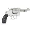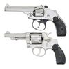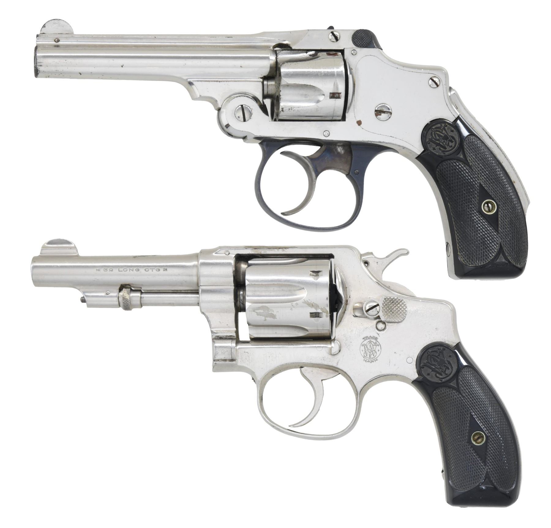 1) S&W SAFETY HAMMERLESS Cal. 32 S&W. S# 97630. Bbl. 3 1/2". Round blade front sight. U-notch rear sight. Matching numbers on frame, bbl. latch, & cyl. Revolver appears to be a second Model 32 Safety Hammerless but right & left sides of bbl. unmarked. Nickel finish with case colored trigger & blued trigger guard. Checkered black hard rubber grips with S&W monograms & matching scratch number on right panel. CONDITION: grips show some dirt staining & handling wear. Trigger retains most of its case colors with light oxidation & operational wear. Balance of metal retains 90% nickel with some flaking near muzzle, light oxidation & handling marks. Trigger function is stiff & does not always turn cyl. when hand cycled. Bore is mostly bright with some oxidation spots but strong rifling. (24-7182/MJC). 2) S&W 1903 H.E. DA REVOLVER. Cal. 32 S&W Long. S# 113974. Bbl. 3 3/8". Round blade front sight. Fixed rear sight. Matching numbers on frame, bbl., cyl., extractor & right grip panel. Model 1903 5th change revolver. Renickeled finish. Checkered black grips with S&W monograms. CONDITION: grips show several dents on bottom of left panel, some cracks in same area & scattered handling wear. Metal retains 90% renickel with some nickeled over pitting, scattered flaking & oxidation. Action appears to functions properly when hand cycled. Bore shows scattered oxidation with worn rifling. (24-7184/MJC). BOTH CURIO. $300-500 for pair.