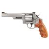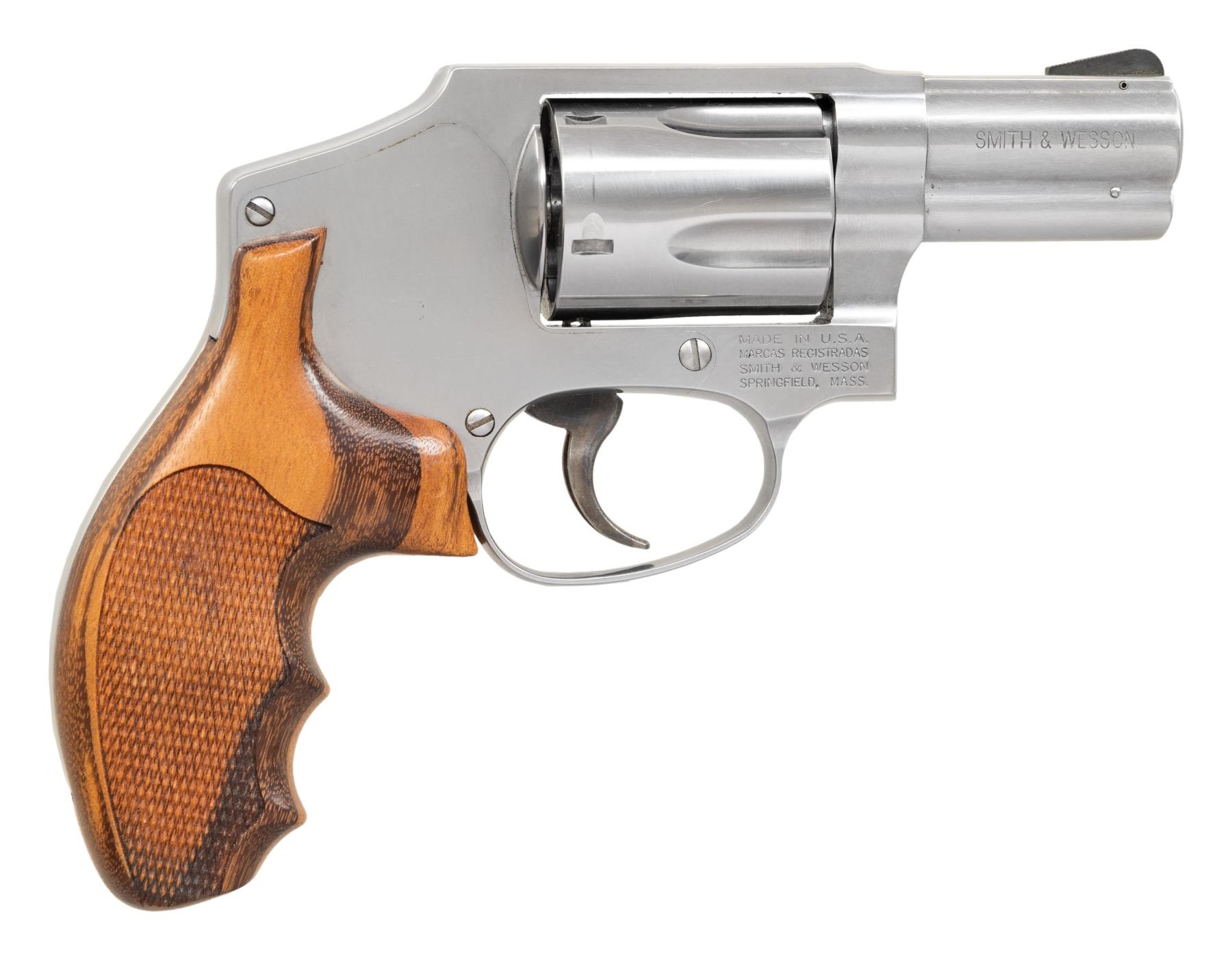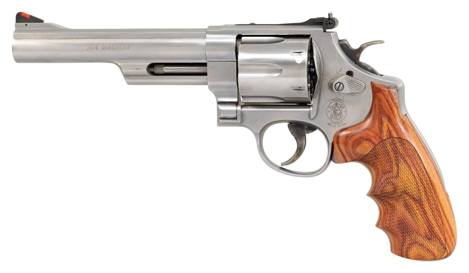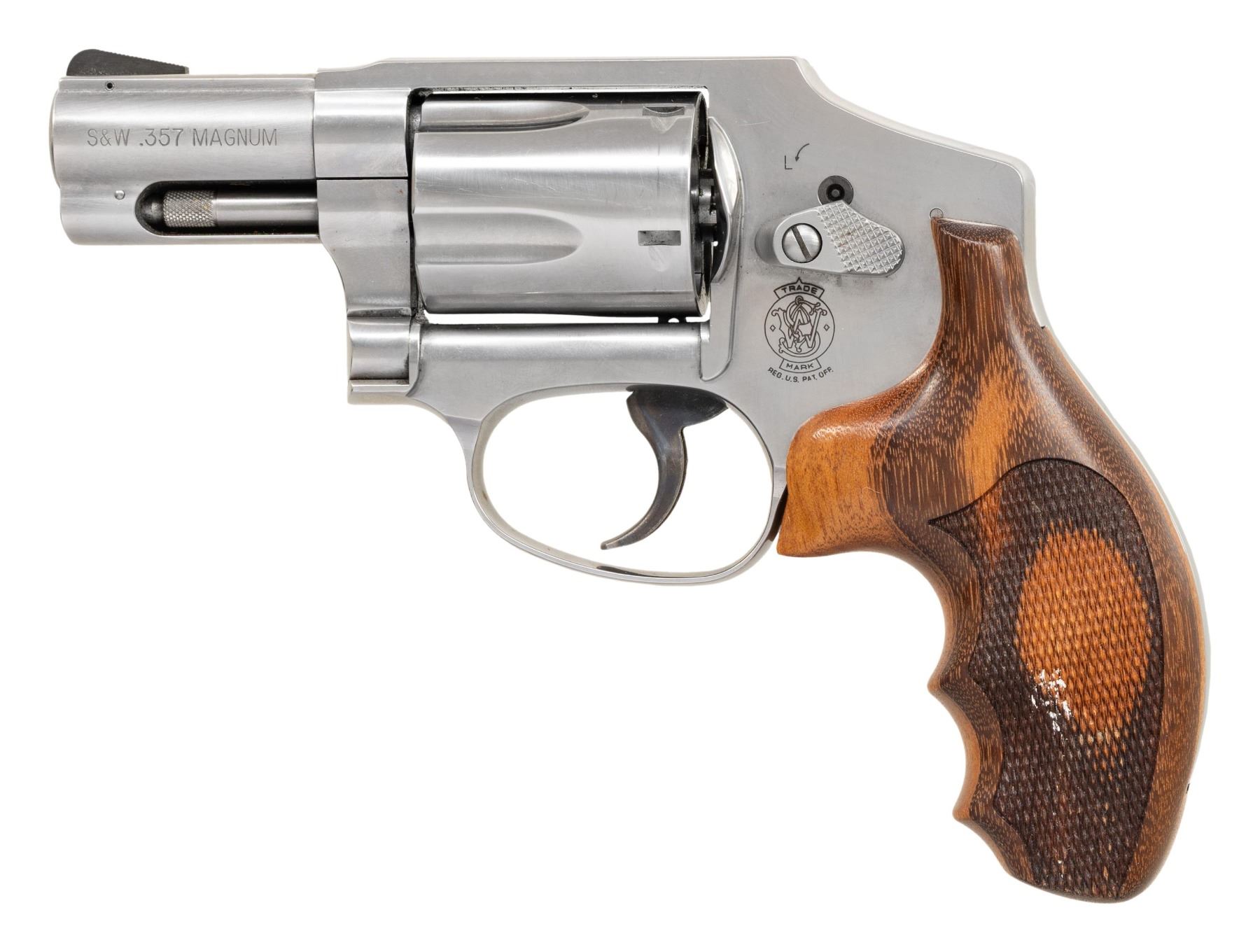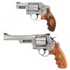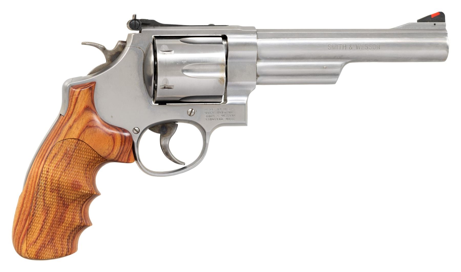 1) Smith & Wesson Model 640-3. Cal. 357 Mag. S# CNY7023. Bbl. 2". Ramped serrated blade front sight. Fixed rear sight. Internal lock behind cyl. release. 5-shot cyl. Stainless finish with case colored trigger. Checkered laminated finger groove grips. CONDITION: grips show a spot of white paint staining & minor handling wear. Trigger retains most of its case colors with some operational wear. Balance of metal shows light handling & carry wear. Action functions properly when hand cycled. Near excellent bore. (25-4706/MJC). 2) Smith & Wesson Model 629-6. Cal. 44 Mag. S# DCE2701. Bbl. 6". Ramped serrated blade front sight with orange insert. Adjustable square notch rear sight with white outline. Internal lock behind cyl. release. 6-shot cyl. Stainless finish with case colored hammer & trigger. Hardwood checkered finger groove grips. CONDITION: grips show some light handling marks. Hammer & trigger retain most of their case colors with some light operational wear. Balance of metal shows some minor oxidation stain specks, handling marks & operational wear. Action functions properly when hand cycled. Near excellent bright bore. (25-4763/MJC). BOTH MODERN. $700-1,100 for lot.