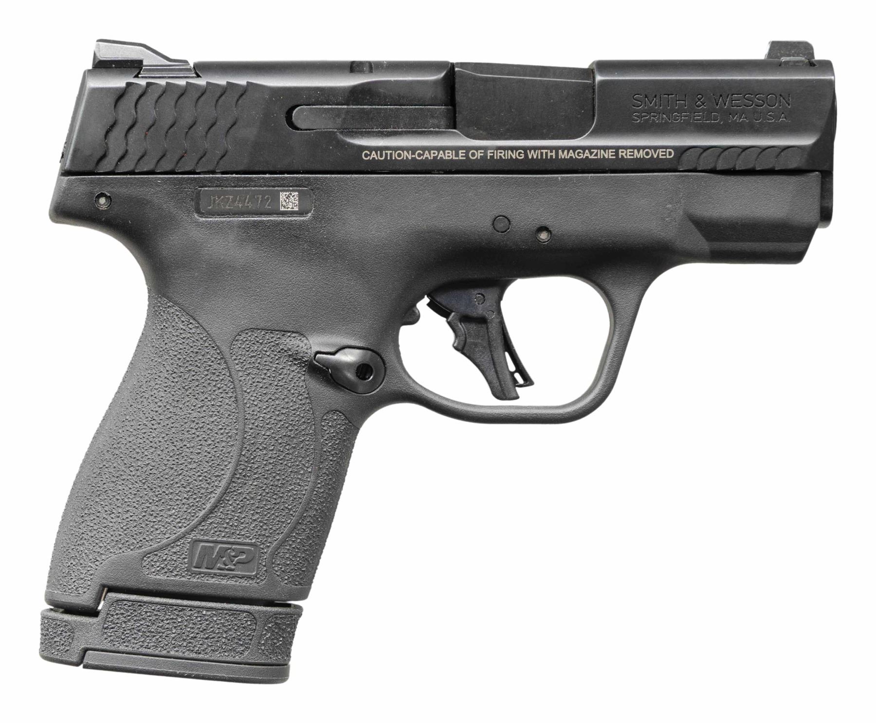 1) M&P Shield Plus. S# JKZ4472. Three dot sights. Manual safety. Upgraded trigger. Matte black finish. Polymer frame. MAGS: 1-8 rd. UNATTACHED ACCESSORIES: matching numbered factory box with trigger lock, manual & paperwork. CONDITION: pistol shows light handling & operational wear. Action functions properly when hand cycled. Bright near excellent bore. (25-4614/MJC).