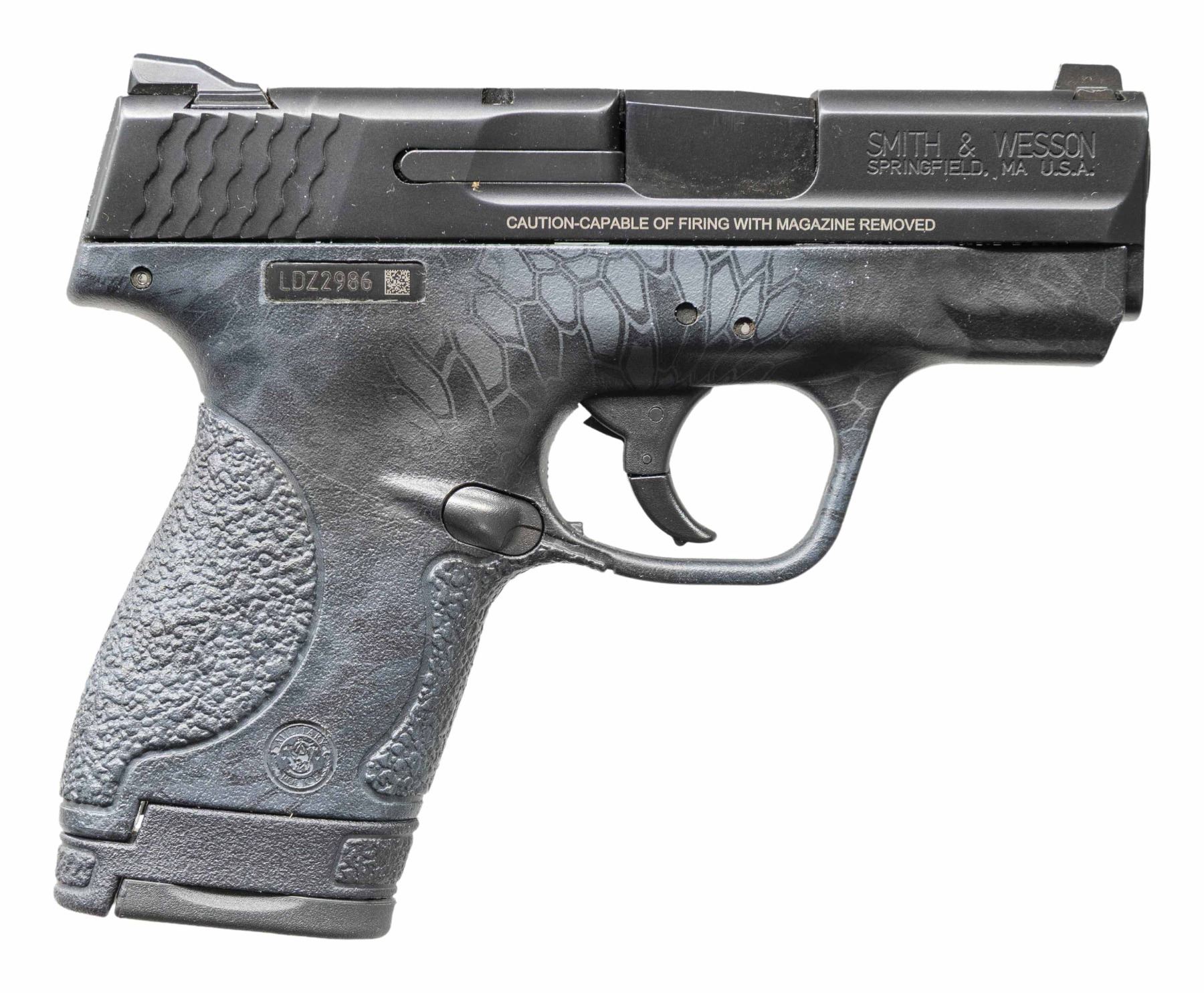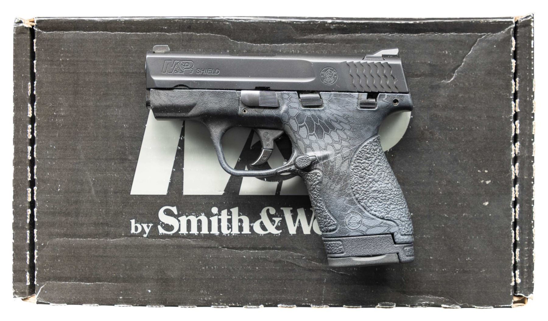 2) M&P Shield Kryptek Typhon Pistol. S# LDZ2986. Three dot sights. Manual safety. Matte black finish slide. Kryptek finished polymer frame. MAGS: 1-8 rd. UNATTACHED ACCESSORIES: matching numbered factory box with trigger lock, manual & paperwork. CONDITION: frame & metal show light handling marks & carry wear. Action functions properly when hand cycled. Bright near excellent bore. (25-4657/MJC). BOTH MODERN. $600-1,000 for pair.