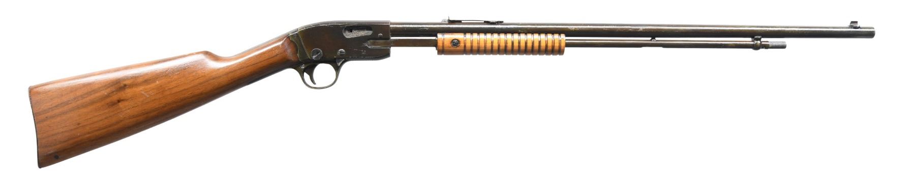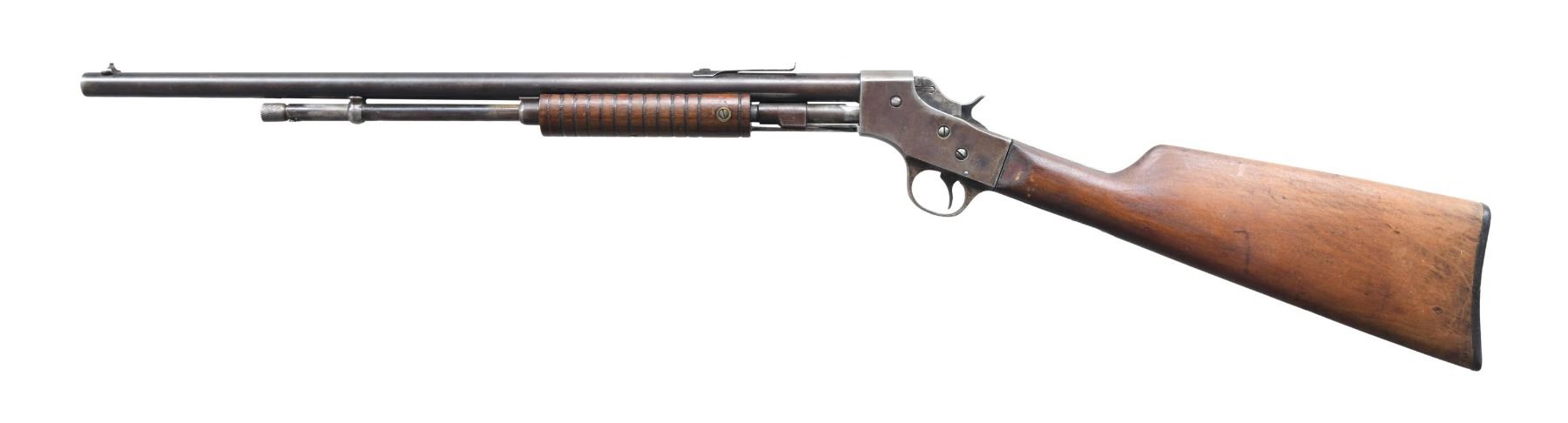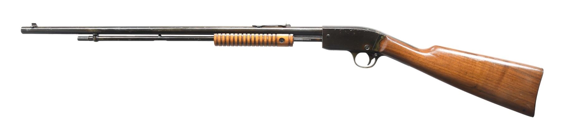 This lot consists of the following rifles: 1) STEVENS MODEL 75 PUMP ACTION RIFLE. Cal. 22 S, L & LR. S# 6540. Bbl. 24". Bead front sight. Sporting rear sight. Rear upper tang screw missing. Mag fed pump action rimfire rifle. Hardwood buttstock & grooved forend. CONDITION: sanded stock & forend have thickly added varnish with scattered handling wear & a few dings. Metal is a dull gray patina with overall varnish overrun, scattered edge wear & some oxidation. Action functions properly when hand cycled. Bore shows scattered pitting with visible rifling. (24-7130/MJC). 2) STEVENS VISIBLE LOADER NO. 70 PUMP ACTION RIFLE. Cal. 22 LR. S# Y259. Bbl. 20". Blade front sight. Sporting style rear sight. Hardwood buttstock with black factory buttplate & grooved forend. CONDITION: butt stock is mostly devoid of finish, stock otherwise shows scattered dings, flaking & handling wear. Metal is mostly a gray patina with scattered edge wear, oxidation & traces of blue. Action appears to function properly when hand cycled. Pitted poor bore. (24-7141/MJC). BOTH CURIO. $150-250 for pair.