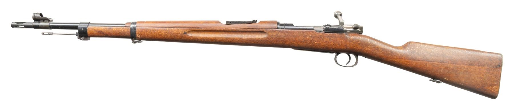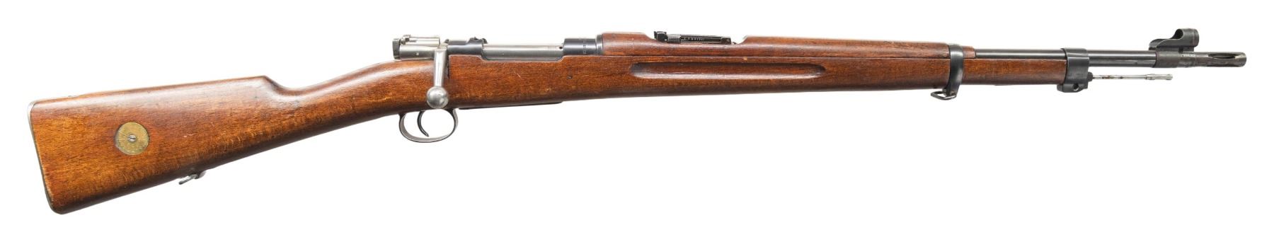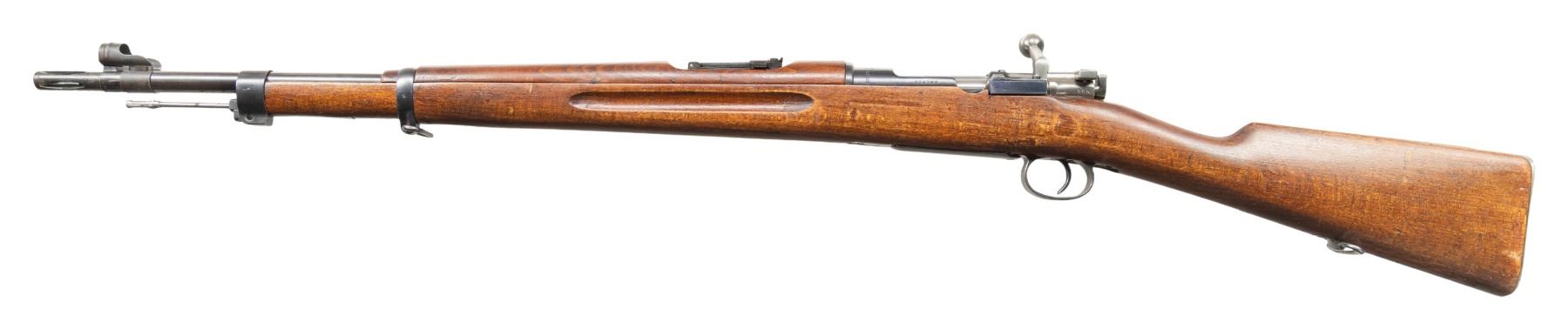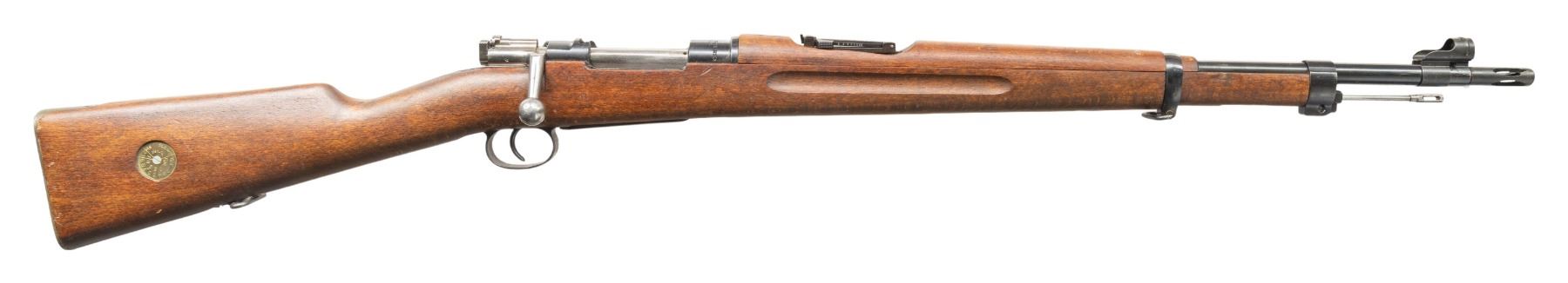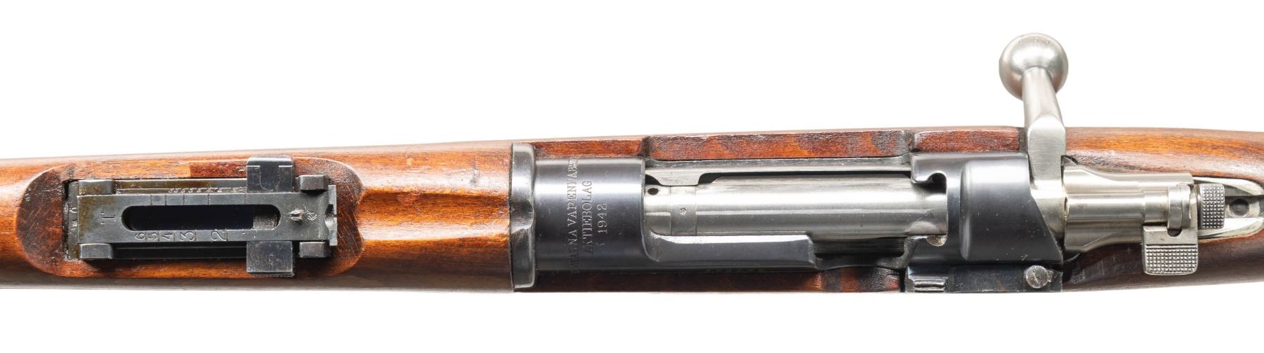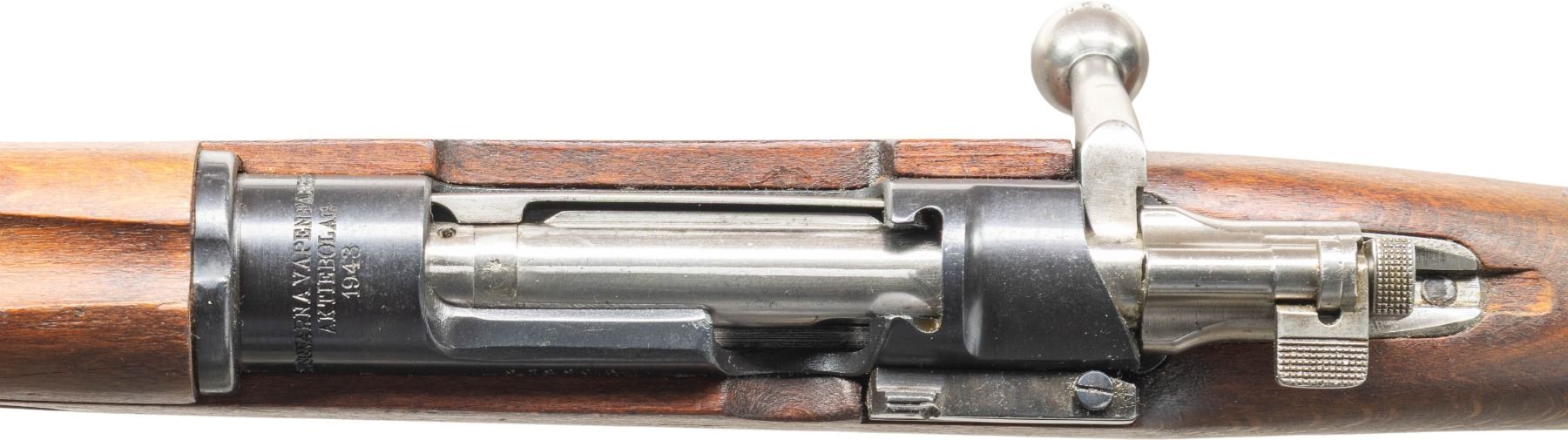 1) S# 672906. Standard M38 sights with hooded front. Matching numbers on receiver, safety & bolt handle. Bolt parts appear arsenal force matched & other parts appear unnumbered.1943 production Husqvarna M38. Arsenal blue finish. Beech stock set with bottom mounted sling swivels. Underside of wrist has two strong Swedish crown stamps. Cleaning rod present. CONDITION: stock set shows a 1 1/2" crack at the upper tang, some light chipping around buttplate, scattered dings & handling marks. Buttplate has a gray cleaned appearance with scattered pitting. Balance metal retains 90% arsenal blue with scattered edge wear, light oxidation, fading & handling marks. Action functions properly when hand cycled. Bright near excellent bore. (25-4766/MJC).