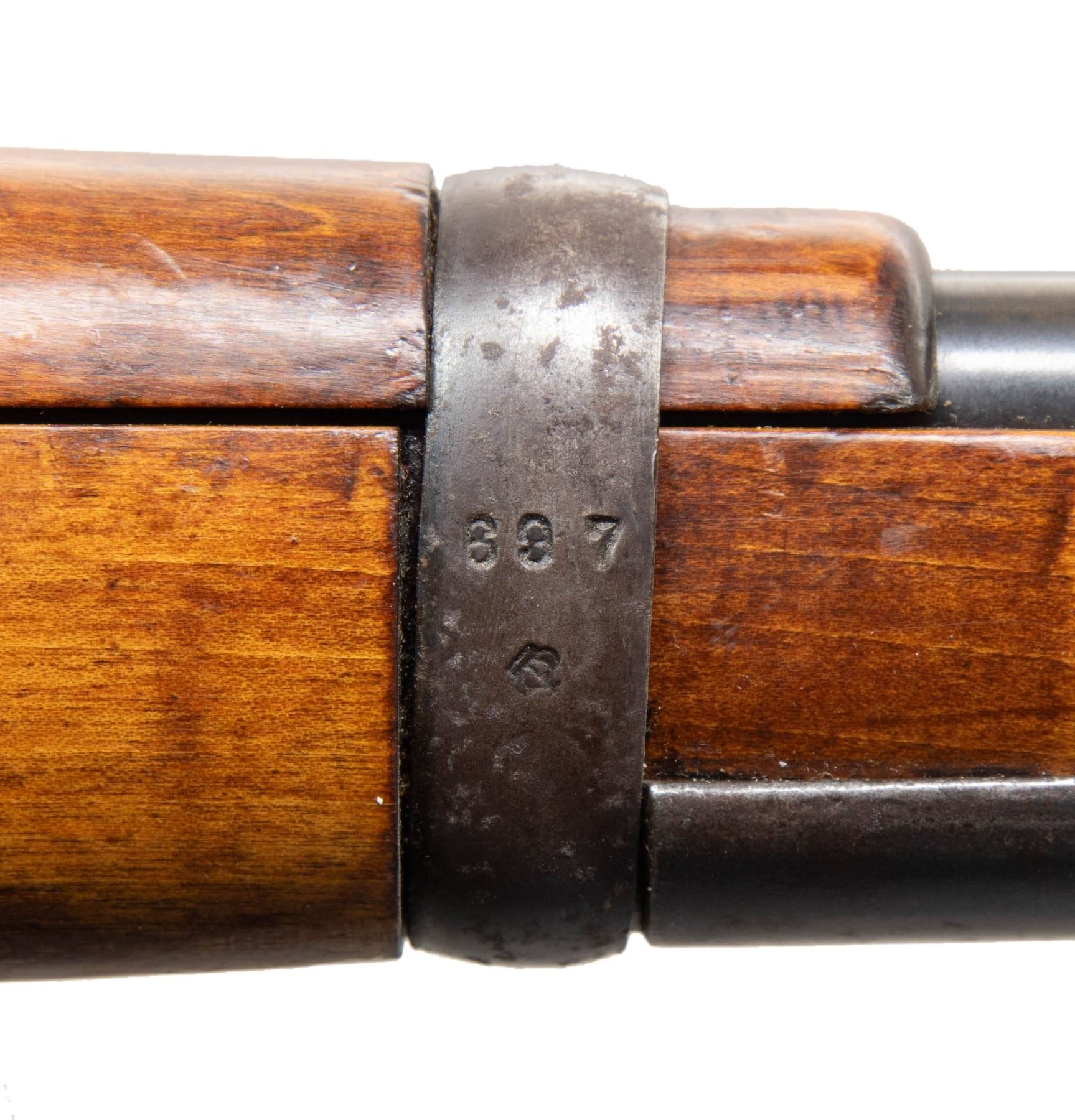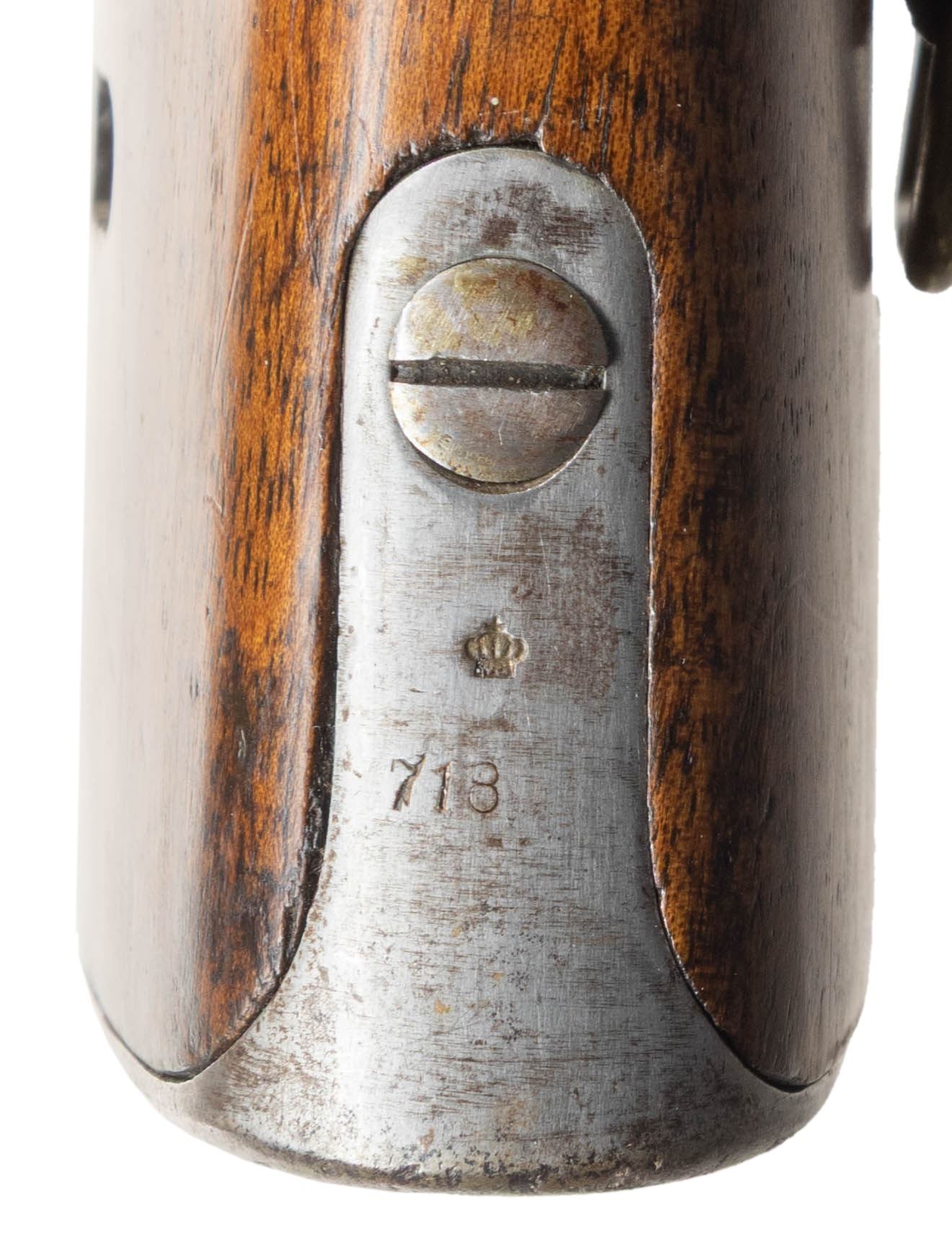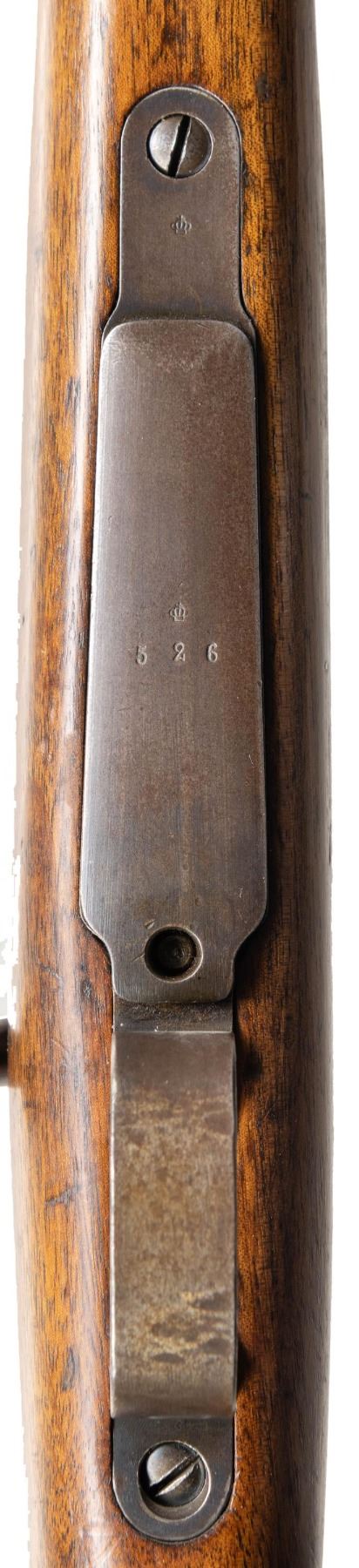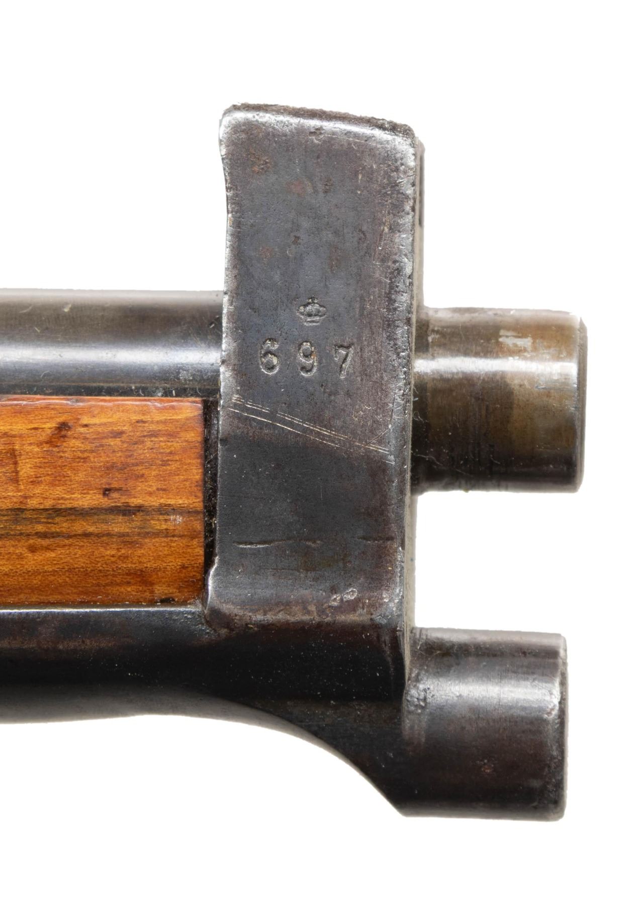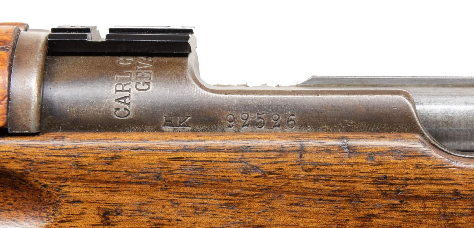 1) Carl Gustafs M94/14 Bolt Action Carbine. S# 92526. Bbl. 18" with importer added extension. Standard M94/14 sights. Receiver has been drilled & tapped with added Weaver style bases. Nosecap, band & buttplate are all mismatched. Other visible parts are matching to receiver. Receiver ring has Carl Gustafs marking with no visible date due to Weaver base. Hardwood stock with left side sling provisions. Right side of butt has brass disc with unit marking that reads "1/No.7.K.7/R". Handguard displays a loose fit. CONDITION: refinished stock set has added finish with a couple plugged holes on toeline of butt, a notable splice repair behind band keeper, a further splice repair on underside of forend, a 5" crack on both sides of butt, a couple synthetic filler repairs, scattered dings, scratches & handling marks. Metal is mostly a gray color with traces of bluing, scattered edge wear, oxidation, handling marks & some dings. Action functions properly when hand cycled. Bore shows scattered frosting & light pitting but strong rifling. (25-5353/MJC).