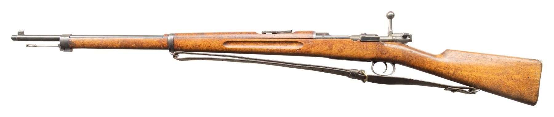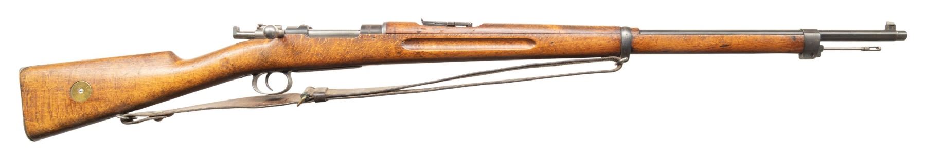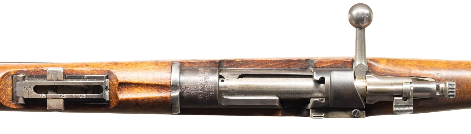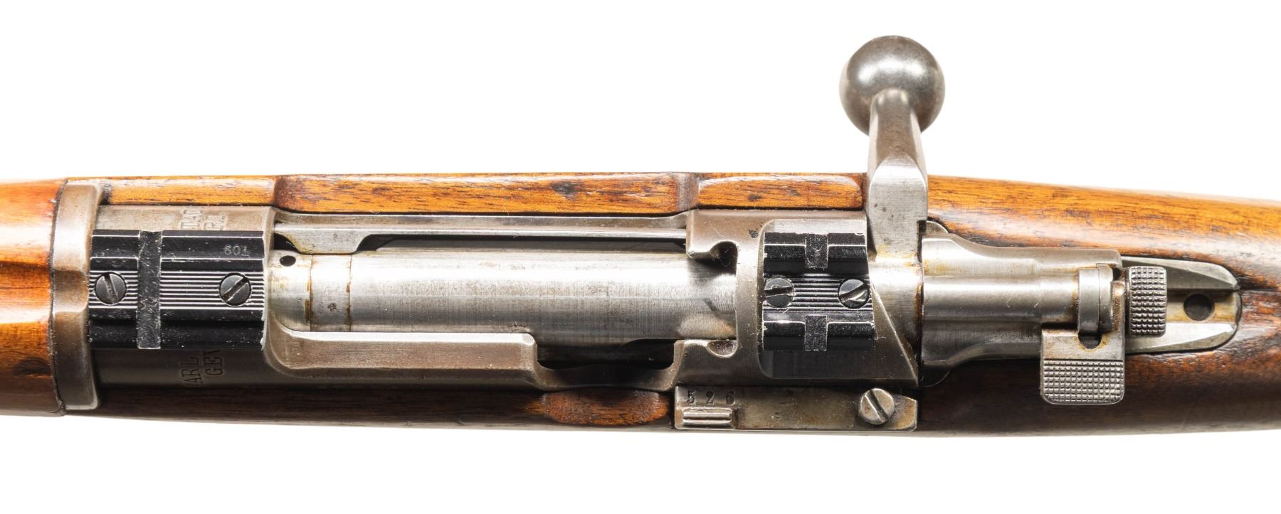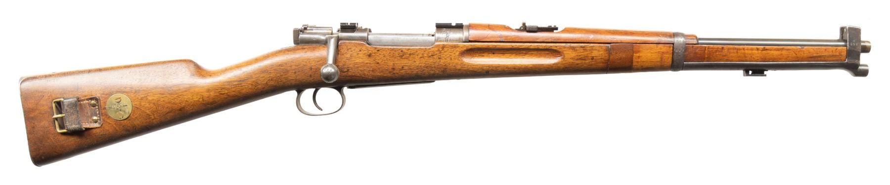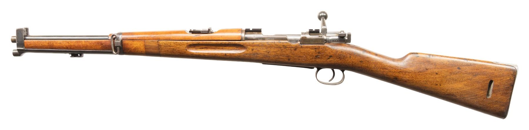 1) Carl Gustafs M94/14 Bolt Action Carbine. S# 92526. Bbl. 18" with importer added extension. Standard M94/14 sights. Receiver has been drilled & tapped with added Weaver style bases. Nosecap, band & buttplate are all mismatched. Other visible parts are matching to receiver. Receiver ring has Carl Gustafs marking with no visible date due to Weaver base. Hardwood stock with left side sling provisions. Right side of butt has brass disc with unit marking that reads "1/No.7.K.7/R". Handguard displays a loose fit. CONDITION: refinished stock set has added finish with a couple plugged holes on toeline of butt, a notable splice repair behind band keeper, a further splice repair on underside of forend, a 5" crack on both sides of butt, a couple synthetic filler repairs, scattered dings, scratches & handling marks. Metal is mostly a gray color with traces of bluing, scattered edge wear, oxidation, handling marks & some dings. Action functions properly when hand cycled. Bore shows scattered frosting & light pitting but strong rifling. (25-5353/MJC).