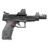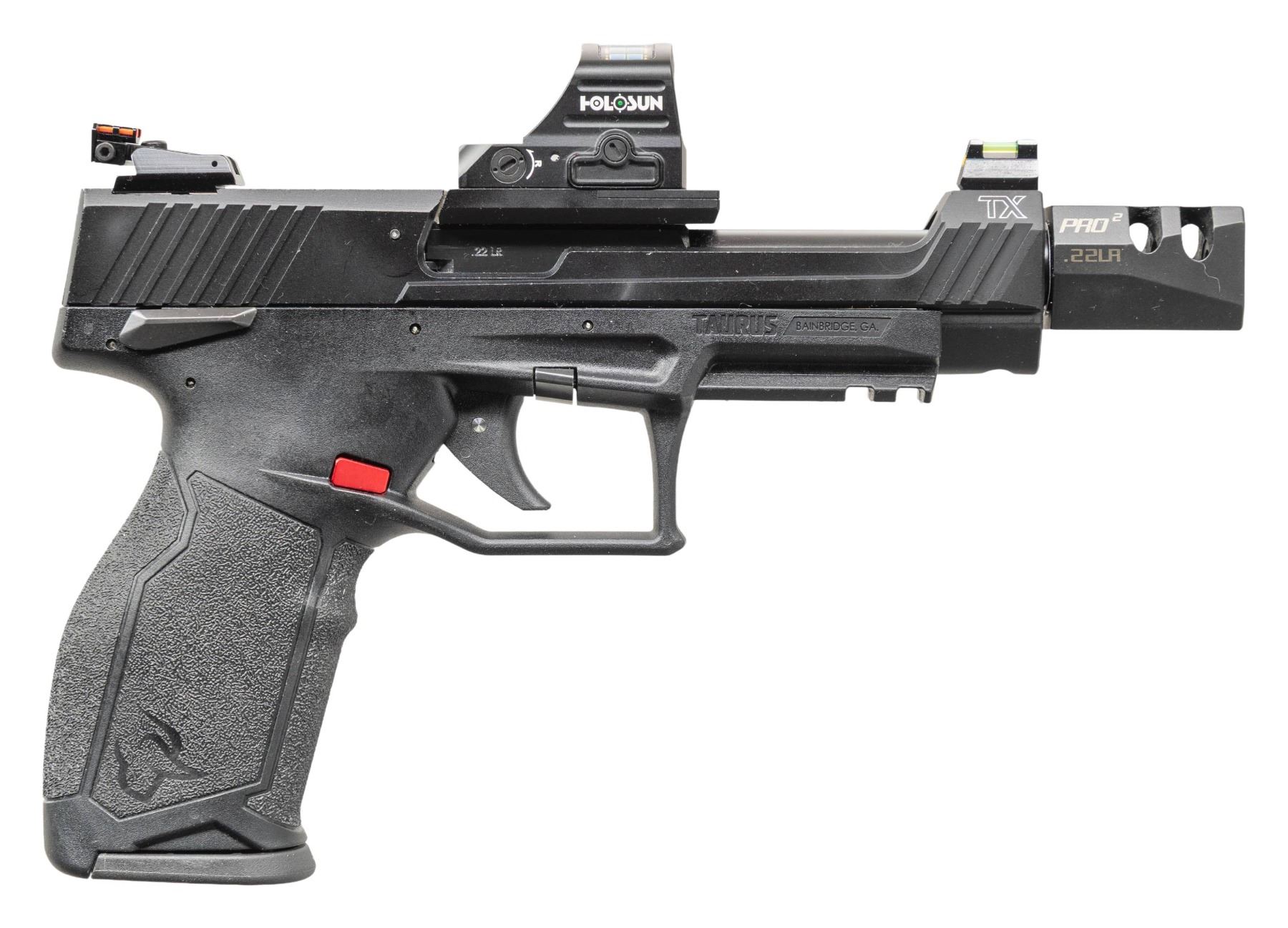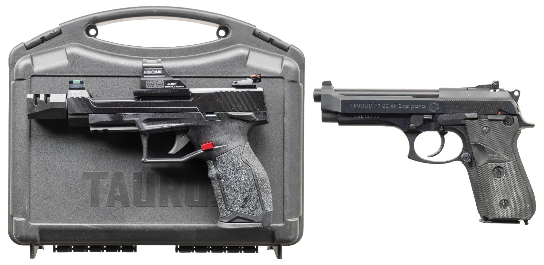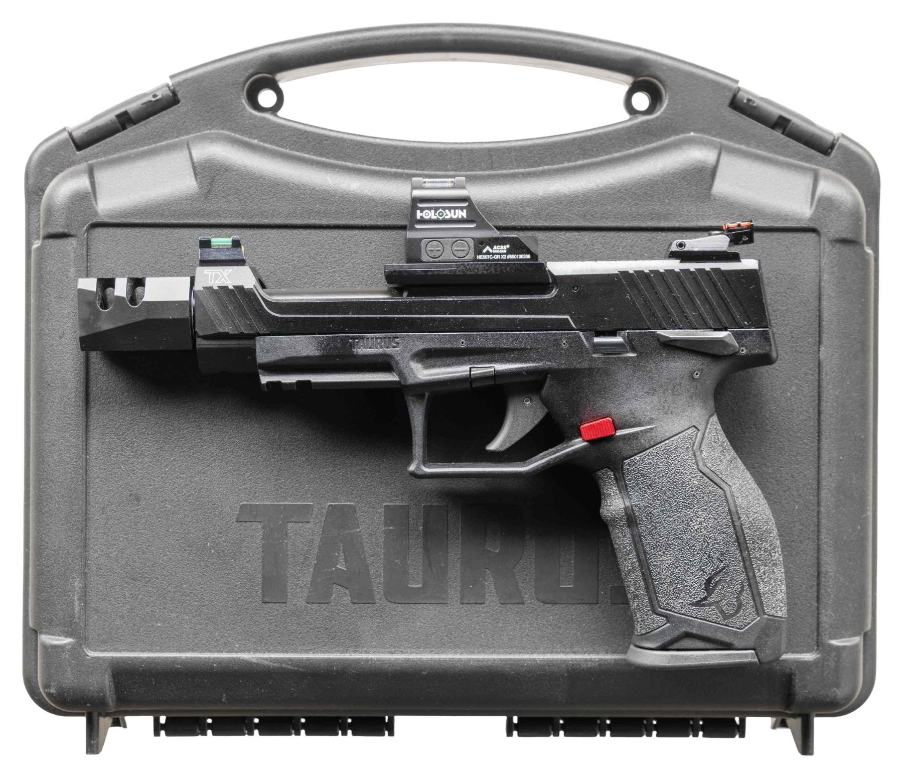 2) TAURUS TX22 COMPETITION SEMI AUTO PISTOL. Cal. 22 LR. S# 1PT595249. Bbl. 5 3/8" with TK compensator. Fiber optic sights with adjustable rear. Slide mounted Holosun HE507C-GR sight that is still working. Matte black finish. Ambi safety. Black polymer frame with accessory rail. MAGS: 3-10 rd. UNATTACHED ACCESSORIES: matching numbered factory hardcase with manual & TK victory trigger. CONDITION: all aspects near excellent. (25-5262/MJC). BOTH MODERN. $500-800 for lot.