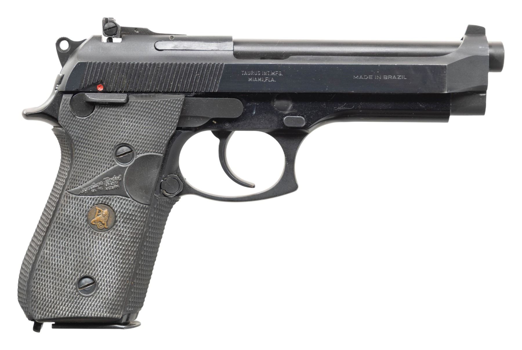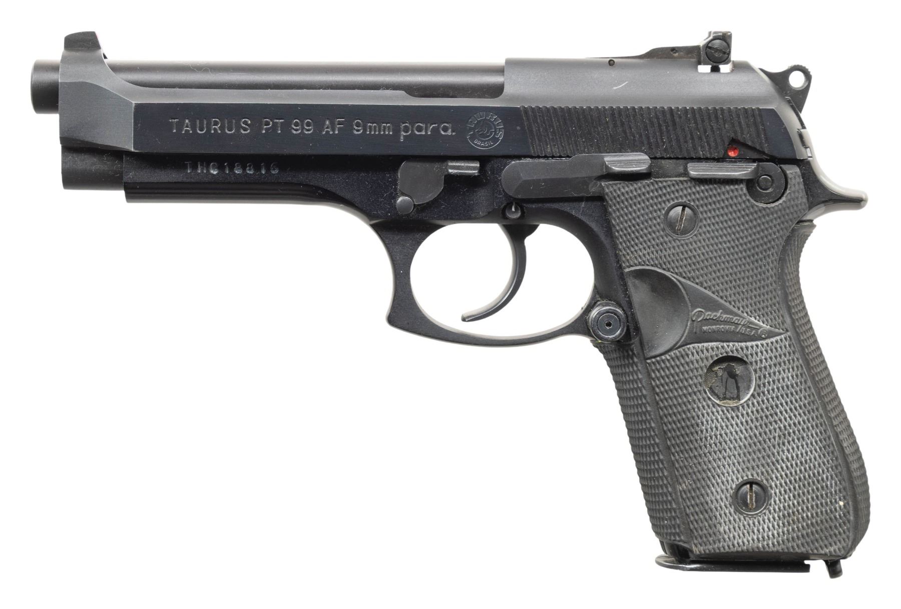 1) TAURUS PT99 AF. Cal. 9mm Luger. S# THC18816. Bbl. 5". Three dot sights with adjustable rear. Enlarged mag release. Blued & anodized finish. Pachmayr Signature Model grips. MAGS: 1-15. CONDITION: grips are missing left medallion & show scattered white staining & handling marks. Metal retains 97% original finishes with some light handling & edge wear. Action functions properly when hand cycled. Bright near excellent bore. (25-5253/MJC).