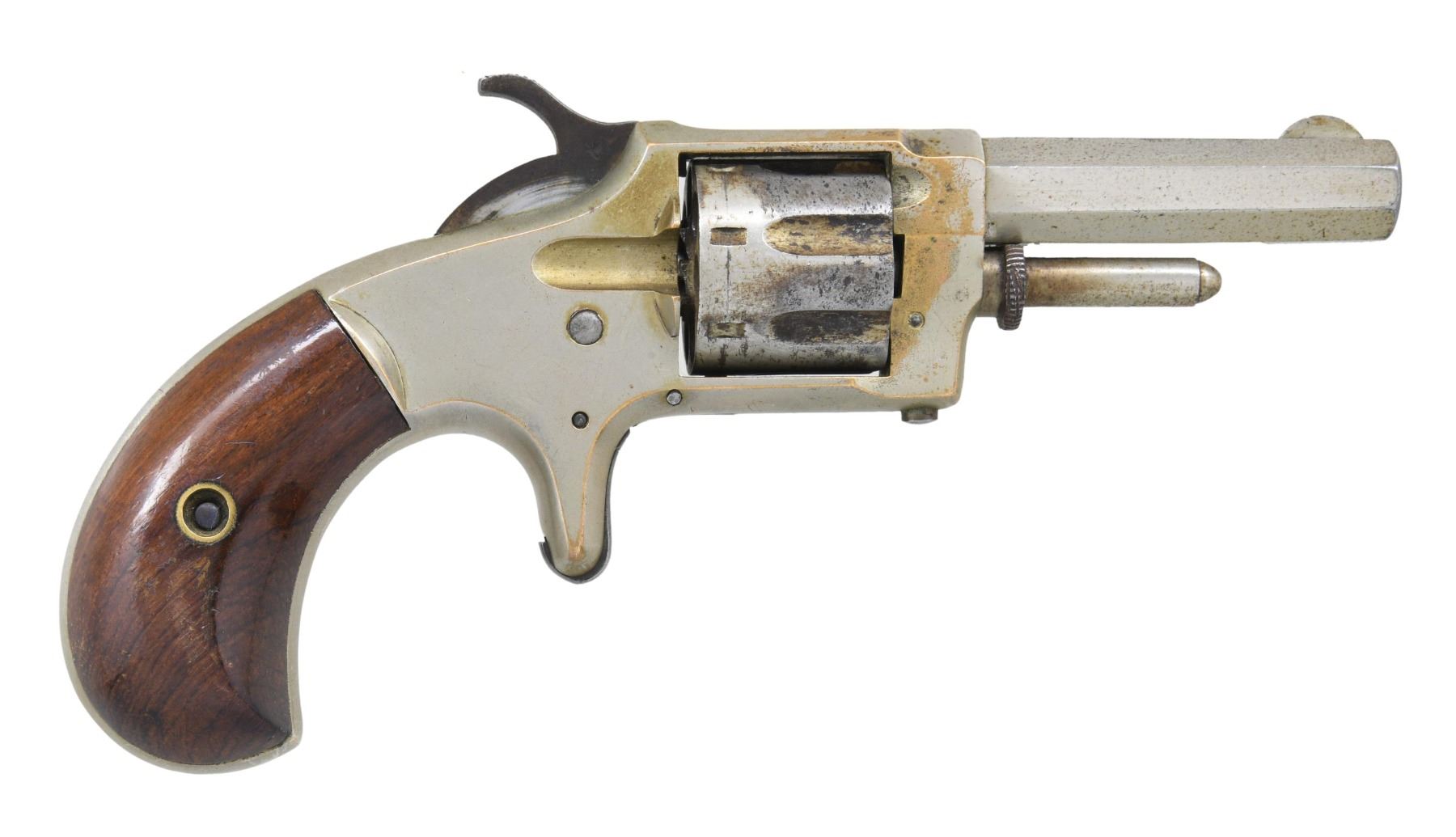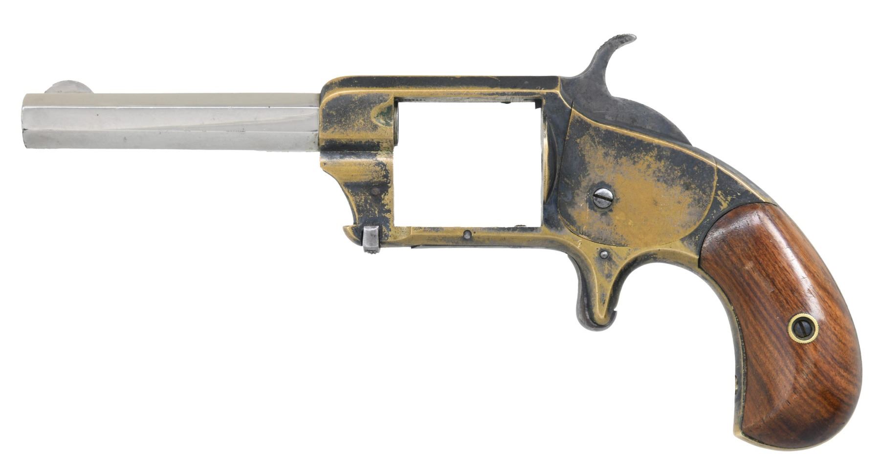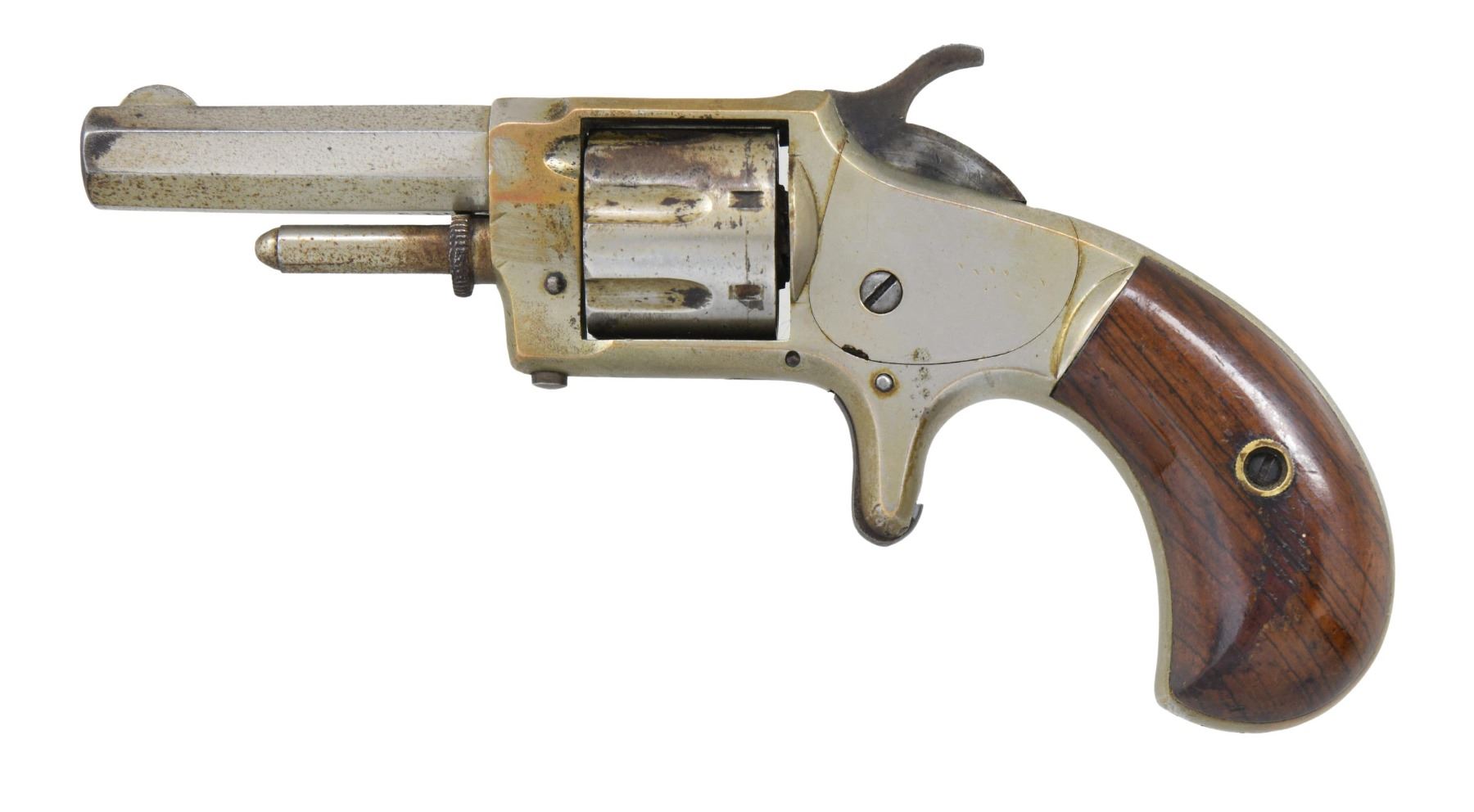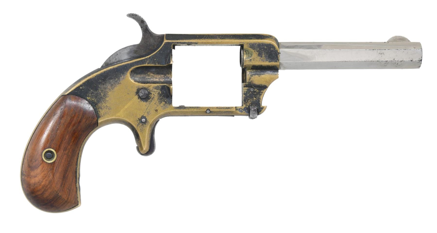 This lot consists of the following revolvers: 1) WHITNEYVILLE NO. 1 Cal. 30 RF. S# 16929. Bbl. 3 3/8". Round blade front sight. Fixed rear sight. Brass frame. Renickeled bbl. Cyl. & ejector rod assemblies missing. Smooth hardwood grips. CONDITION: grips show scattered varnish & handling marks. Bbl. retains most of its renickeled finish with markings appearing faint, scattered oxidation & flaking. Frame is a yellow patina with scattered flaking & oxidation staining. Hammer & trigger are sluggish when hand cycled. Bore shows scattered oxidation but evident rifling. (01-26228/MJC). 2) WHITNEYVILLE NO. 1 SA REVOLVER. Cal. 22 RF. S# 4516A. Bbl. 2 3/8". Round blade front sight. Fixed rear sight. Nickel finish. Smooth hardwood grips. CONDITION: grips have added varnish with some flaking & handling marks. Metal shows scattered flaking, oxidation & varnish overrun. Action appears to function when hand cycled. Pitted worn bore. (01-26229/MJC). BOTH ANTIQUE. $150-250 for pair.