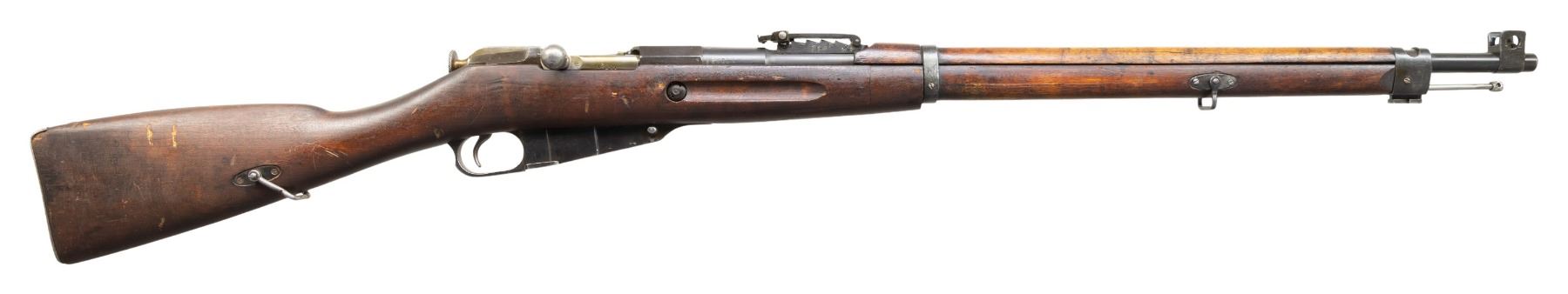 1) Finnish M28 Mosin Nagant Bolt Action Rifle. Cal. 7.62x54R. S# 11781. Bbl. 27" with Marathon import marking. Blade front sight with protective ears. M91 style rear sight with Finnish graduations. Matching numbers on bbl. shank & bolt. Other parts are mismatched as-is typical for Finn Mosins. Bbl. shank has "SY" ""D" & boxed "SA" markings. RIght side of bbl. has lined-out "S56239" Civil Guard District. Arsenal blue finish. Hardwood stock set with bottom mounted sling swivels & rounded finger joints. Cleaning rod present. CONDITION: stock set has arsenal rework finish with a thin 5" crack on handguard, some small plug repairs, a few light gouges, scattered dings, handling marks & scratches. Metal retains 60% arsenal blue with left side of receiver & rear band being cleaned to bright with pitting & oxidation, scattered edge wear, silvering, oxidation & handling marks. Action functions properly when hand cycled. Very good bright bore with a counterbore at muzzle, strong rifling & some light frosting. (25-5816/MJC).
