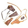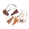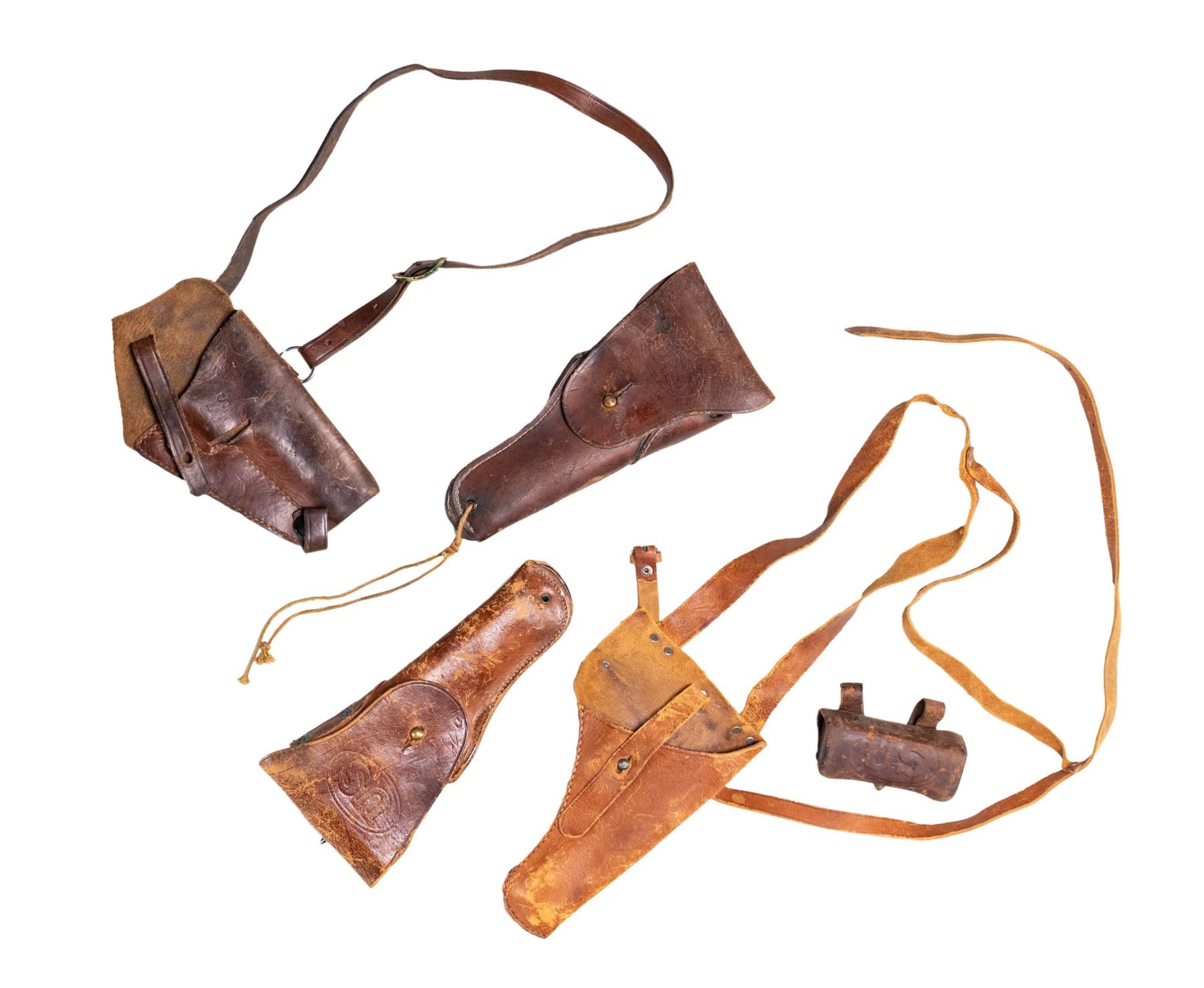 Lot of assorted U.S. M1911 holsters, including: 1) U.S. Model of 1916 M1911 holster mfg. by Clinton. Rear of belt loop is faintly marked "CLINTON" above an indiscernible year of mfg. and inspector initials "C.C.". Closure flap is embossed with "US" within an oval. Brown leather construction with brass rivets, drain/thong hole, stud, and hanger. CONDITION: leather remains malleable, exhibiting scattered marks from handling and storage, as well as varying degrees of age related cracking and crazing overall. 2) U.S. Model of 1916 M1911 holster produced by an unknown mfg. Closure flap is embossed "US" within an oval. No mfg. markings remaining. CONDITION: leather remains malleable, exhibiting moderate age related cracking and areas with varying degrees of crazing. Top of belt loop is torn, with hanger absent. Brass rivets have torn free. 3) U.S. M3 style shoulder holster. Front of body is stamped "U S". Brown leather construction with steel fittings. Rear of holster is marked "57775". CONDITION: leather remains malleable, exhibiting scattered areas of age related cracking and crazing. 4) U.S. M3 black leather shoulder holster mfg. by Western Mfg. Co. Rear is marked "WESTERN MFG. CO./ S.F. CALIF. 7791527". CONDITION: leather remains malleable, exhibiting scattered marks from handling and storage, with soem age related cracking and crazing. 5) Unmarked period custom holster appearing to be for the M1911 platform. Brown leather construction with steel fittings. CONDITION: leather remains malleable, exhibiting varying degrees of age related cracking and crazing overall. 6) U.S. 1896 Pattern .38 caliber revolver cartridge box mfg. by Rock Island Arsenal prior to 1903 (indicated the lack of a year of mfg. marking). Closure flap is embossed with "US" within an oval on the front, with "A15677" stamped on the top, and "69" stamped below the closure flatp stud slot. Rear of body is stamped "ROCK ISLAND/ ARSENAL" above "H.E.K.". Complete with poplar wood 12-rd. cartridge block, stamped "RIA 1903" on one side. CONDITION: leather remains malleable, showing scattered handling marks, light age related cracking, and varying degrees of crazing overall. Stitching on bottom of belt loops has torn free. Brass fittings show areas of verdigris. (02-25799/MLW). NON-GUN. $300-500.