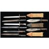 This lot consists of the following US bayonets & knives: 1. US 1892 KRAG BAYONET. Bayonet measures 16 3/8" overall with 11 1/2" blade. Blade is dated 1901 & has US markings. Brightly finished metal parts with smooth walnut handles. Steel scabbard. CONDITION: metal parts of bayonet remain partially bright with scattered light pitting, oxidation & some dings. Walnut grips show a few chips, dings & some handling wear. Scabbard appears arsenal reblued with scattered pitting, oxidation & fading. 2. US 1892 KRAG BAYONET. Bayonet measures 16 3/8" overall w/ 11 1/2" blade. Blade is dated 1901 & has US markings. Matte black reworked finish. Blade has "US" marking & 1901 date. Hardwood handles. Steel scabbard with swivel belt hook. CONDITION: metal shows areas turning gray with edge wear, fading & oxidation. Handles show some dings & handling wear. Scabbard is a dull gray patina with scattered oxidation. 3. US 1892 KRAG BAYONET. Bayonet measures 16 3/8" overall with 11 1/2" blade. Blade is dated 1899 & has US markings. Brightly finished metal parts with smooth walnut handles. Scabbard with swivel belt hook. CONDITION: metal parts of bayonet are turning to a gray patina with scattered oxidation & some dings. Walnut grips show a couple light chips, some gouges, dings & handling marks. Scabbard is mostly a dull gray patina with oxidation. 4. US 1917 BOLO KNIFE. Blade is dated 1918 & maker marked by "A.C.CO.". Parkerized finish. Hardwood grips. Green canvas scabbard. Scabbard shows overall silvering. Other metal parts are a dull gray patina with oxidation, pitting & dings. Grips have a carved "X" on one panel, scattered dings & handling marks. Scabbard shows scattered staining & flaking. 5. US 1917 BOLO KNIFE. Altered US 1917 bolo knife altered with slimmer profile & partially removed US markings. Hardwood handles. Tan canvas scabbard. CONDITION: blade is mostly a gray patina with large areas of tool markings, removed areas, oxidation & dings. Crossguard is missing. Grips show long cracks, chips, gouges, dings & handling marks. Scabbard shows scattered staining & soiling. 6. US M1917 BOLO KNIFE SCABBARD. Tan canvas covered steel scabbard. CONDITION: scabbard shows some flaking & staining. (02-21222-2/MJC). $300-500.