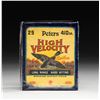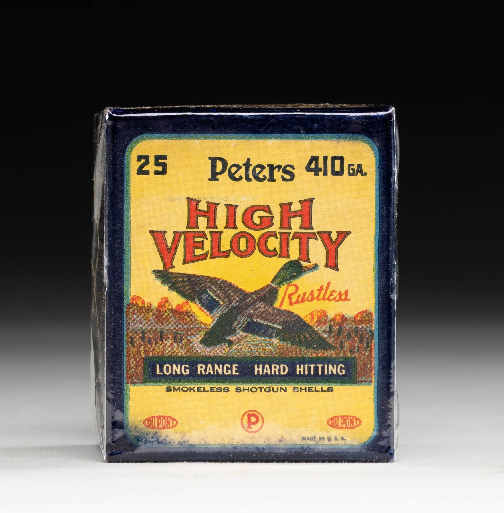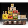 1) 3- boxes .410 Peters Rustless blue boxes having white labels printed High Velocity with flying duck in shrink wrap. CONDITION: 1 - very fine, 1- with bumped corner, 1- good considerably chipped wrapped in masking tape. 2) 3- boxes 16 gauge Peters with yellow labels marked High Velocity over flying duck. CONDITION: 1- fine; in shrink wrap with chipped corners, 1- good; considerably chipped and lightly soiled, missing 2 cartridges, 1- good; with lighter colored label considerably chipped and lightly soiled. 3) 1- Remington Express 16 gauge red and green box, missing about 10 cartridges. CONDITION: fair to good. 4) 1- Remington Sure Shot 16 gauge red and green box, plastic hulls, missing about 6 cartridges. CONDITION: good. 5) 1- Remington Sure Shot 12 gauge red box, plastic shells. CONDITION: very good. 6) 1- Try-Test 12 gauge box marked in magic marker marked "12 gauge blank black powder". CONDITION: very good. 7) 1- Brown cardboard box holding 9- 8 gauge black powder shells by Game Bore. CONDITION: very good. 8) 1- Box 12 gauge Russian shot shells; 4- unfired, 3 empty. CONDITION: good. 9) 1- Leather bandoleer holding 24 various shot shells. CONDITION: good. 10) 5- Early empty shot shells; 3 printed with duck scene. CONDITION: good. PROVENANCE: From the Private Collection of Berrien Moore III. (02-25870-13/MGM). $100-200.