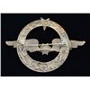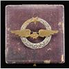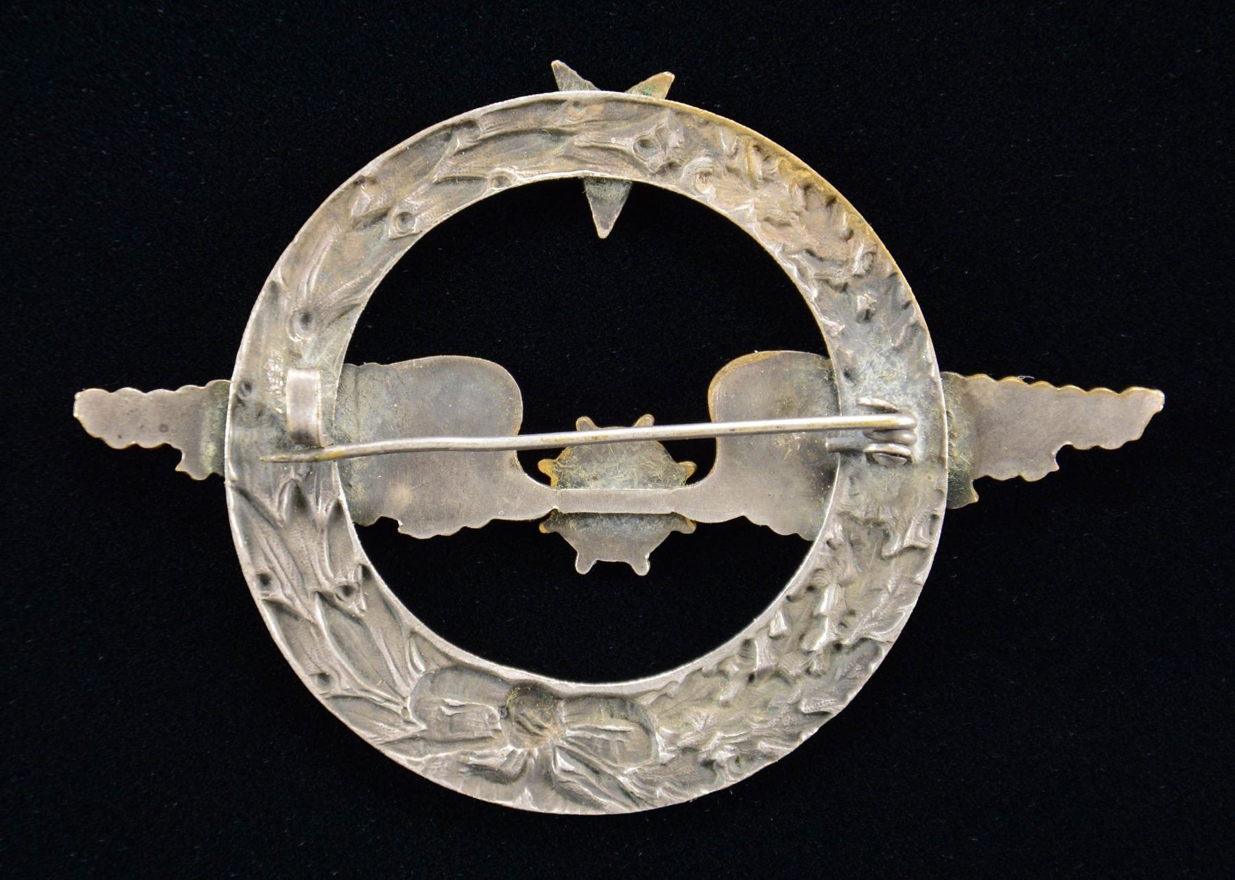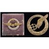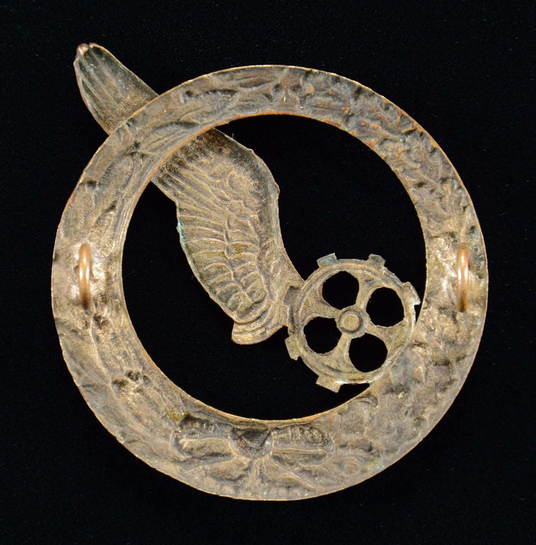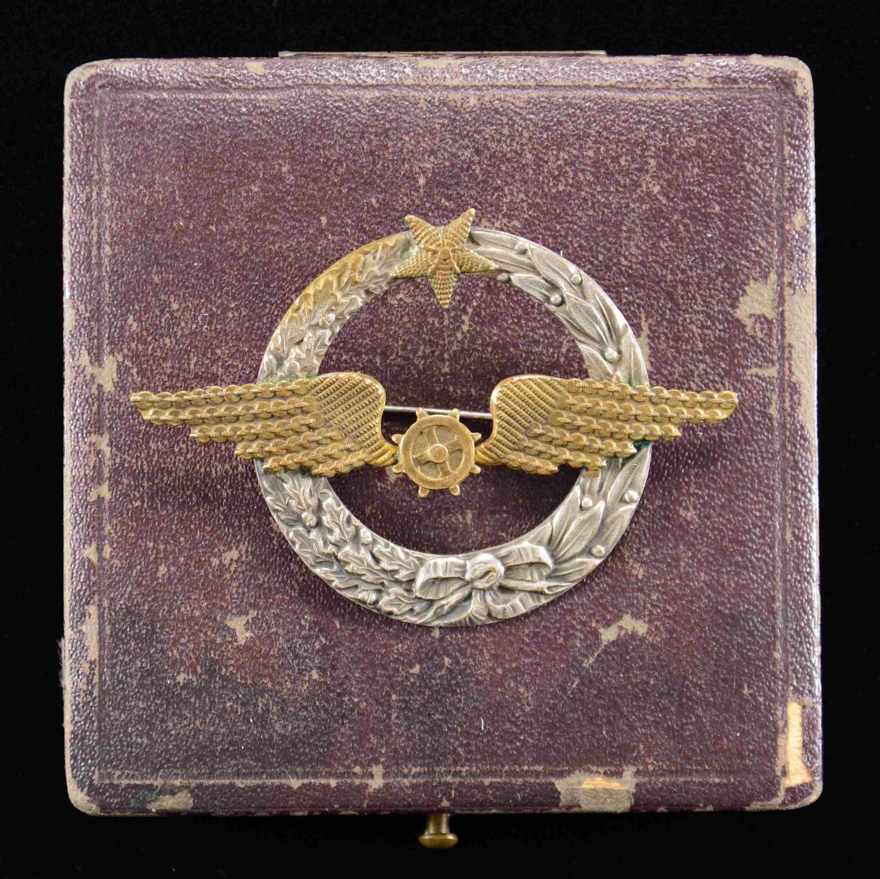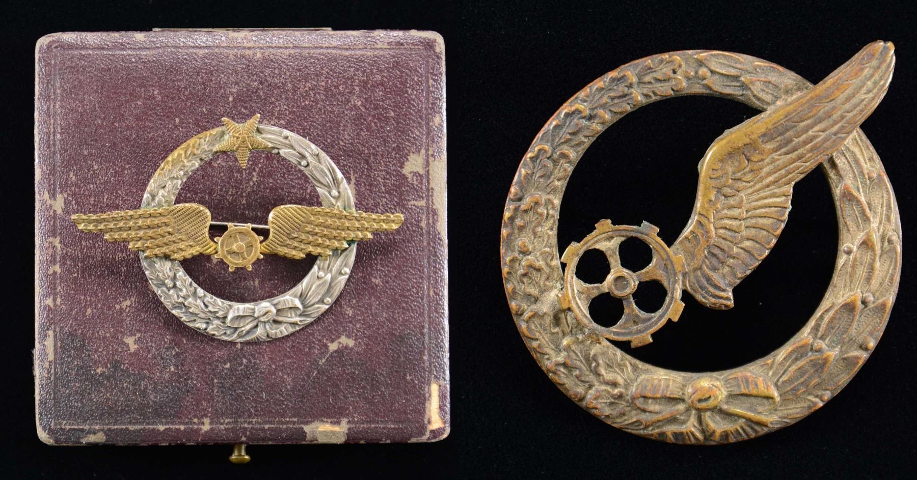 INSIGNIA. 1) Pre-WWI French Balloon Mechanics badge measures approx. 2 1/2" x 1 3/4". This pre-1916 badge has a silver-finished wreath with gold-plated wings and star and depicts a pair of bird wings with a central toothed gear and a star above, all superimposed over an oak and laurel leaf wreath. The rear of the badge has a pin attachment and is unmarked. The badge is housed in a dark red leather case with no interior or exterior markings. CONDITION: badge shows light overall wear. (02-22994/BF). 2) WWI era French Balloon Observer's badge measures approx. 2" x 1 5/8". This 1912-1916 badge has a silver finish and depicts a toothed gear with a single bird wing to the right, superimposed over an oak and laurel leaf wreath. The rear of the badge has two loops for attachment and is unmarked. CONDITION: badge shows light to moderate wear overall with some loss of finish. (02-22995/BF). 3) Two gold bullion on black cloth French aero insignia from WWI to the 1920s. The insignia features a winged anchor with a small central star. The reverses have a cream-colored backing material. CONDITION: wings show light wear. (02-23007/BF). 4) Varied group of cloth insignia features 5 sets of aviation wings. / 1 Shoulder tab. / 2 Red flaming bomb insignia on black. / 1 Bullion flaming bomb insignia on red. / 1 Flaming bomb insignia on blue. / 1 Bullion star on red. / 2 Bullion anchors on black. / 1 Silver bullion flaming bomb on black. / 1 Red felt flaming bomb insignia. / 2 Bullion flaming bomb collar tabs. / 2 False embroidered number "5" insignia on light-blue collar tabs. / 2 Bullion insignia on black. / 4 Various sleeve rank insignia. / 1 Section of British medal ribbon. CONDITION: insignia generally shows light to moderate wear with some insect damage. (02-23008/BF). $300-500.