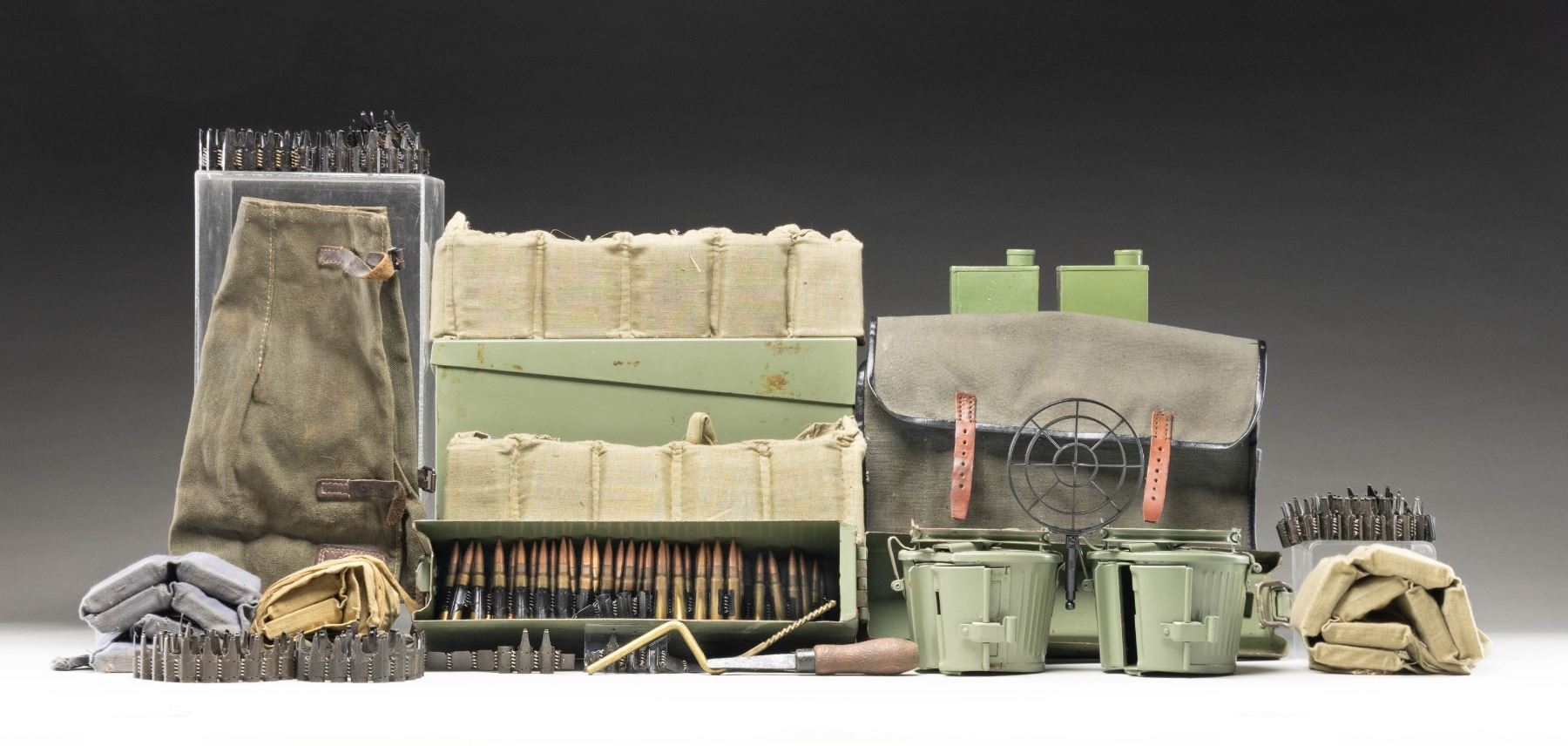 & MACHINE GUN ACCESSORIES. Lot of World War II era bandoliers, ammunition, and MG34/MG42 accessories, including: 1) x3 Turkish 7-cell tan cloth bandoliers, each containing 70-rds. (210-rds. total) of period dated Turkish 8mm Mauser ammunition. 2) x1 Turkish 7-cell khaki cloth bandolier, containing 30-rds. of period dated Turkish 8mm Mauser ammunition. 3) x1 Turkish 7-cell blue cloth bandolier containing 60-rds. of period dated Turkish 8mm Mauser ammunition. 4)x1 empty German WWII pattern ammunition can. 5) x1 German WWII pattern ammunition can containing approx. 150-rds. of belted Egyptian 8mm Mauser ammunition. 6) x4 MG34/MG42 50-rd. belts. 7) x1 German WWII MG42 machine gun canvas cover. 8) x1 Yugoslavian M53 canvas gunners tool / oiler pouch with accessories. 8) x2 Yugoslavian M53 50-rd. basket mags. 9) x1 reproduction MG42 anti-aircraft "spider" sight. CONDITION: individual items exhibit varying degrees of wear, with some holes present in the Turkish bandoliers. Ammunition shows some age related discoloration, but otherwise appears serviceable. Ammunition cans exhibit scattered handling marks, scratches, and flaking, with areas of oxidation. (02-25548/MLW). AMMO. $800-1,200.