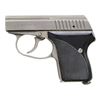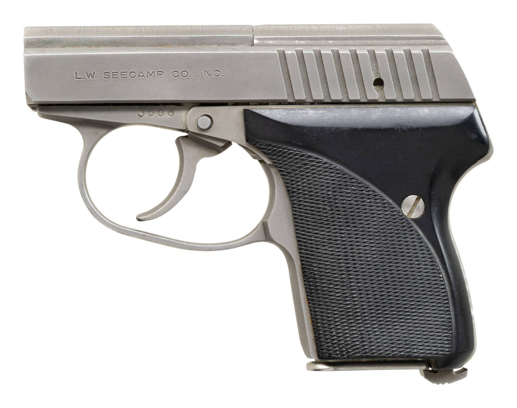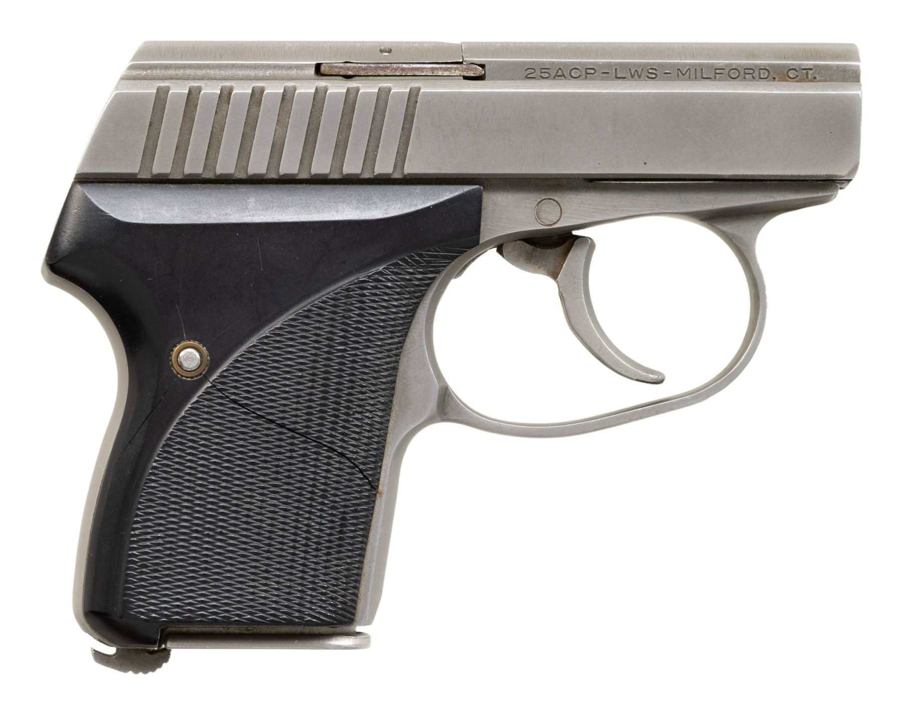 Cal. 25 ACP. S# 3608. Bbl. 2". Left side of bbl. has LWS Milford, CT address. Stainless finish. Checkered black plastic grips. MAGS: 1-7 rd. CONDITION: right grip panel shows a long crack extending from top to edge of checkering that appears repaired. Grips otherwise show light handling marks. Metal shows scattered handling marks, edge & carry wear. Action functions properly when hand cycled. Very good bore with strong rifling. (25-4297/MJC). MODERN. $300-400.