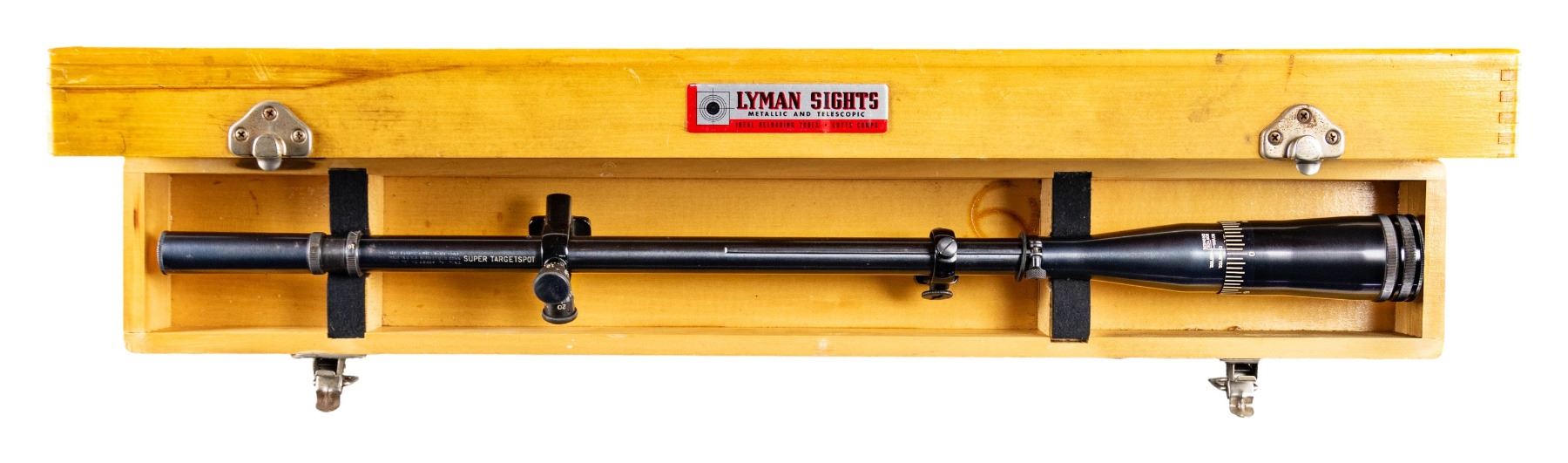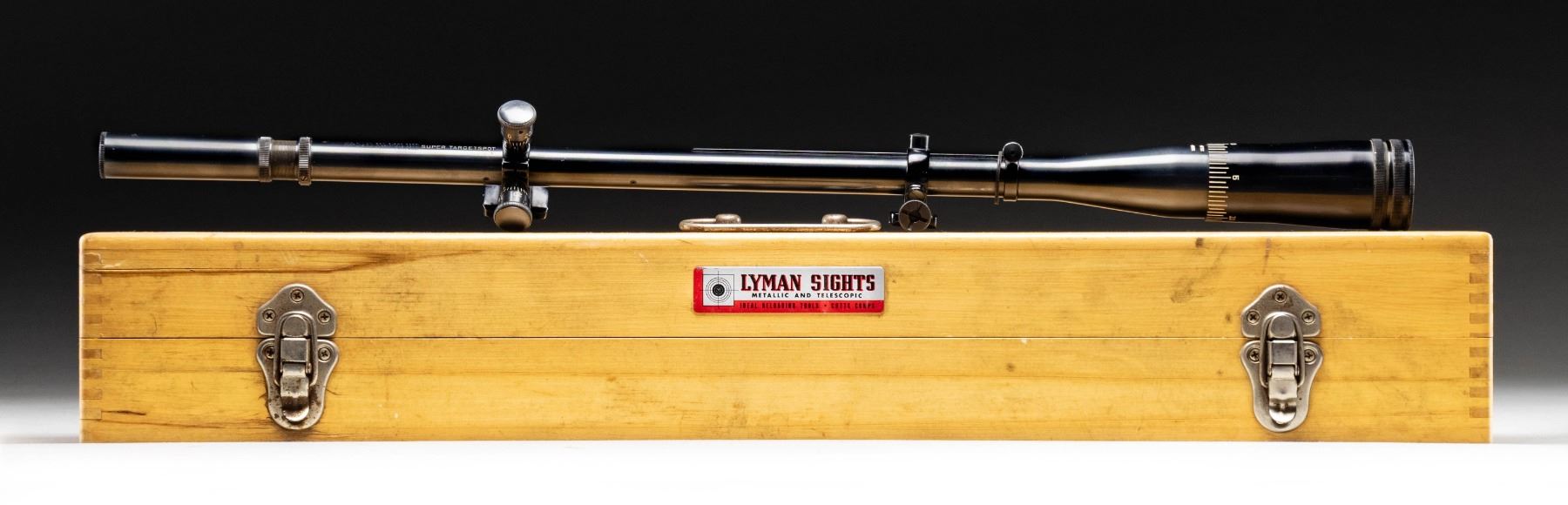Classic top of the line Lyman target scope having blued finish and black anodized Lyman target mounts. Features factory screw in lens caps and extremely vivid white range markings. Without recoil spring but has rubber cushion between front ring and its stop. Optics are near excellent being clear with no inclusions. Exterior has some spots of cleaned peppery oxidation near the "10" marked reticle ring and on the eyepiece; balance is near excellent. Lyman labeled carry box with padded supports on the interior. Exterior shows finger joints on the corners. Hasp style latches plus carry handle on top. Box is structurally fine with very good appearing interior having good exterior with handling marks and light oxidation on carry handle assembly that is brass plated steel; latches of the same material, but good. PROVENANCE: Norman Olliff Estate. (02-25108/NW). $450-600.