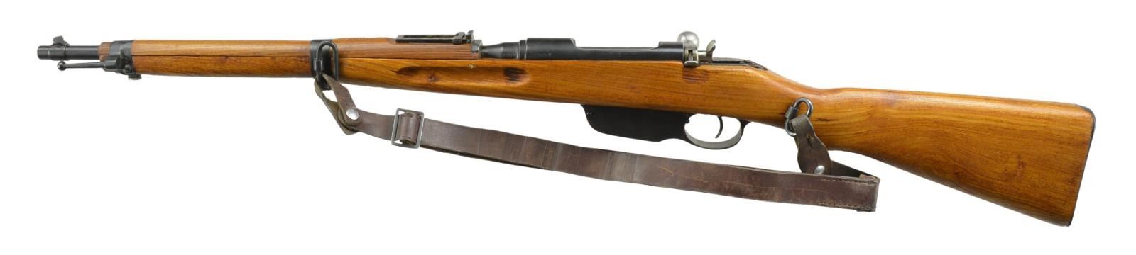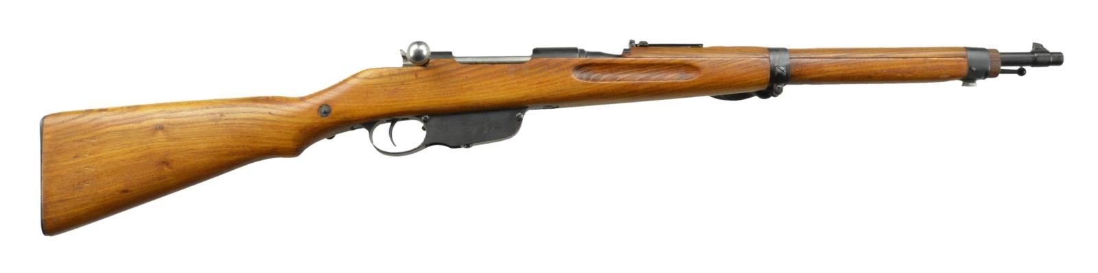 STYER MANNLICHER 1895 STRAIGHT PULL RIFLE. Cal. 8x56R. S# 7676V. CAI import marked bbl. Arsenal cut for 19.5" w/ Vienna 1917 proofs & "S" indicating conversion to 8x56R cartridge. Band mounted blade front sight & long rifle rear sight converted to 2200m Stutzen. Top of receiver ring appears to have previous proofs grounded off. Matching numbered bbl., bolt (electro pencil) & replacement ill fitting stock set w/ matching numbered applied. Stock has stacking bar, bayonet lug, & side sling swivels. Right side of buttstock has previous S# crossed out along w/ top top of comb by buttplate marked w/ boxed "3" & an illegible box marking. Brown leather sling. CONDITION: very good overall as arsenal refinished w/ wear, oxidation & marks. Gaps at tangs due to arsenal replacement stocks. Stock has gouges. Good sling w/ wear & flexing. bottom of bayonet lug appears to be grounded off slightly. Fair bore w/ strong rifling. (22-612/MD). CURIO. $300-500.
