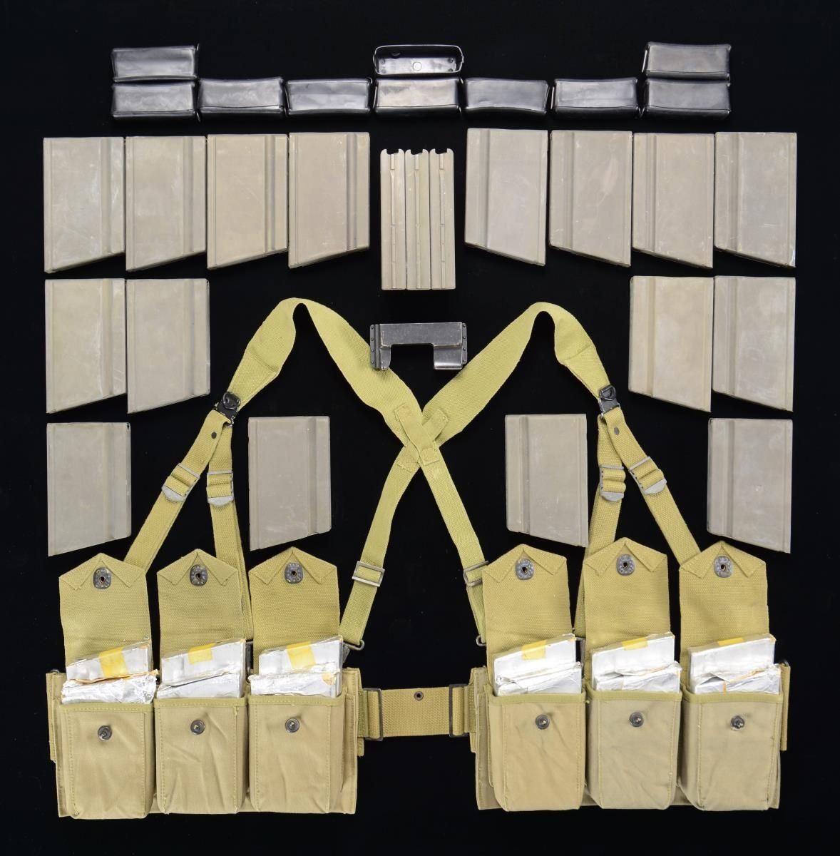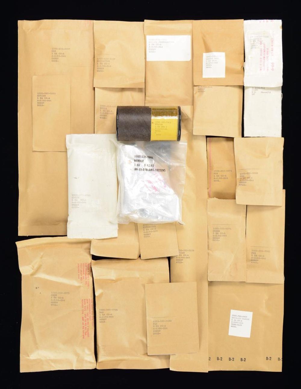 This lot consists of the following M1918 BAR items: 1. 31 20-rd. BAR mags. Some mags are new in their wrapper but overall rate good to very good. 2. WW2 era six pouch BAR belt. CONDITION: good to very good. 3. BAR mag loader. CONDITION: metal retains a high degree of finish but shows scattered oxidation. 4. 14 various USGI BAR accessories & parts. Among the parts are several rubber mag covers, a combination wrench & spare carry handle. CONDITION: majority of these items are sealed & in like new condition. (02-22280/MJC). $800-1,200.