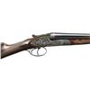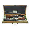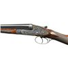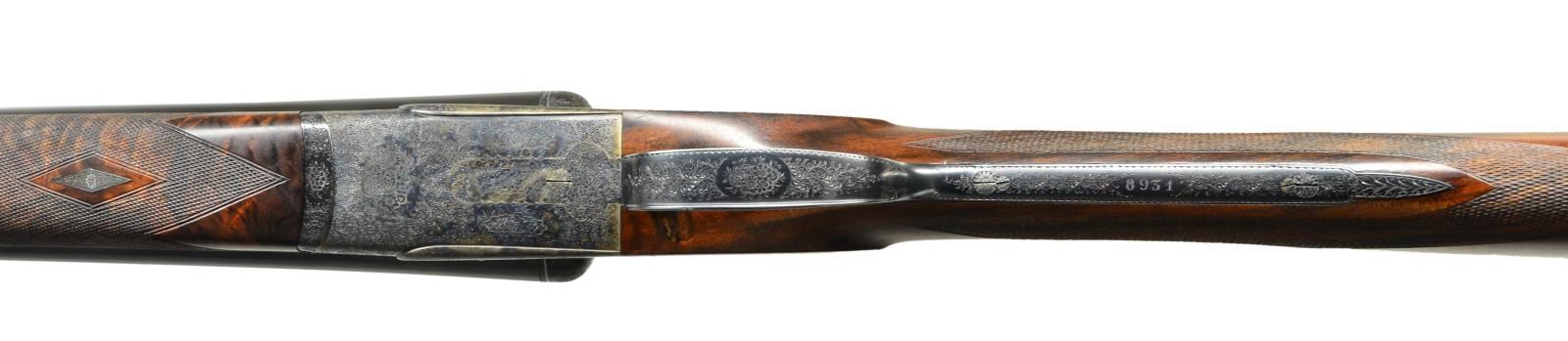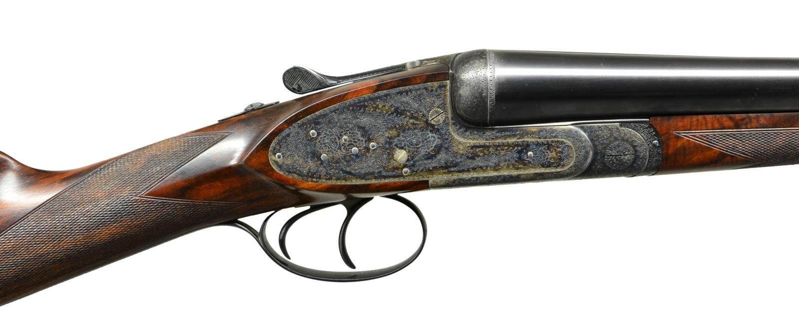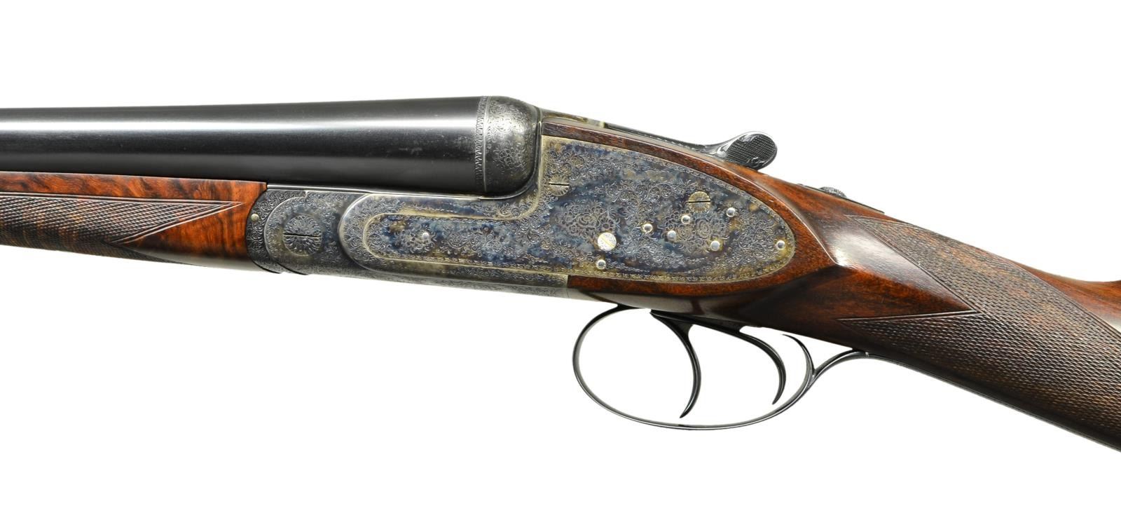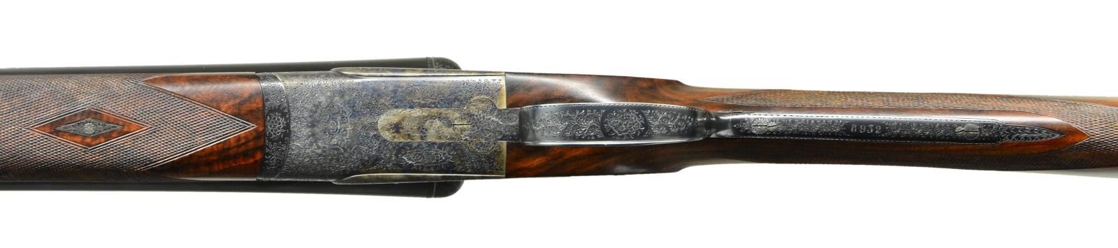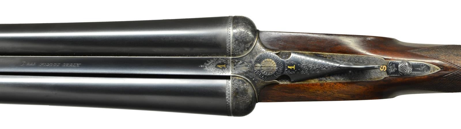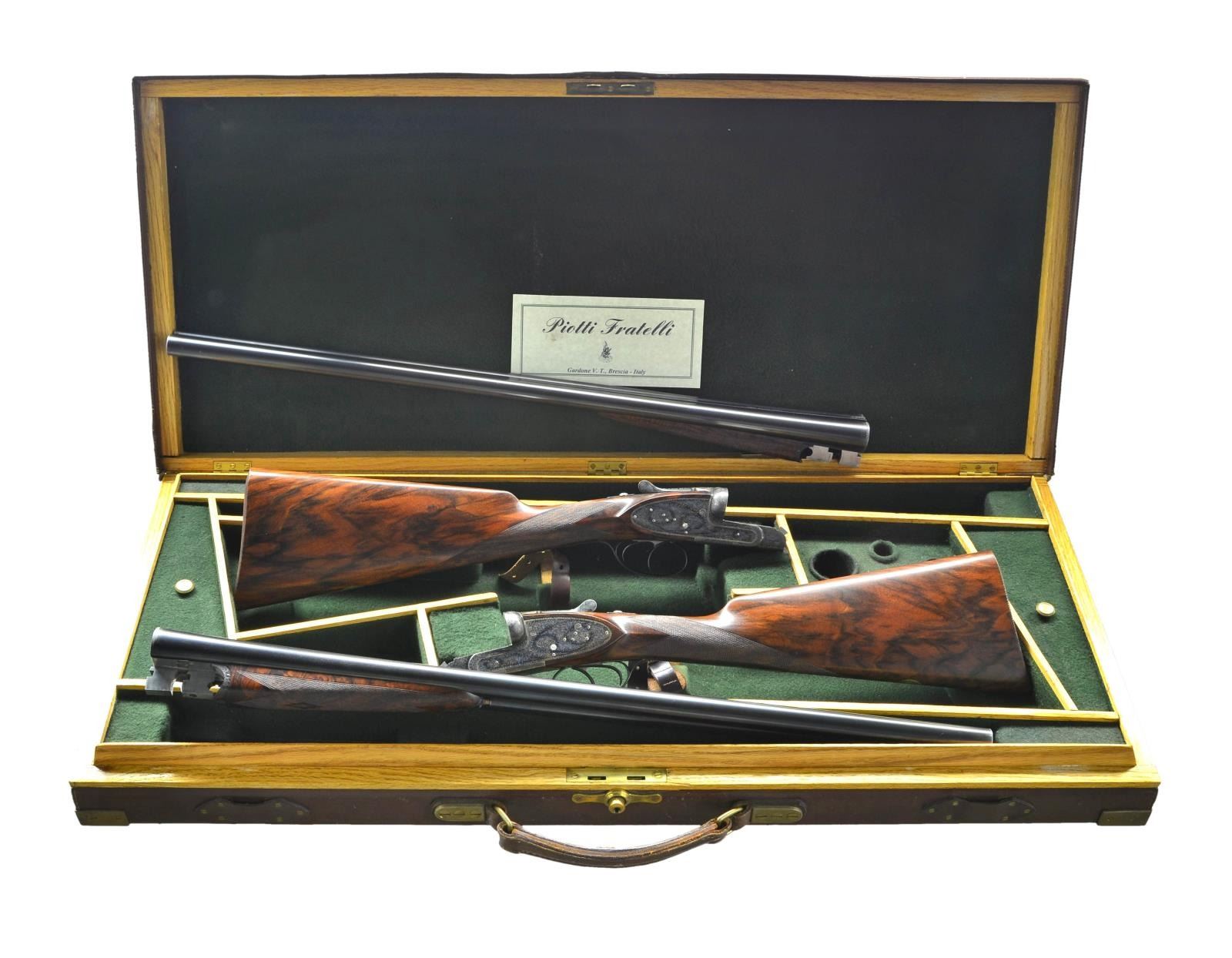 SIDELOCK SHOTGUNS HOUSED IN ORIGINAL OAK AND LEATHER MAKER'S CASE. Cals. 12 Ga 2-3/4’’. S# 8931 & 8932. Piotti Fratelli of Brescia, Italy has established a reputation for making some of the finest guns in the world since their inception in 1955. The King Grade is a best quality gun on the H&H pattern action with chopper lump bbls. and offer the finest in workmanship. The case colored actions feature full coverage fine English style scroll engraving with floral bouquets. The engraving extends to the forearm iron and breech end of bbls. Features include gold bar marked pin type cocking indicators, double under lug locking, selective ejectors & double triggers. Right edge of long tang trigger guards are rolled. Bbls. 27’’ with concave solid ribs and brass beads. Ribs are marked “Flli. PIOTTI ITALY”. Splinter forearms with Anson releases and straight hand stocks of outstanding exhibition quality European walnut having marbled figure with rich orange, brown and black tones. Forearm and wrist have generous coverage of fine point pattern hand engraving. Toelines of stocks have brass nameplates with initials “P.J.G.”. LOP: 14-3/4’’ to checkered butts. DAC: 1-1/2’’. DAH: 2-1/4’’. Near neutral casts. WEIGHTS: 6 lbs, 7.4 ozs. (Gun No. 1) S# 8931. Breech end of bbl., top lever and forearm tip escutcheon are marked with gold no. “1”. Bore diameter: RT .724, LT .724. Choke constriction: RT .006, LT .017. Minimum wall thickness: RT .033, LT .032. (Gun No. 2) S# 8932. Breech end of bbl., top lever and forearm tip escutcheon are marked with gold no. “2”. Bore diameter: RT .724, LT .724. Choke constriction: RT .006, LT .017. Minimum wall thickness: RT .033, LT .032. Bbl. date codes indicate 1991 mfg. W.L. Moore import marked. UNATTACHED ACCESSORIES: maker’s oak and leather case with green felt fitted interior. Inside lid has Piotti Fratelli label. Case is in near excellent shape, its original green canvas cover shows light wear. CONDITION: very fine. Both guns are in exceptional condition and retain over 98% blue and case colored finish. Near excellent original wood finish shows very few miniscule handling marks. All bores are bright and near excellent. (23-712 & 23-713/DS). MODERN. $40,000-55,000.