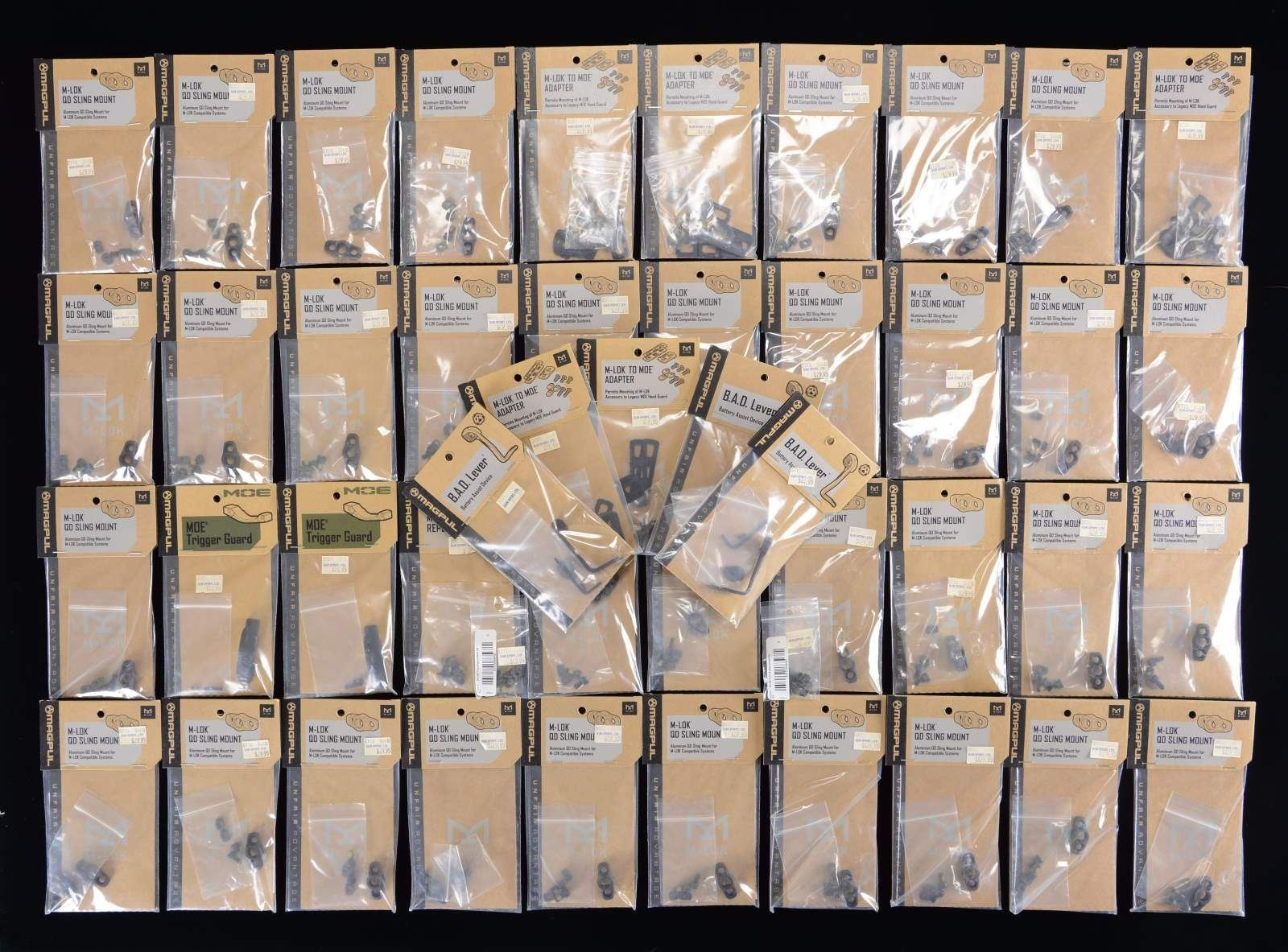 1 lot of several Magpul parts, wrapped individually in factory retail packaging. Lot includes the following: 1) 34 M-LOK QD sling mounts. Part # MAG606-BLK. 2) 5 M-LOK to MOE adapters. Part # MAG478-BLK. 3) 3 B.A.D. levers. Part # MAG980-BLK. 4) 2 MOE trigger guards. Part # MAG417-BLK. 5) 1 M-LOK T-NUT replacement set. Part # MAG615-BLK. CONDITION: all parts appear to be new, in factory retail packaging. PROVENANCE: the Collection of Gun Sport Ltd owned by Jon R. Thomas. (02-20847-1/JZ) $400-800.