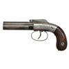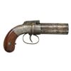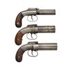 PERCUSSION PEPPERBOX PISTOLS. 1) MANHATTAN ARMS CO. Cal. 28. S# 5. Bbls. 3" three shot fluted smooth bore cluster. Flutes are marked "MANHATTAN ARMS MFG CO NEW YORK" & "CAST STEEL". Rnd. boxlock bar hammer action w/ conventional trigger & trigger guard. Action has highlights of scroll engraving. 2 Piece walnut bag type grips. CONDITION: bbl. finish has faded to a light brown patina. Action has bright finish showing areas of surface corrosion. Bbl. functions by manual turning. Grips show moderate wear w/ dents & handling marks. Bores show spots of light pitting. (01-18923/DS). 2) ALLEN & THURBER WORCESTER. Cal. 31. NSN. Bbls. 3 3/4" six shot fluted cluster w/ smooth bores. Bar hammer marked "ALLEN'S PATENT / 1845". Rnd. body boxlock action w/ nipple shield, conventional trigger & trigger guard. Action & nipple shield have highlights of scroll engraving. 2 Piece walnut bag type grips. CONDITION: metal has faded gray appearance showing spots of light pitting & surface corrosion. Bbl. rotates & cycles properly. Bores show some light pitting. Grips shows wear w/ spots of darkening having scattered scratches & marks. (01-18930/DS). 3) ALLEN & THURBER WORCESTER. Cal. 31. NSN. Bbls. 3 3/4" six shot fluted cluster w/ smooth bores. Bar hammer is marked "ALLEN'S PATENT / 1845". Rnd. body boxlock action w/ nipple shield, conventional trigger & trigger guard. Action & nipple shield have highlights of scroll engraving. 2 Piece walnut bag type grips. CONDITION: metal has worn mottled gray appearance w/ spots of pitting & surface corrosion. Bbls. rotate & action cycles properly. Bores show some light pitting. Grips show heavy wear w/ handling marks showing lg. chips along action & front grip strap. (01-18933/DS). ALL ANTIQUE. $1,000-1,400.