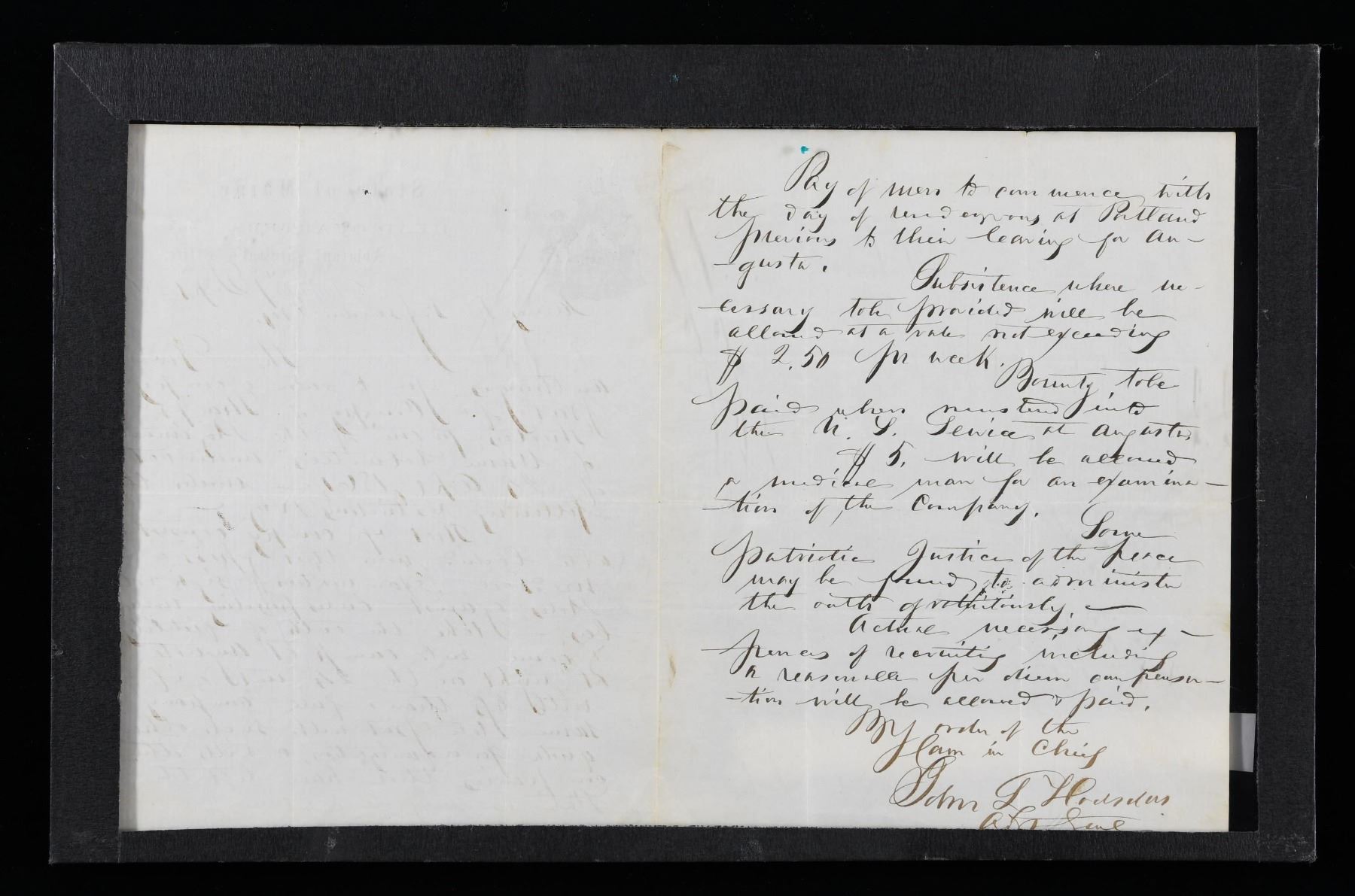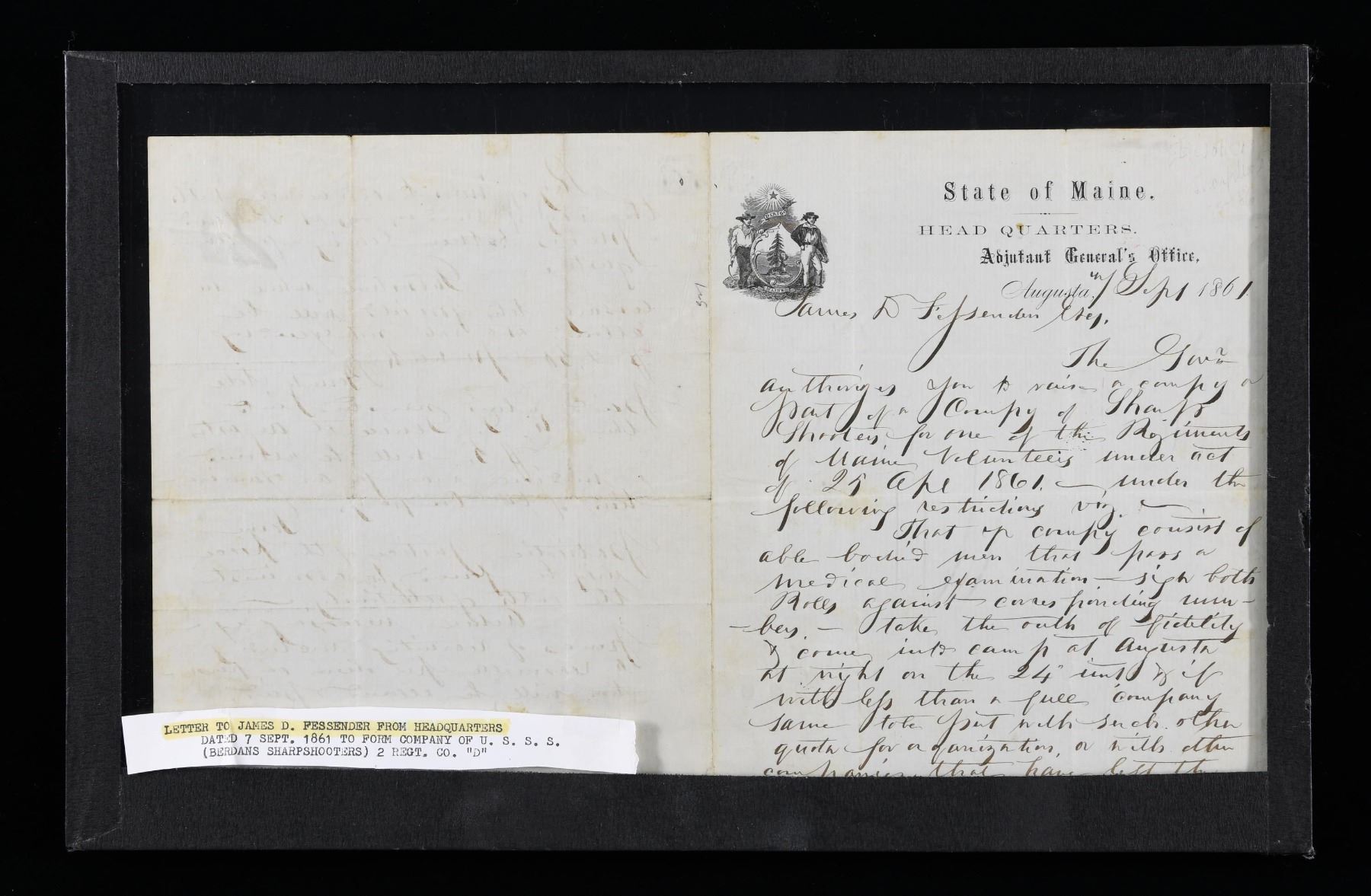 This fine letter is on stationary from the Maine Adjutant General's Office and is dated 1 September of 1861. The letter was written to James D, Fessenden from Maine Adjutant General John l. Hodson. It concerns thw formation of a Sharpshooter unit with Maine troops. The letter is pressed between 2 panes of glass and can be read from both sides. CONDITION: the letter is in fine condition and is quite easily read. (02-24525/BF). $200-400.