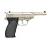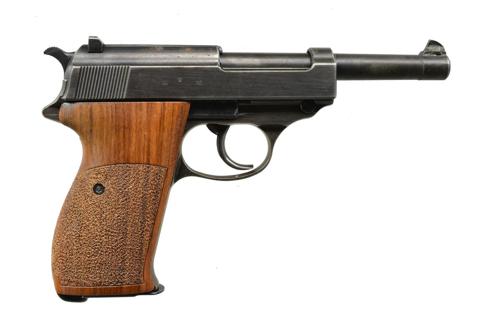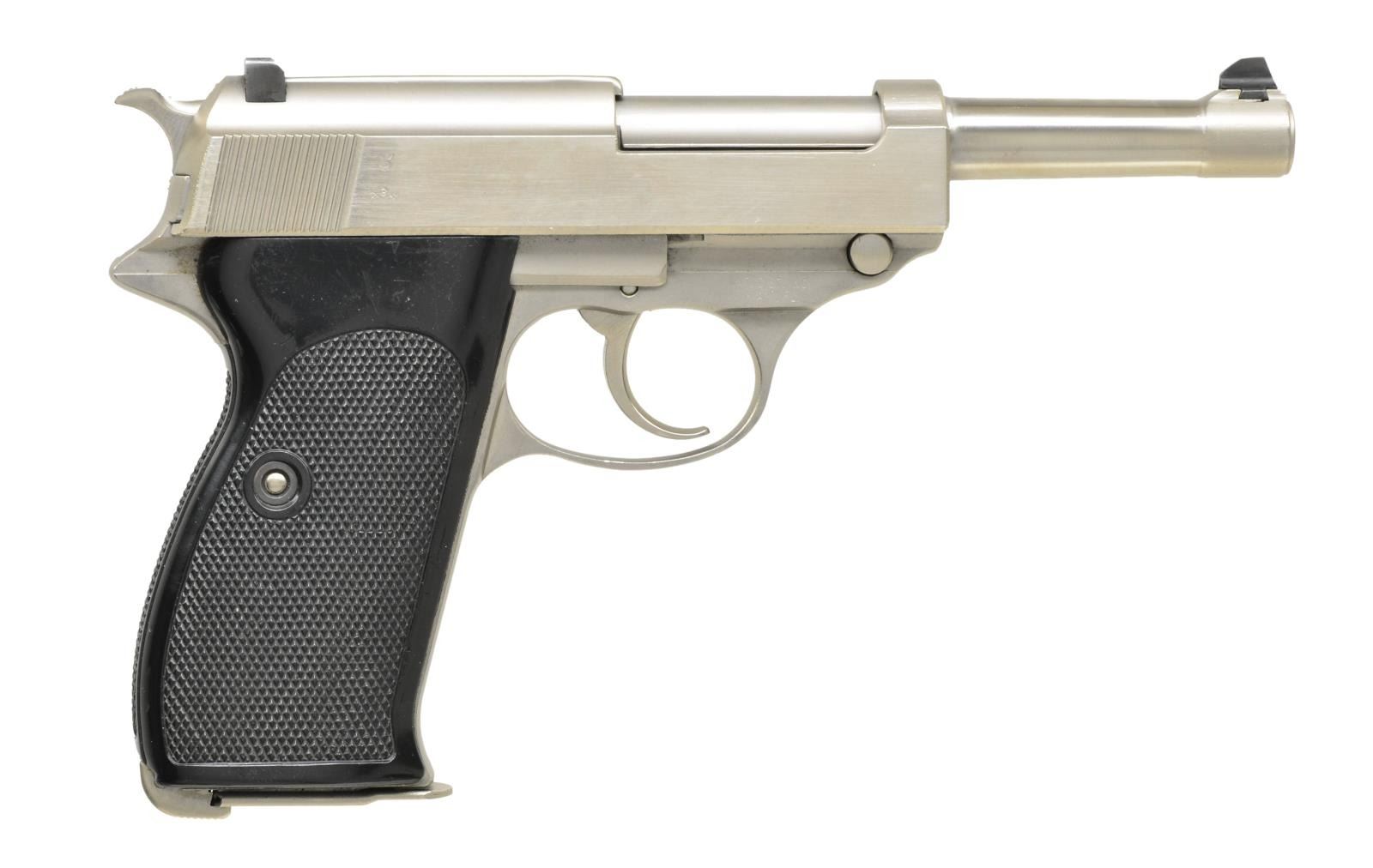 BOTH: 9x19mm (9mm Luger). Matching numbered slides & 5" bbls. 1) MANHURIN P1. S# 236363. Satin nickel plated w/ right side of slide having crossed cannons under "3". Left side of slide & frame have circle dot Bundeswehr proofs. Locking block marked "D4". Checkered black plastic grips w/ slight thumb recess on left. Blued sights. MAGS: 1 matching finished P1 marked 8 rd. CONDITION: generally near excellent appearance including bore & grips, but sm. gray spot of finish loss on bottom of trigger guard & another very sm. spot on front strap. (20-1830/NW). MODERN. 2) WALTHER (ac 43) P38. S# 4700k. Locking block matching numbered. Eagle 359 proofed. Very nice replacement wood grips w/ stippling rather than checkering & RH thumbrest. MAGS: 3 P38 marked 8 rd.; 1 very good w/ light wear on base plate, 1 good w/ peppery oxidation on base plate numbered "1422", 1 good plus. CONDITION: good plus general appearance w/ light peppery oxidation mostly on right side of slide & on bbl. Near excellent grips. Poor to fair bore w/ wear & even light to moderate pitting. (20-1831/NW). CURIO. $700-1,000.