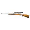 ACTION RIFLE. Cal. 30-06. S# 40390. Bbl. 22 1/2" light sporter weight. Band mounted ramp front sight with brass bead. Island mounted express rear sight with 1 standing & 1 folding leaf. Pecar German 3-9x32 gloss finished scope with European 3 post reticle on Steyr factory engraved mounts. 2 Lug action with butterknife bolt handle. Bolt mounted & right side receiver mounted safeties. Gold finished double set trigger. Action, floorplate, trigger guard & bolt handle have Arabesque scroll hand engraving with fancy borders. Mag. floorplate features a deep relief engraved bighorn sheep & trigger guard bow has a deep relief engraved antelope head. Monte Carlo cheekpiece sporter stock with sling swivels, black forearm tip & grip cap having white line spacers. Forearm & wrist have extensive oak leaf hand carving against stippled backgrounds. LOP: altered to 14 5/8" over black ventilated white line aftermarket pad. Weight: 8 lbs 14.2 oz with scope. MAGS: 1 detachable 4 rd. rotary mag. UNATTACHED ACCESSORIES: leather muzzle cover. CONDITION: over 90% original blue showing light carry wear on mag. floorplate. original wood finish shows areas of finish wear with darkened appearance along with scattered small marks.  Bright near excellent bore. Scope has bright optics. (22-5383/DS). CURIO. $3,000-5,000.