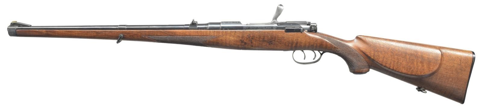 Cal. 30-06. S# 35438.Bbl. 20" tapered rnd., fitted w/ 1 standing & 1 folding leaf rear sight & silver bead in front ramp. MCA type Mannlicher action w/ swept bolt handle, side safety & removable sideplate for scope mounting has correct markings & cal. on receiver ring & is fitted w/ dbl. set triggers. Stoeger & Steyr marks are on floorplate. Capped pistol grip stock of fiddle figured European walnut features plastic buttplate, point pattern checkering at grip & forend & usual Mannlicher type steel muzzle cap & bail front sling loop. CONDITION: metal parts retaining approx. 80% of their original blue w/ considerable flaking & freckling on floorplate. Stock w/ a lot of what appears to be original finish, has had buttplate replaced & Monte Carlo comb lowered. There are repairs to cracks in action area. Removable sideplate is a thicker replacement filling void in stock w/ removal of scope mt. Bore appears to be very good, but dirty. Action is smooth. Triggers work. (21-2478/MGM). CURIO. $500-800.