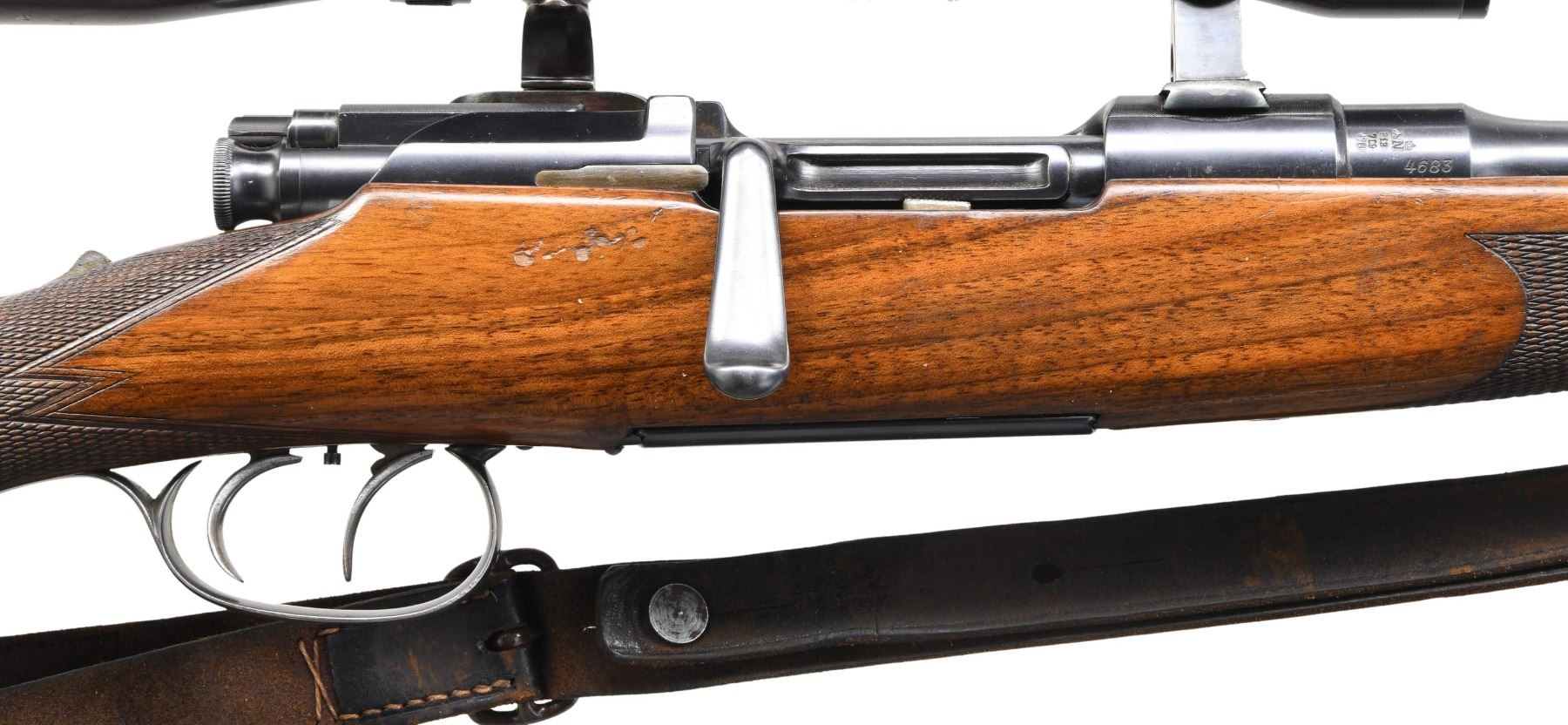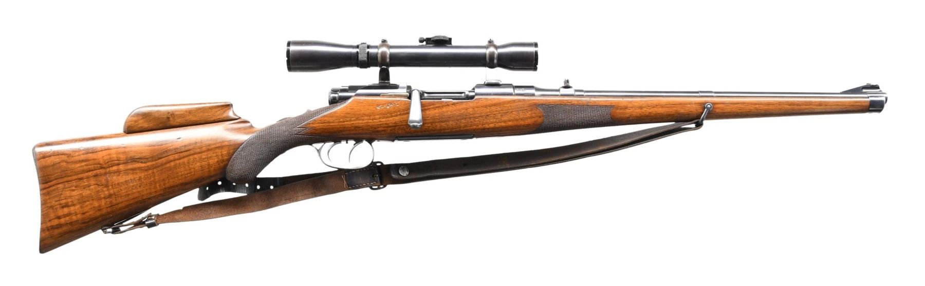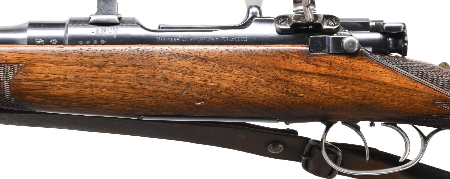 Cal. 6.5x54mm MS. S# 4089. Bbl. 17.7". Bbl. & receiver has Vienna & German proofs. Ramp mounted German silver bead front sight, rear sight w/ 1 standing & 1 folding rear leaf along w/ a folding tang sight. Dr. W. Gerard German scope w/ 3 post & dot reticle on see through claw mounts. Action features butterknife bolt handle & double set triggers. Full length mannlicher style fancy walnut stock w/ adj. walnut cheekpiece in comb. Other features consist of steel nose cap, swivel loops w/ sling & grooved steel cartridge trap buttplate. MAGS: 1 detachable 5 rd rotary. UNATTACHED ACCESSORIES: 4 piece cleaning rod held in stock compartment. CONDITION: 95% lightly worn blue. Original stock finish shows wear spots w/ scattered small dents, scratches & marks. Sound action & double set triggers. Very good bore. Scope has clear optics. (24-4587/DS). CURIO. $2,500-3,500.