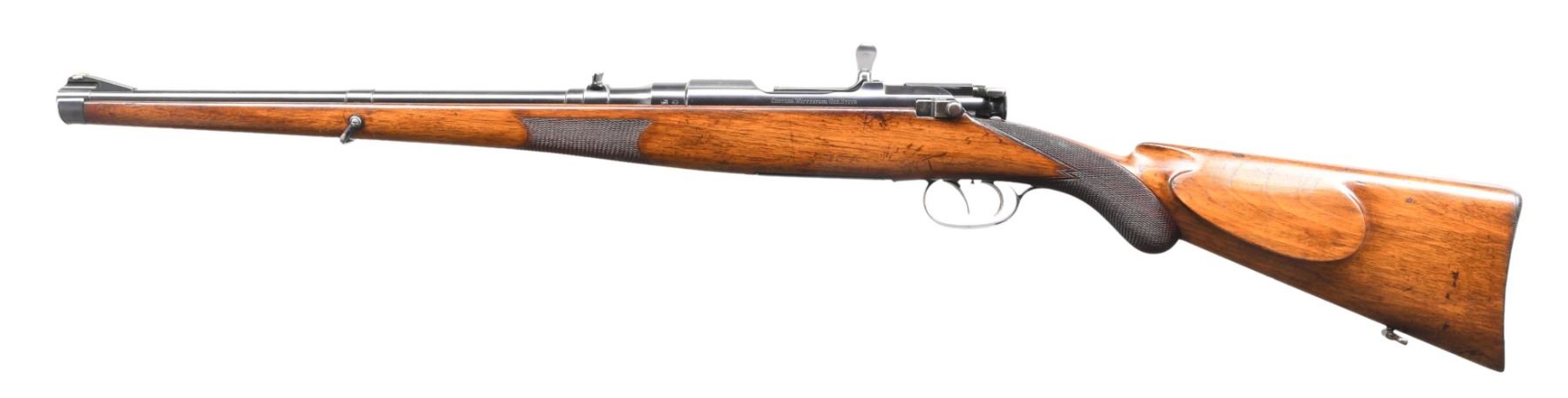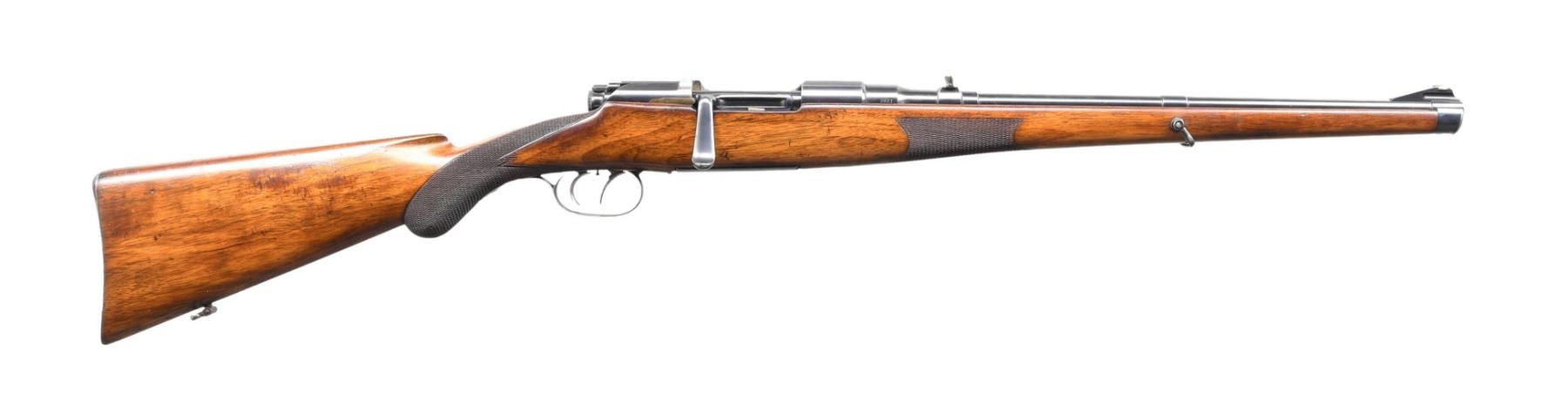 CARBINE. Cal. 65x54mm MS. S# 3651. Bbl. 17.7". Ramp mounted German silver bead front sight w/ express rear sight having 1 standing & 1 folding rear leaf. Butterknife bolt handle. Double set triggers. Full length mannlicher style cheekpiece stock. Features include hand checkering, steel nosecap, sling swivel loops & grooved steel cartridge trap buttplate. Bbl. has "Von Lengerke & Detmold, New York" import markings. MAGS: 1 detachable 5 rd rotary. UNATTACHED ACCESSORIES: 4 piece cleaning rod held in stock compartment. CONDITION: 95% blue showing light carry wear. Original stock finish shows spots of wear w/ scattered scratches & marks. Very good bright bore. Sound action & triggers. (24-4592/DS). CURIO. $1,500-2,500.