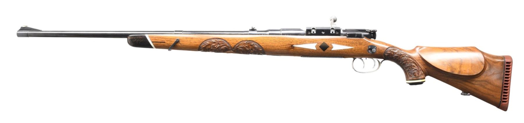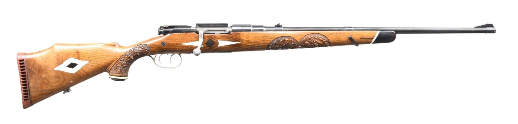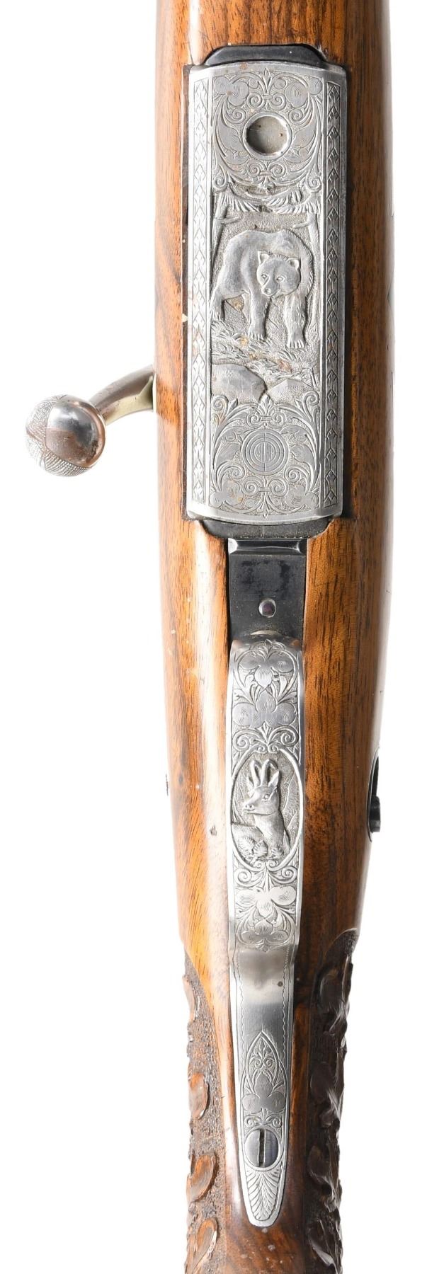 Cal. 270 Win. S# 3249. Bbl. 24". Ramp mounted German silver blade front sight w/ island mounted express rear sight having 1 standing & 1 folding leaf. Left side of action has a QD scope base. Action features double set triggers, round knob bolt handle w/ wing type bolt safety & Greener style side safety. Floorplate has deep relief engraved Grizzly, trigger guard bow has deep relief engraved antelope. Figures are surrounded by full coverage vine type foliate scroll engraving w/ punch dot backgrounds & wide borders. Complimentary engraving continues to the bolt handle & knob. Monte Carlo cheekpiece walnut sporter stock w/ sling swivels. Wrist & forearm have deep relief oakleaf carving. Bottom of forearm, area behind bolt & sides of stock along the action have white & black geometric inlays. Rosewood forearm tip & hard rubber gripped cap w/ white spacers. Bottom of forearm has an oval inlay w/ initials "REC". LOP: 13 5/8" over an aftermarket Hawkins pad. MAGS: 1 detachable 4 rd rotary. WEIGHT: 7 lbs, 14.2 oz. CONDITION: over 90% bbl. & action blue. Floorplate & trigger guard have lightly worn "in-the-white" finish. Stock shows light wear w/ scattered scratches & marks having an open grain check at top of butt behind the Monte Carlo comb. Very good bore. (24-4162/DS). CURIO. $700-1,100.