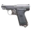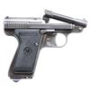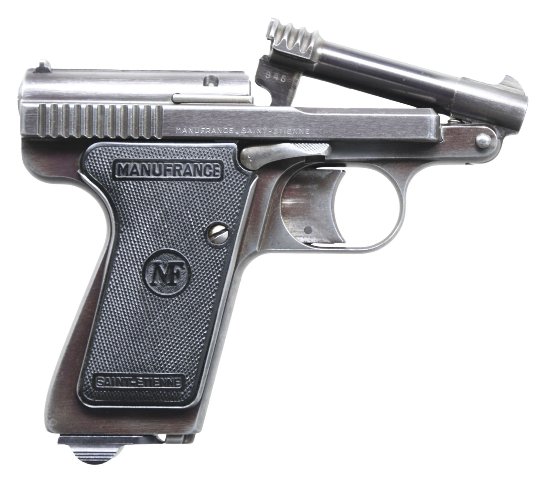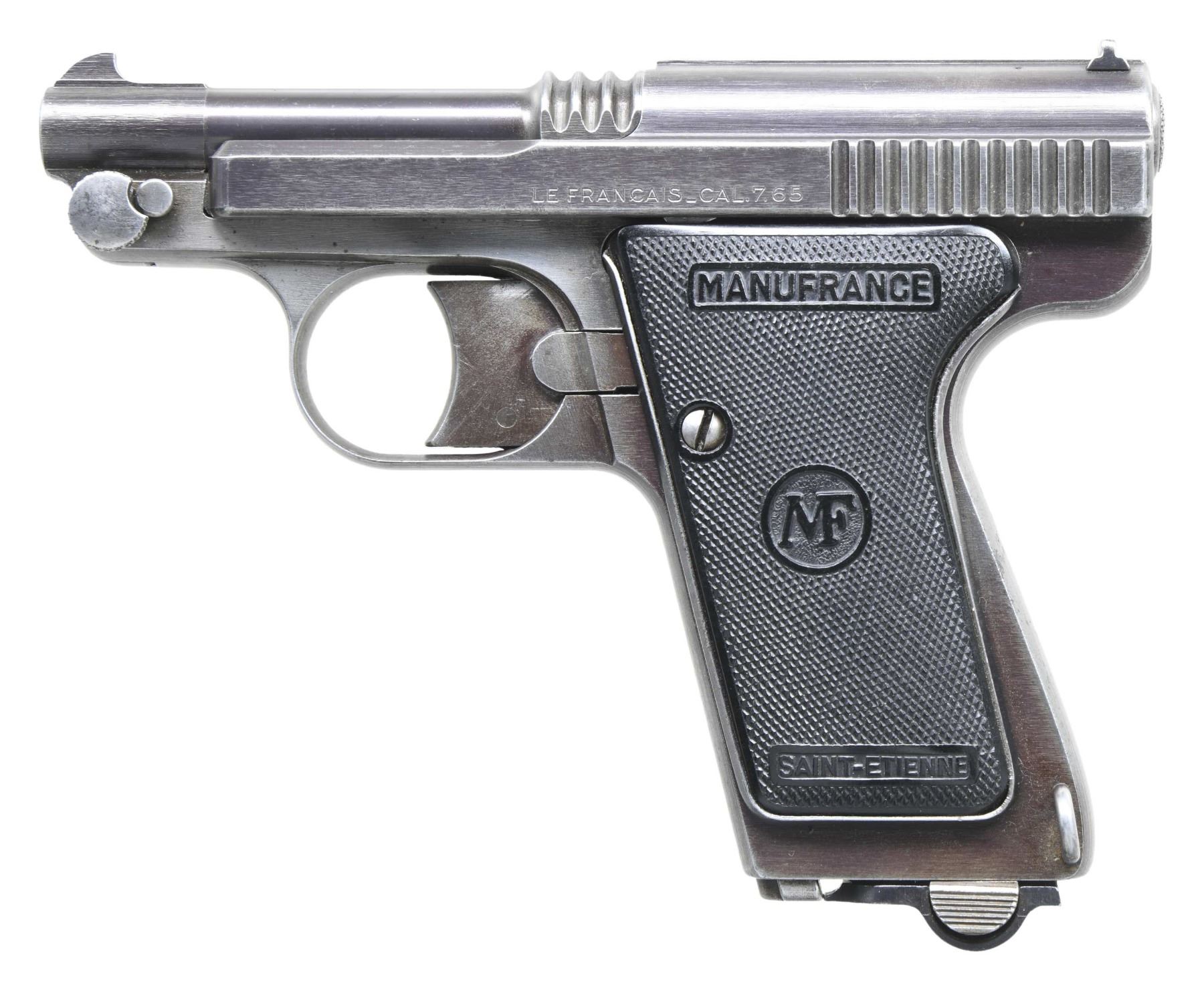 PISTOL. Cal. 7.65mm. S# 2886. Bbl. 3 1/4". Unusual double action blowback pistol that is immediately recognizable by virtue of its unique profile, tip-up bbl., and mag. release button mounted on the mag. itself. Pistol has a fixed shark's fin front sight and drift adj. rear sight. Shallow matted rib marked "LE FRANCAIS". Left side of slide marked "LE FRANCAIS-CAL. 7.65". The right side of slide marked "MANUFRANCE-ST. ETIENNE. The tip bbl. lever is on the right side. Fitted with black plastic grips. Each panel molded with the word "MANUFRANCE", the "MF" logo and its location in St. Etienne within a bordered checkered field. Fixed lanyard ring on left frame. Unique mag. release mounted on base of mag., the body having an exaggerated oval viewing window similar to the early Beretta pistols. Removal of the mag. will automaticly disengage and tip the bbl. forward to disclose the S# struck on the left side of the bbl. lug. MAGS: 1 approx. 8-rd. CONDITION: approx. 60% original finish with most of the salt blue having faded or worn from the frame. VG+ grips and near excellent mag. Mirror bright bore. Correct manual mechanics. One of the most unusual 7.65mm pistols. (25-3475/LMA). CURIO. $1,000-1,500.