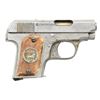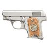 Cal. 6.35mm. S# 345924. Bbl. 2 1/8". Unique Model 10 semi-automatic pistol mfg. by Manufacture d'Armes des Pyrenees (MAPF). Left side of the slide is marked with MAPF's mfg. information and the cal. designation. Metal components exhibit a nickel-plated finish overall. Frame is mounted with 2-piece brown grips, which feature the Unique logo at the center. MAGS: one 6-rd. CONDITION: metal components retain large amounts of their period-applied nickel finish, exhibiting some areas of flaking that show through to dark oxidation. Bore exhibits a large area of dark pitting while retaining fair to good rifling throughout. Grips exhibit extensive cracking, chipping, and losses overall. PROVENANCE: from the lifelong collection of Bill Peterken. (24-6076/MLW). CURIO. $75-125.