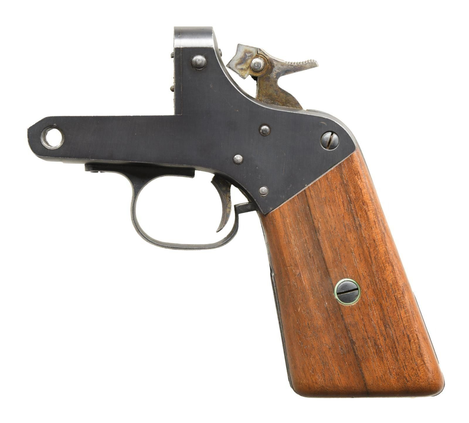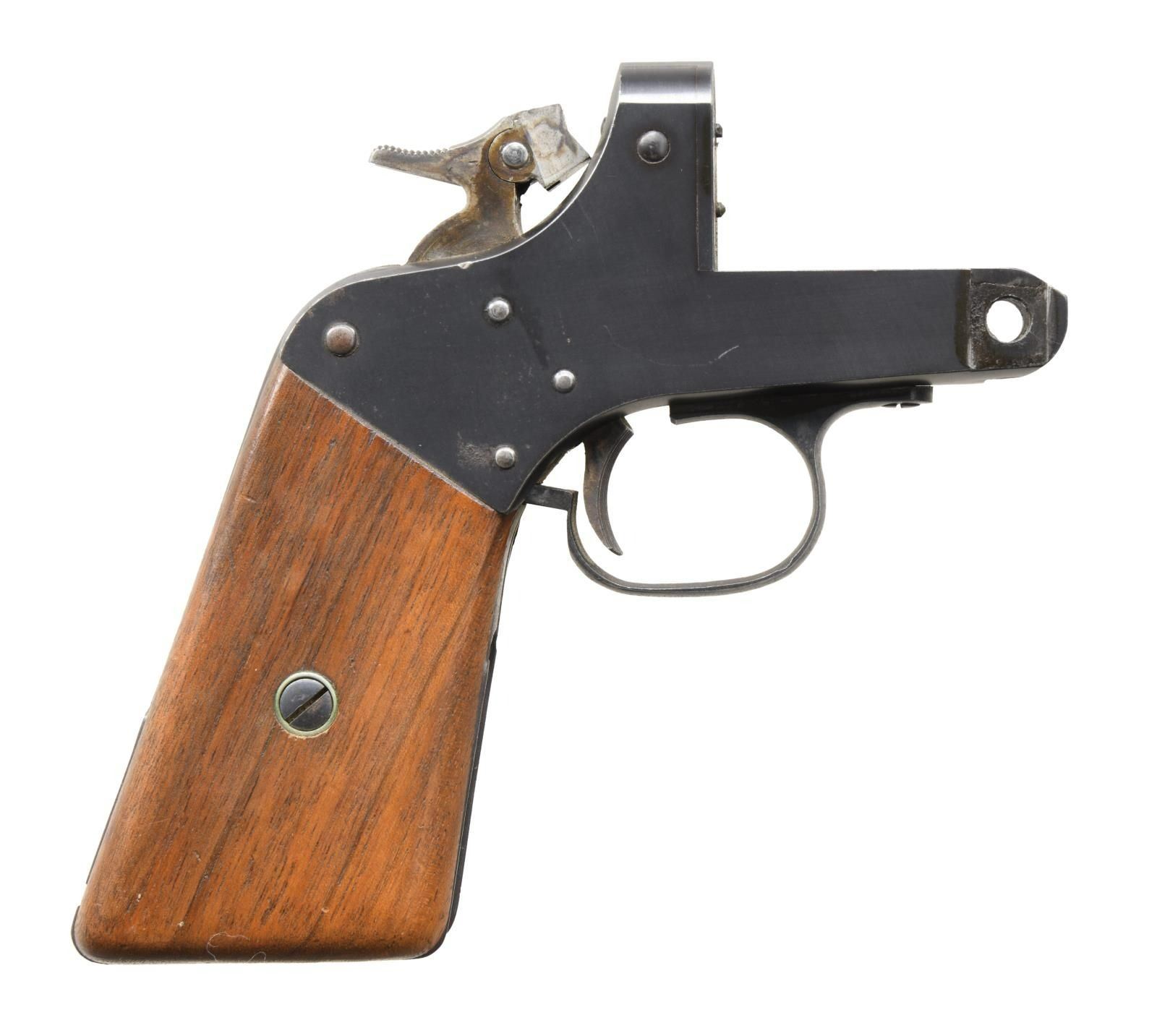 Cal. N/A. S# 12557. Bbl. N/A. This lot consists of a Marble's Gamegetter frame, hammer, trigger, tirgger guard & hardwood grip. CONDITION: grips show light dings & handling wear. Metal retains much of its blue & case colors w/ some light fading & light oxidation. (01-24575/MJC). MODERN. $300-400.