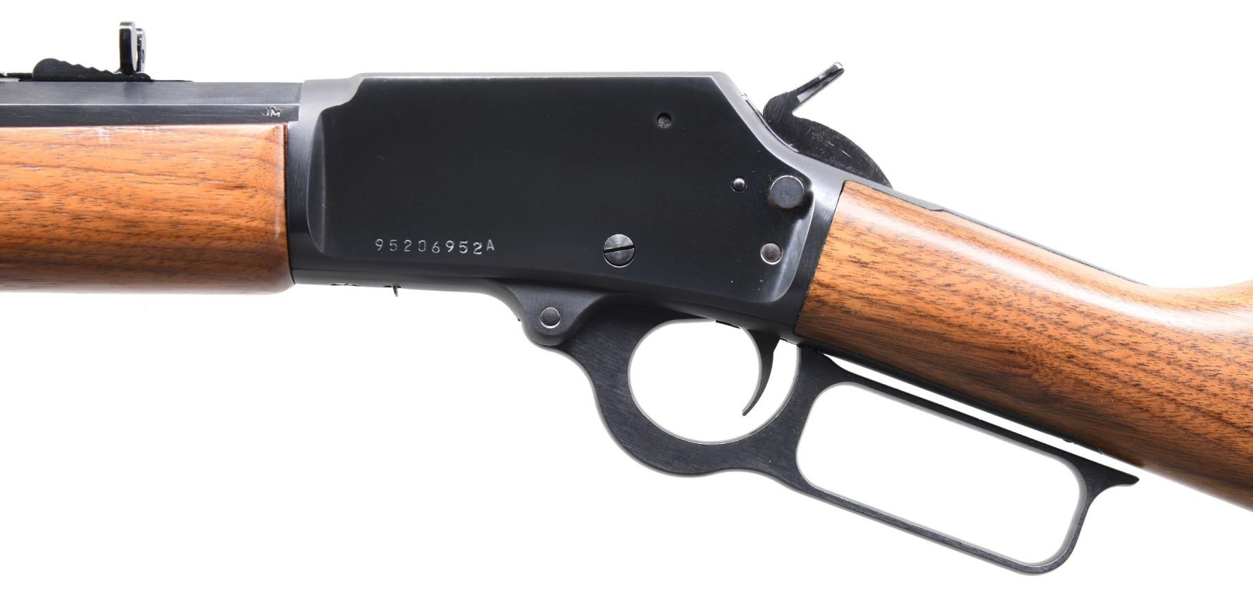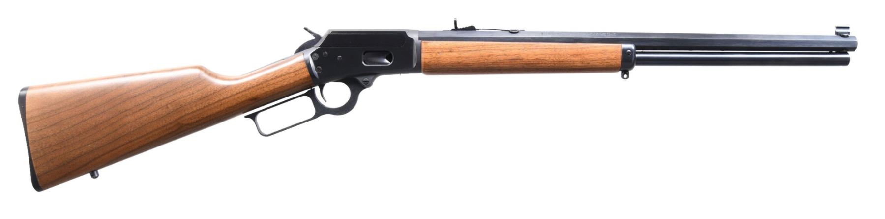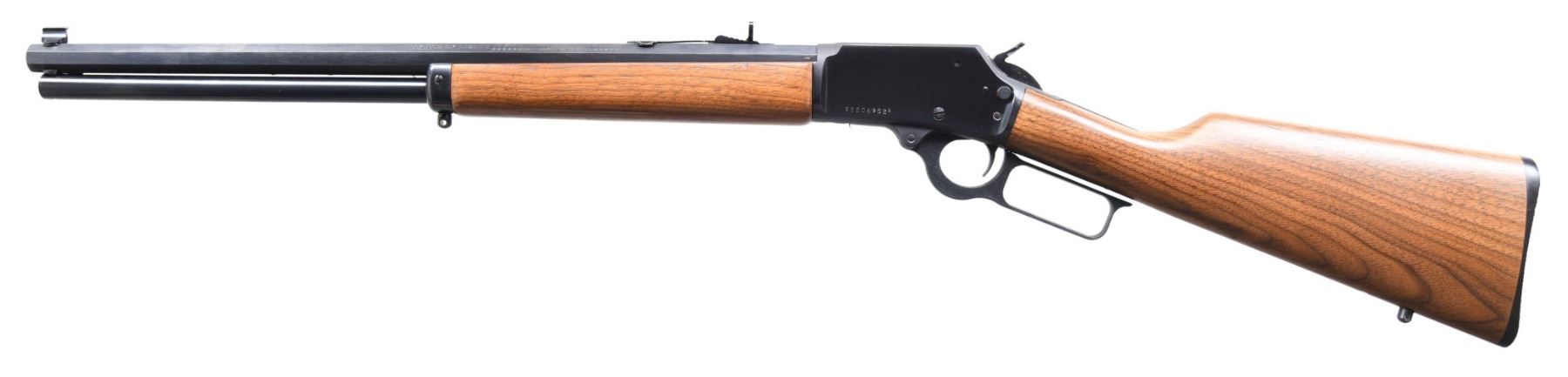 Cal. 45 Colt. S# 9506952A (2005). Oct. 20" barrel w/ "JM" proof. Tall bead front sight & Marbles style elevator rear sight. Drilled & tapped CBS action. Walnut stock set with sling studs, "bullseye" & Marlin buttplate. CONDITION: all aspects near excellent including bore. PROVENANCE: Lifelong Collection of Bill Peterken. (24-6033/MD). MODERN. $700-1,100.