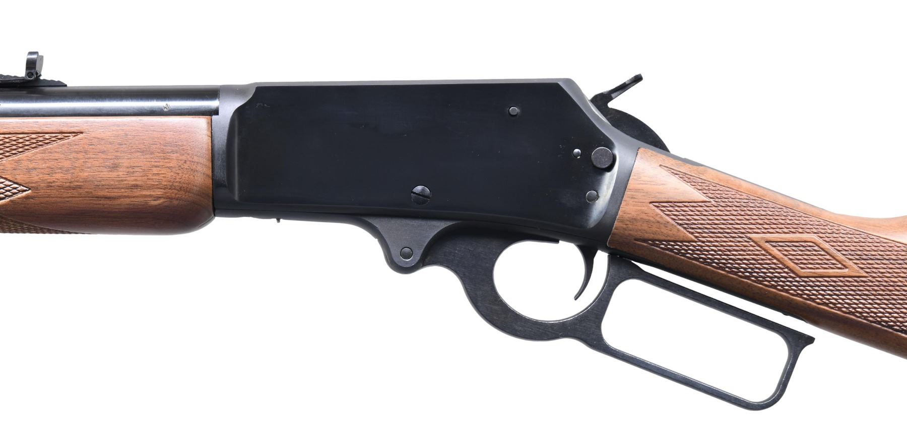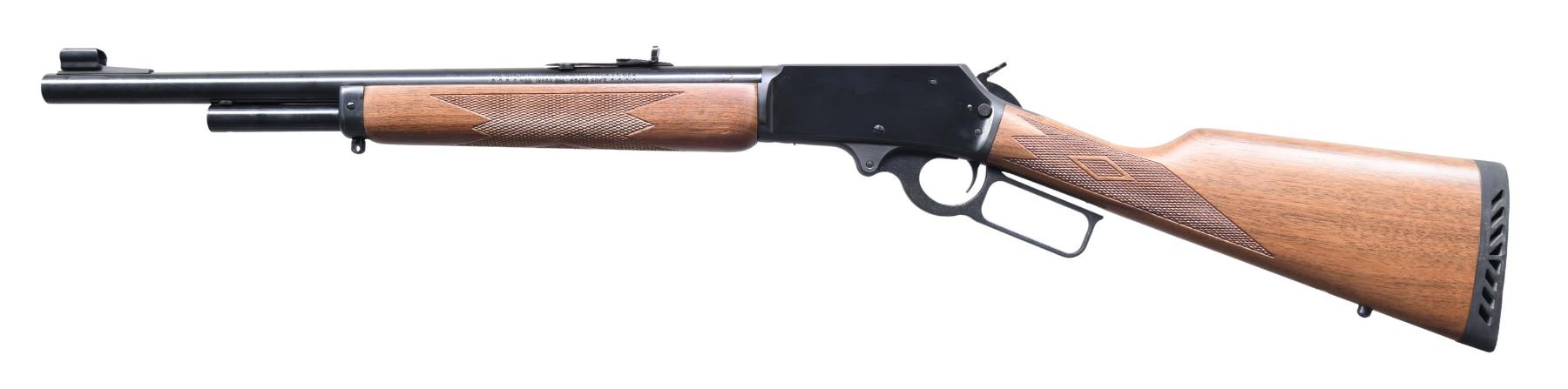 BOX. Cal. 45-70. S# 93038382 (2007). Bbl 18.5". Hooded bead front sight and folding elevator rear sight. Crossbolt safety. Checkered walnut stock with black ventilated pad. UNATTACHED ACCESSORIES: matching box with packaging. CONDITION: all aspects are near excellent, including bore. (24-3636/MD). MODERN. $500-800.