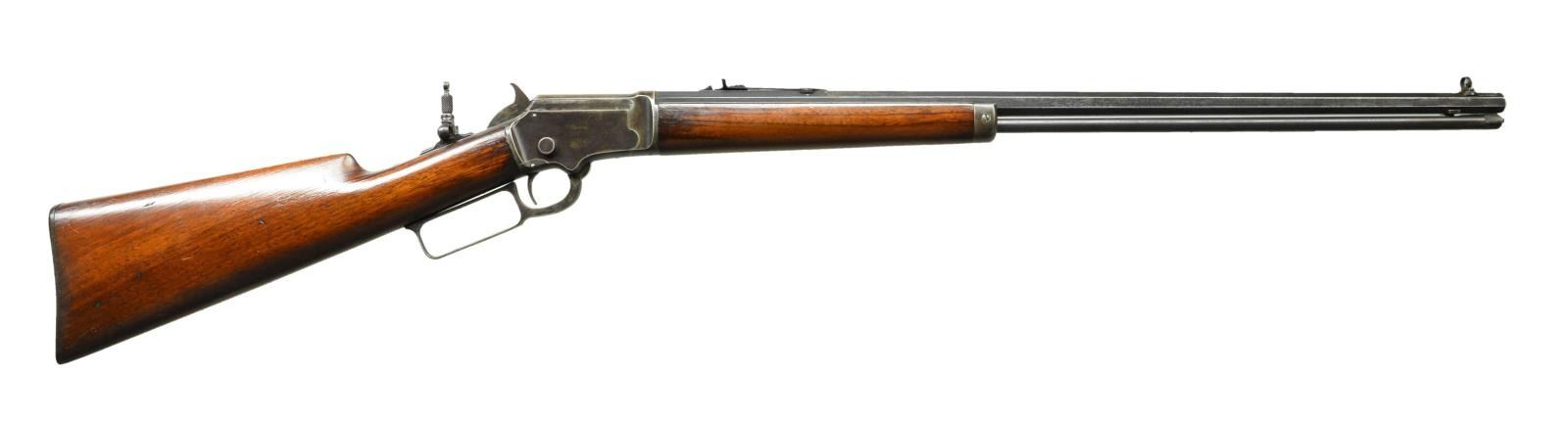 Cal. 22 RF. S# 225648. Bbl. 24" tapered octagon with Beech Combination front sight and standard V notched elevator adjustable rear. Mfg. 1901 (1892-1916) having added Lyman No. 1 second variation tang sight. Predecessor to Model 39 having round top receiver with "MARLIN SAFETY" marking. CONDITION: good to very good overall appearance with refinished stock having top portion of hard rubber buttplate proud of wood; no other compromises. Areas of peppery oxidation (mainly on barrel). Faded case colors with grey tone. Fair to good bore with wear and cleaned, even light pitting; distinct rifling and serviceable. PROVENANCE STATEMENT: Estate collection of Thomas F. Wolfinger. (22-6111/NW). CURIO. $500-750.